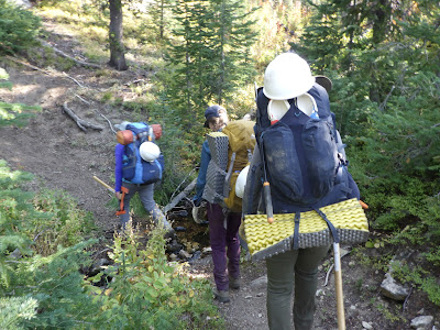 Packs were dropped and we discussed what the best tool for the job might be – should we hack off the protruding branches? If so, a silky saw or a pulaski? After some consideration, we went with the power of feet. Eight women sat on the ground and we braced our legs against the deadfall, giving a mighty push at the count of 3. One push, two push, three push! The tree, and its limbs, was scooted nicely off the trail.