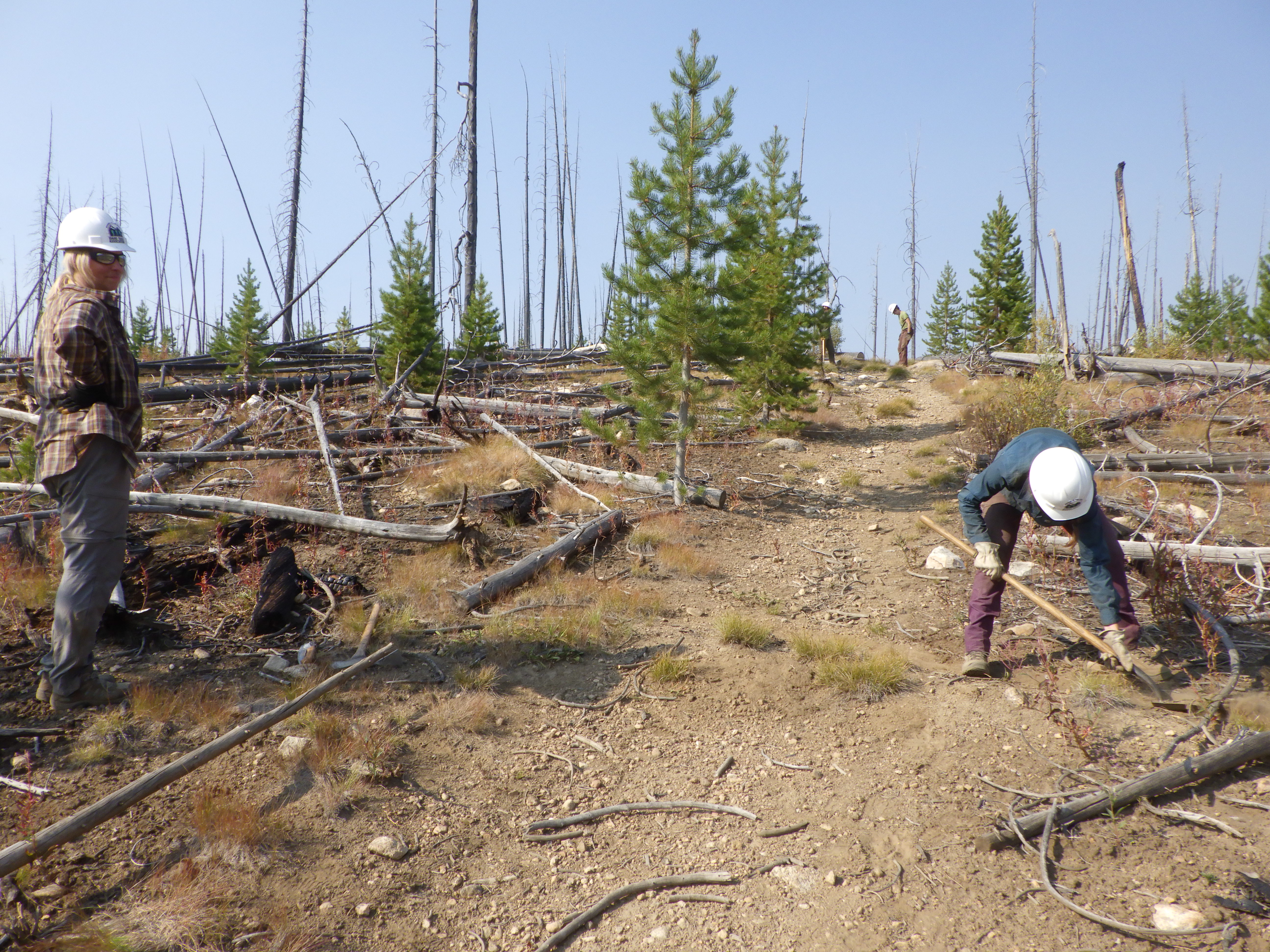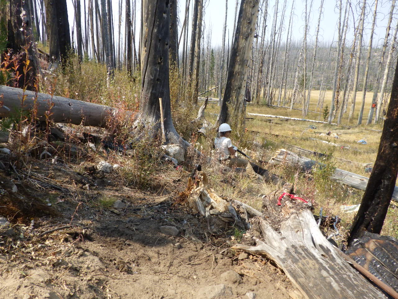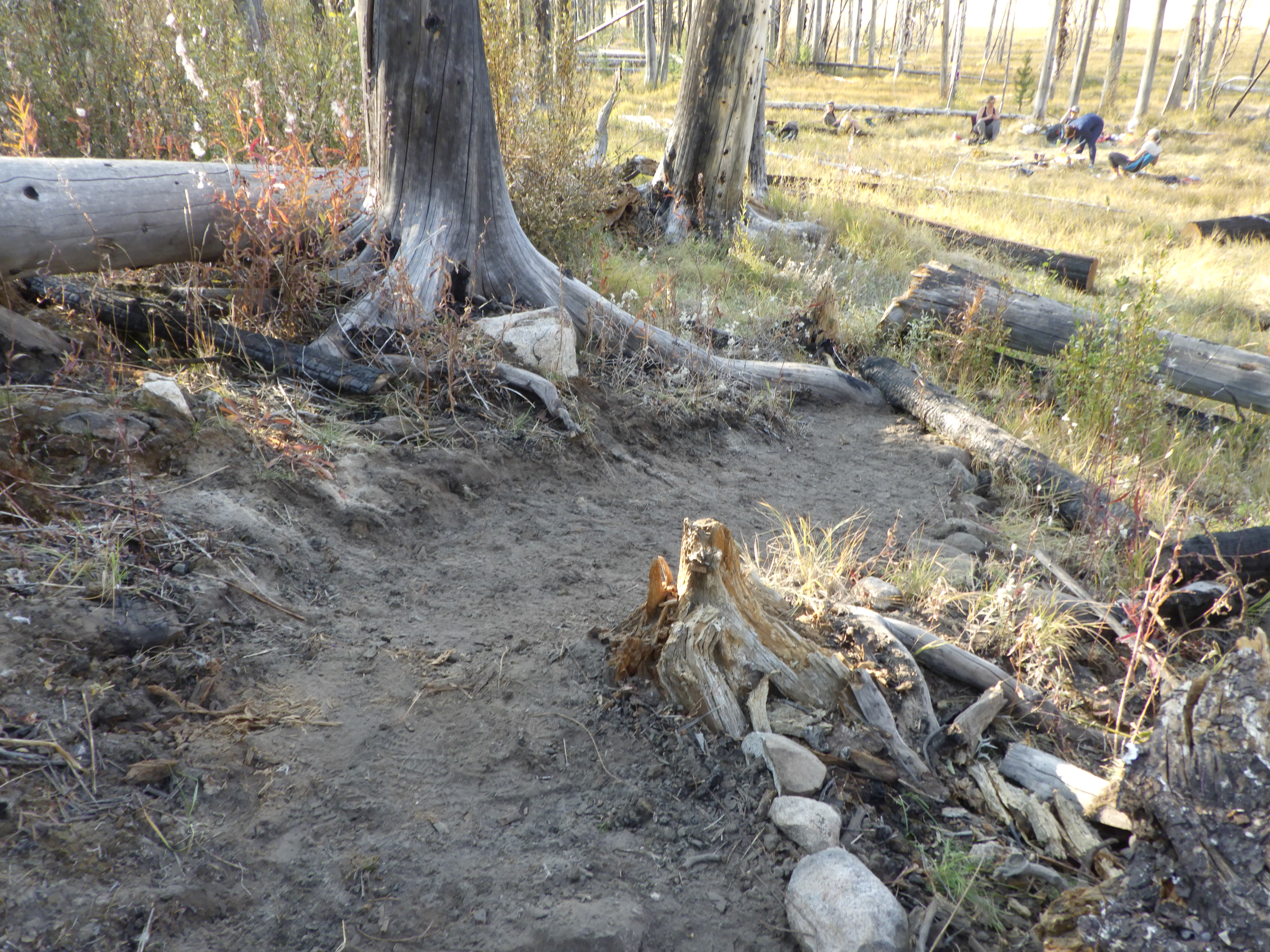 Near the meadow, we completely reworked the trail. Essentially, we created trail where none was before, because there was no indication remaining of where the trail had been originally, before the fire. One woman actually had a GPS with the old map’s route, but we couldn’t overlay that onto the current terrain.