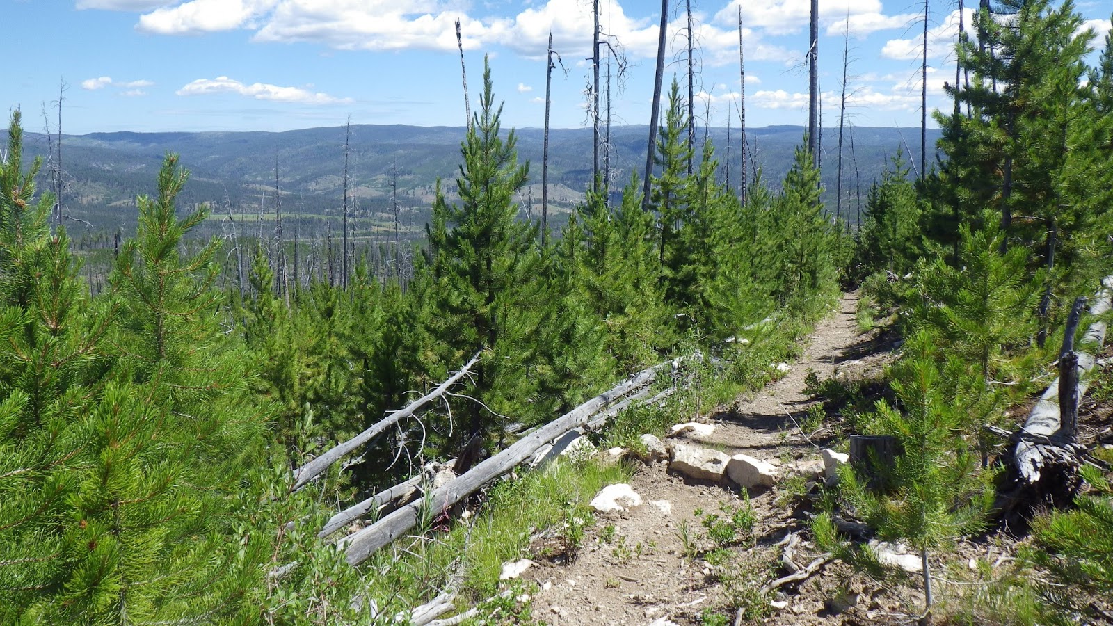 | In the distance here, the naked eye can just make out a bump on top of a distant mountain. That bump is the lookout atop Sheepeater Mountain. |