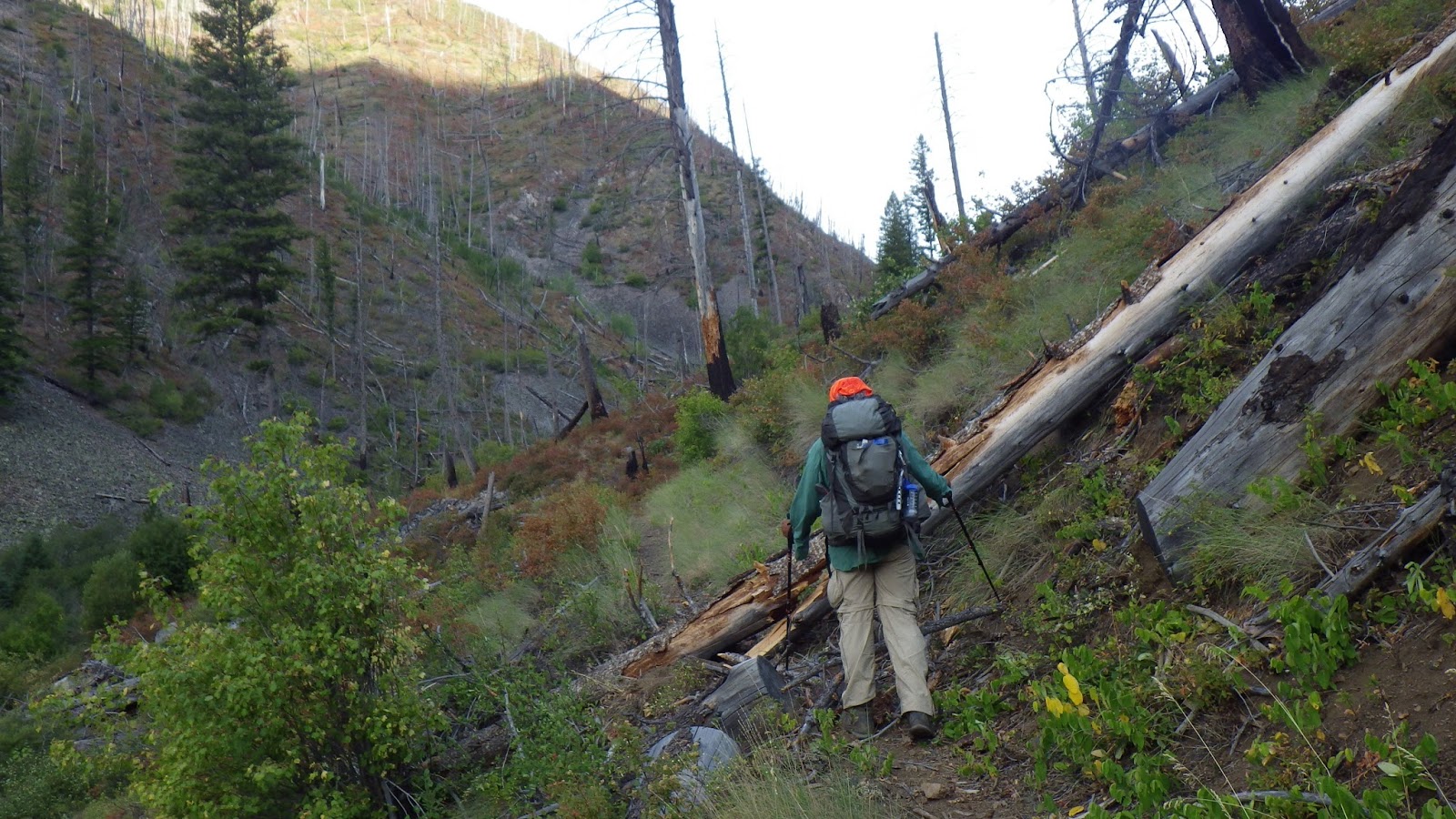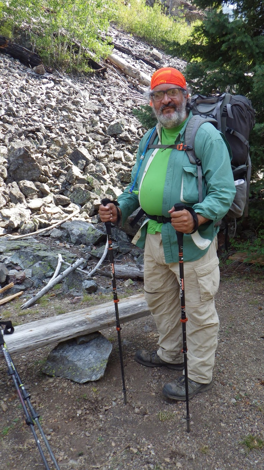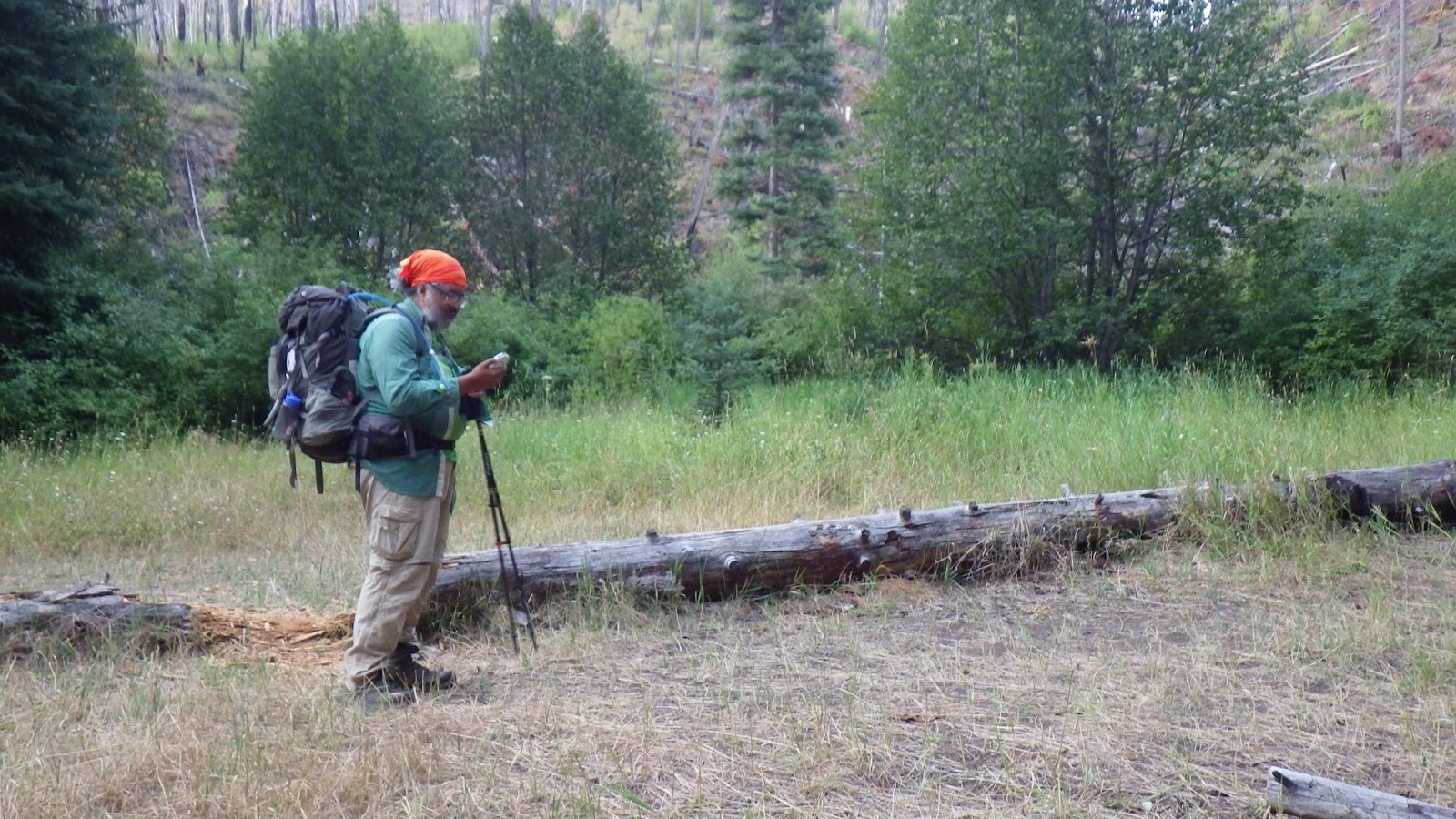 After passing a few ‘desperation’ sites that were really too tilted to be used, we stopped and dropped packs. I dropped mine by a burned log and a bush, Ambrose took a different log, no bush. I took our water bags down to the water, descending maybe 30 feet to get to the water. The flat spot near the water was squishy wet, no good for camping. But the water was accessible and I brought the bags up to be filtered into our hydration bladders. I lost my way a bit coming back up, but found Ambrose after he called out to me.