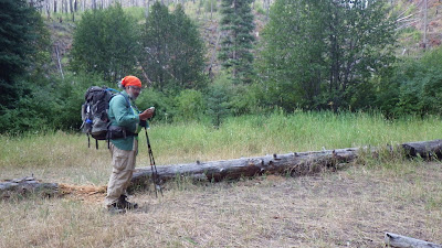 Because of this, or because there were no bears in the area, we saw no bears as we continued to wind around and up the creek canyon towards our night’s campsite. According to the guidebook, where Beaver Creek neared Hand Creek there was a nice site with room for ten to twelve tents. I was looking forward to that.