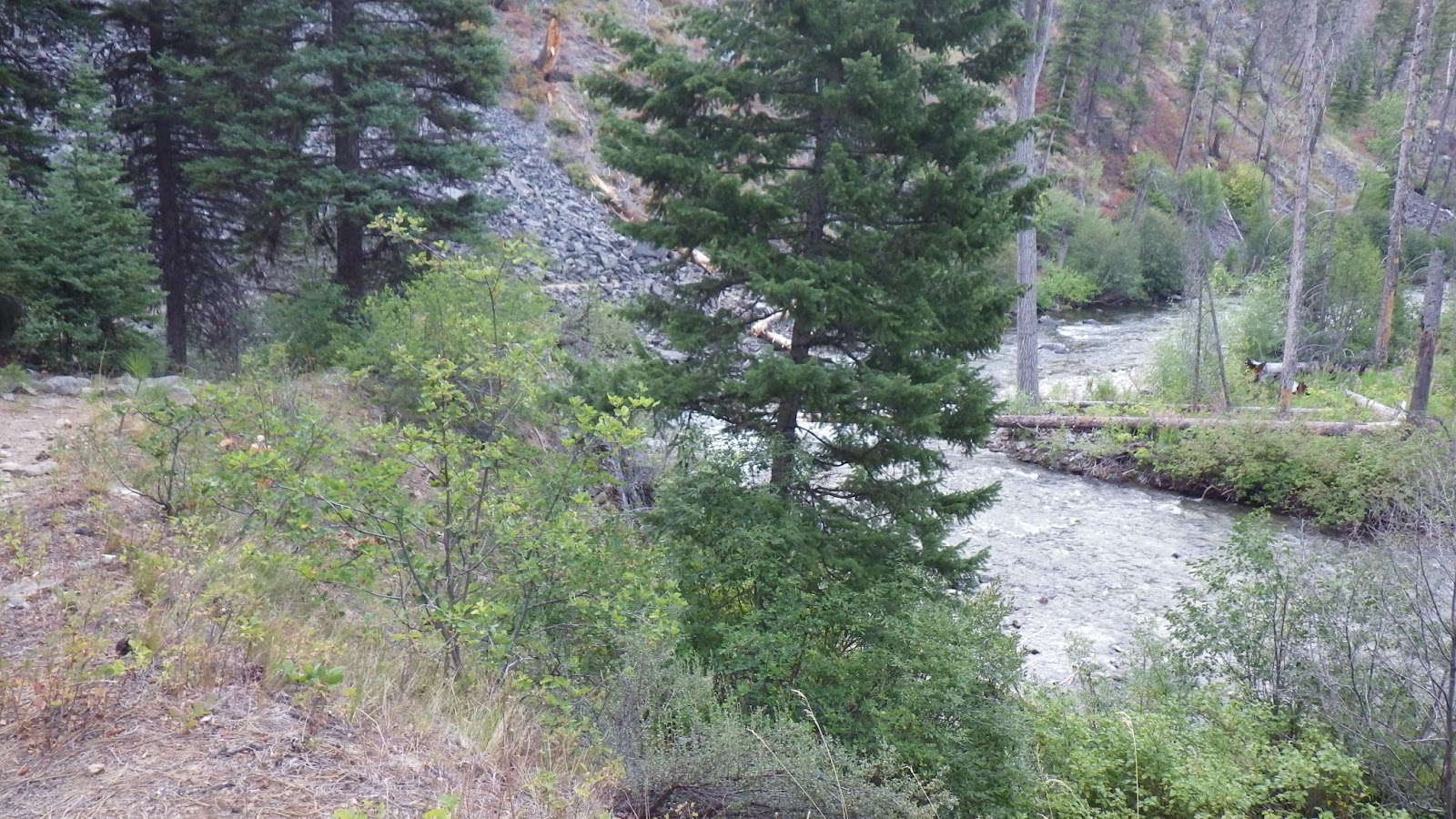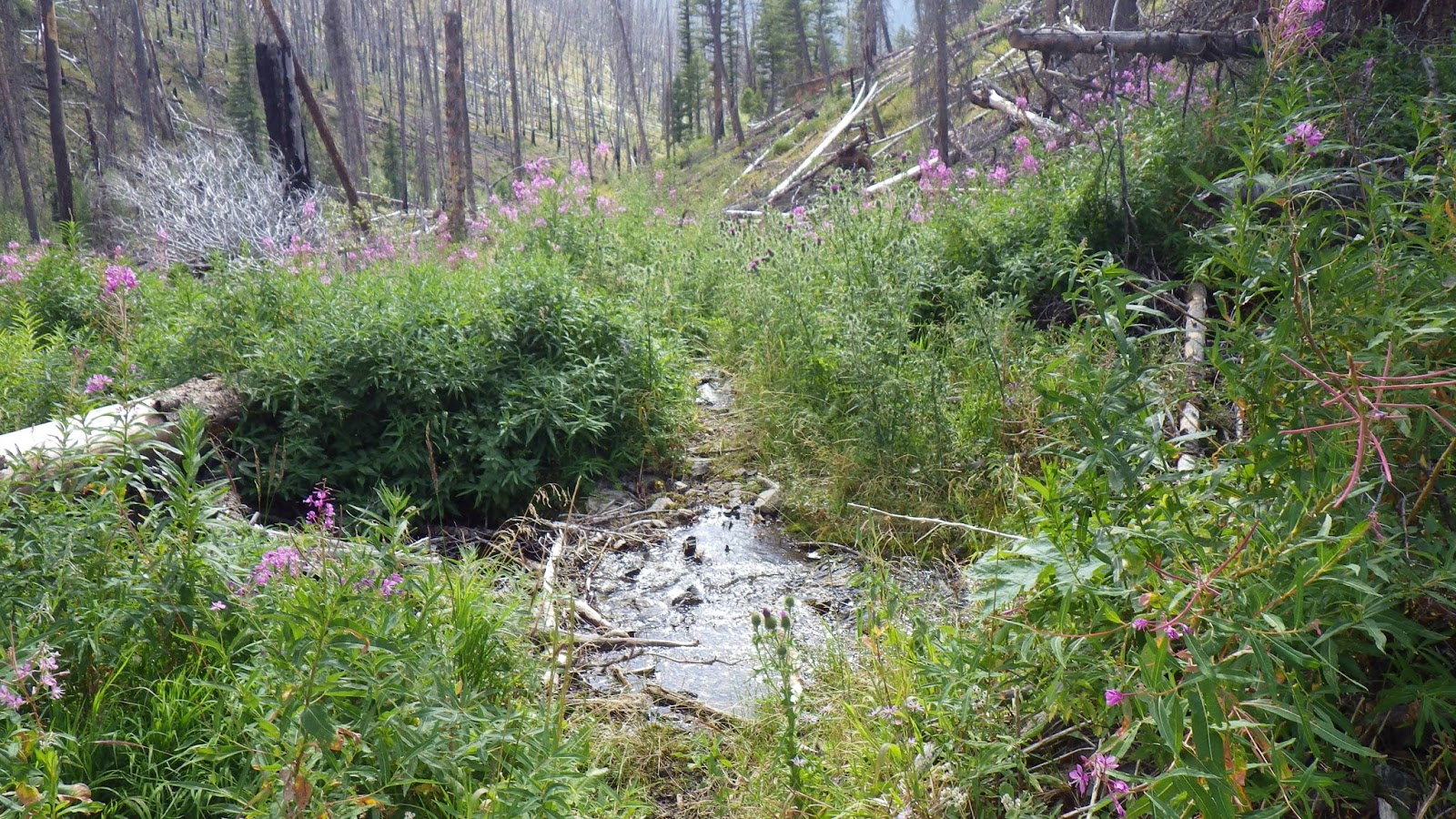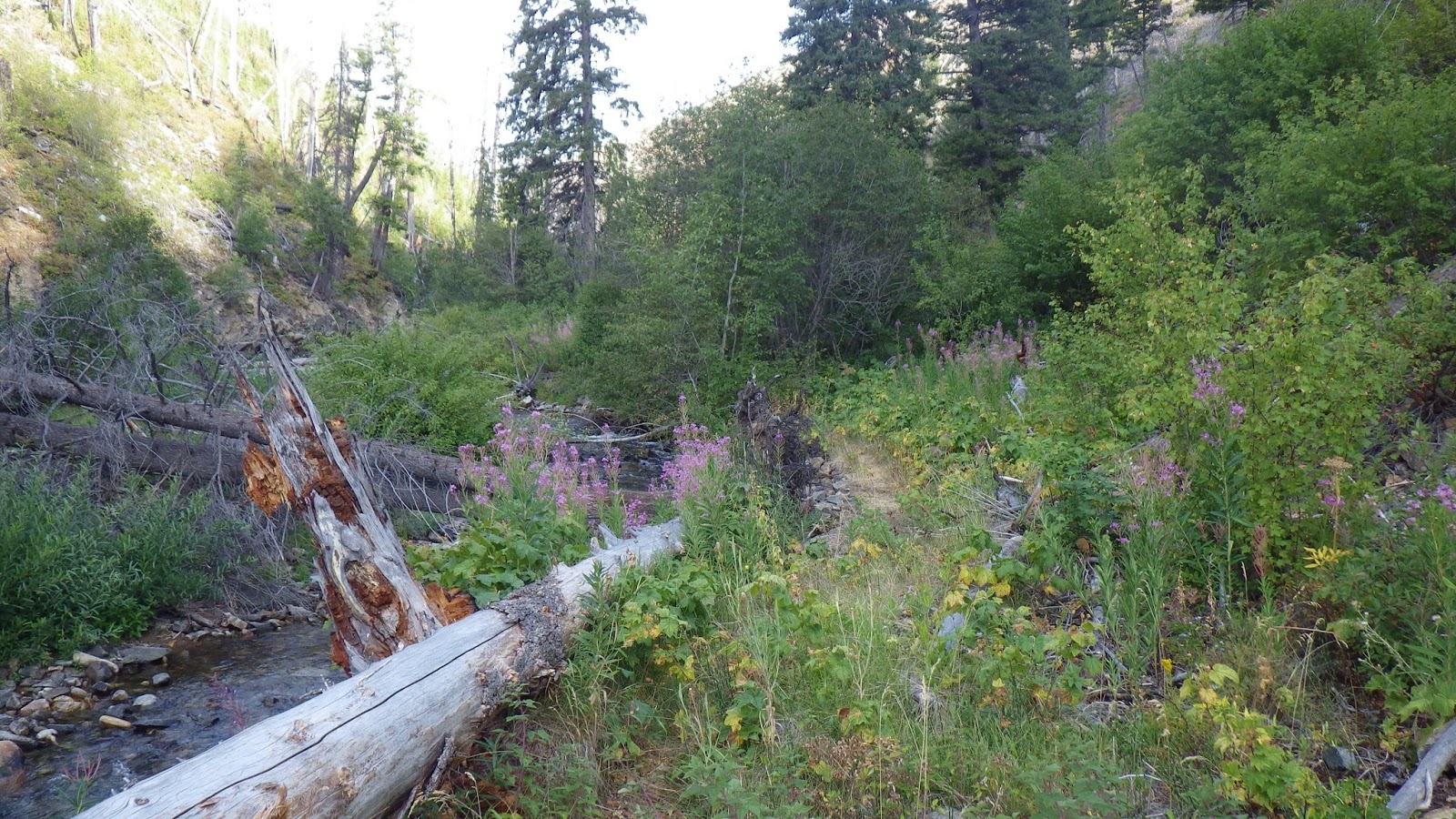 When I reached the side stream, I felt despair. There was nowhere to camp. The water was surrounded by bushes and brush, the land was steep. I dropped my pack and walked on, hoping to find some place that I might make do, but not wanting Ambrose to keep walking unless I found it.