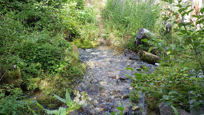 The trail moved back down to the level of the water and just as it was time for lunch, the next bridge came into sight. There was a perfect little place to eat just before the bridge. A plank was on the ground next to two rocks and we lifted it into place for a bench. I removed my boots and socks and set them to dry out in the sun while Ambrose got the water for our dessert lunch.