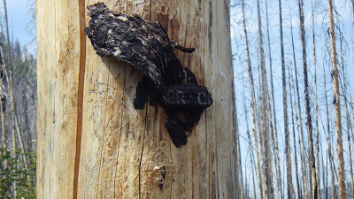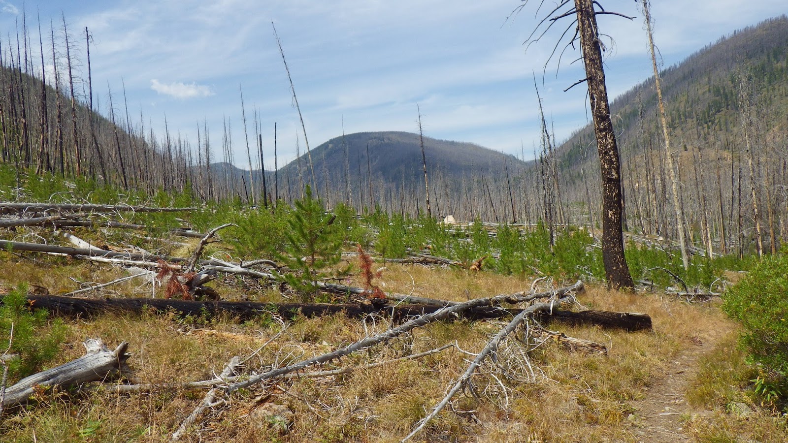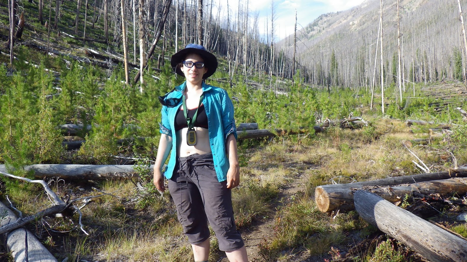 We hiked along for a 50 minute segment, keeping an eye out for a place to take a break in the shade. The sun was out and shining and hot. The trail offered very little in the way of shade. Most of the standing trees were just trunks, dead from an old fire. Plenty of bushes and little trees had started to reclaim the land, but they weren’t tall enough to shade us. I hoped that a place where the trail contoured into a gully would offer shade, but the only shade was up the gully and didn’t offer good seating. So we sat on the side of the trail, barely shaded by short trees and snacked.