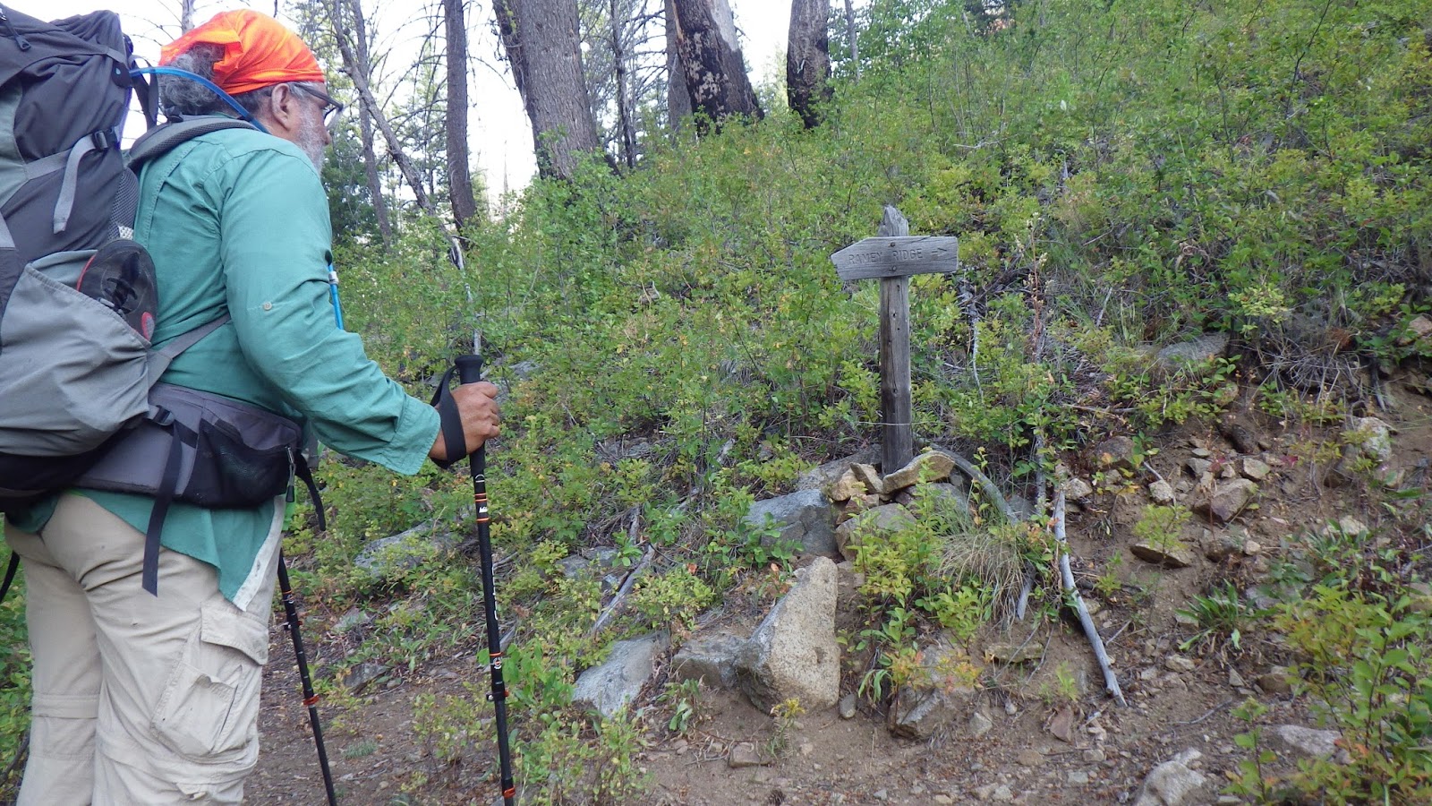 The next trail junction we reached was signed, pointing the way to Ramey Ridge. I couldn’t get a good idea of where that was because we didn’t have that map. Since we were only going to be on that map for a short stint, we hadn’t bought it. I had a printout of where we were going to be on the trail, and we would soon be back on the maps that we had brought, which were carefully folded in a gallon plastic bag which was in turn stowed in my map case for easy access.
