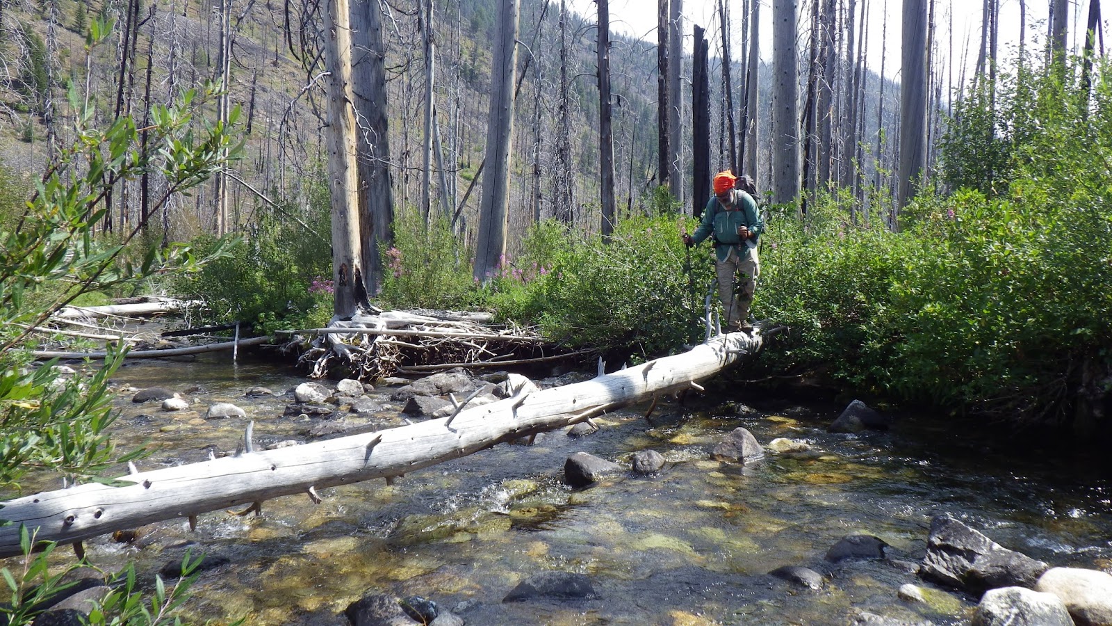 But first, we needed to cross Beaver Creek. No bridge provided. This was clearly a boots off crossing, but I just wasn’t in the mood to take my boots off. Lucky for me, there was a handy fallen tree. All I had to do was whack my way through some bushes, mount the tree on the slippery leaves of said bushes, and then balance my way across the suddenly quite narrow log.