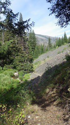 Watered up, we decided to keep going until we reached the next sidestream and hope for a site nearby. I hiked ahead, examining the ground around me for suitability. There were a few places down by the water that looked flat enough, but they were below the trail and could be too close to the water to be dry.