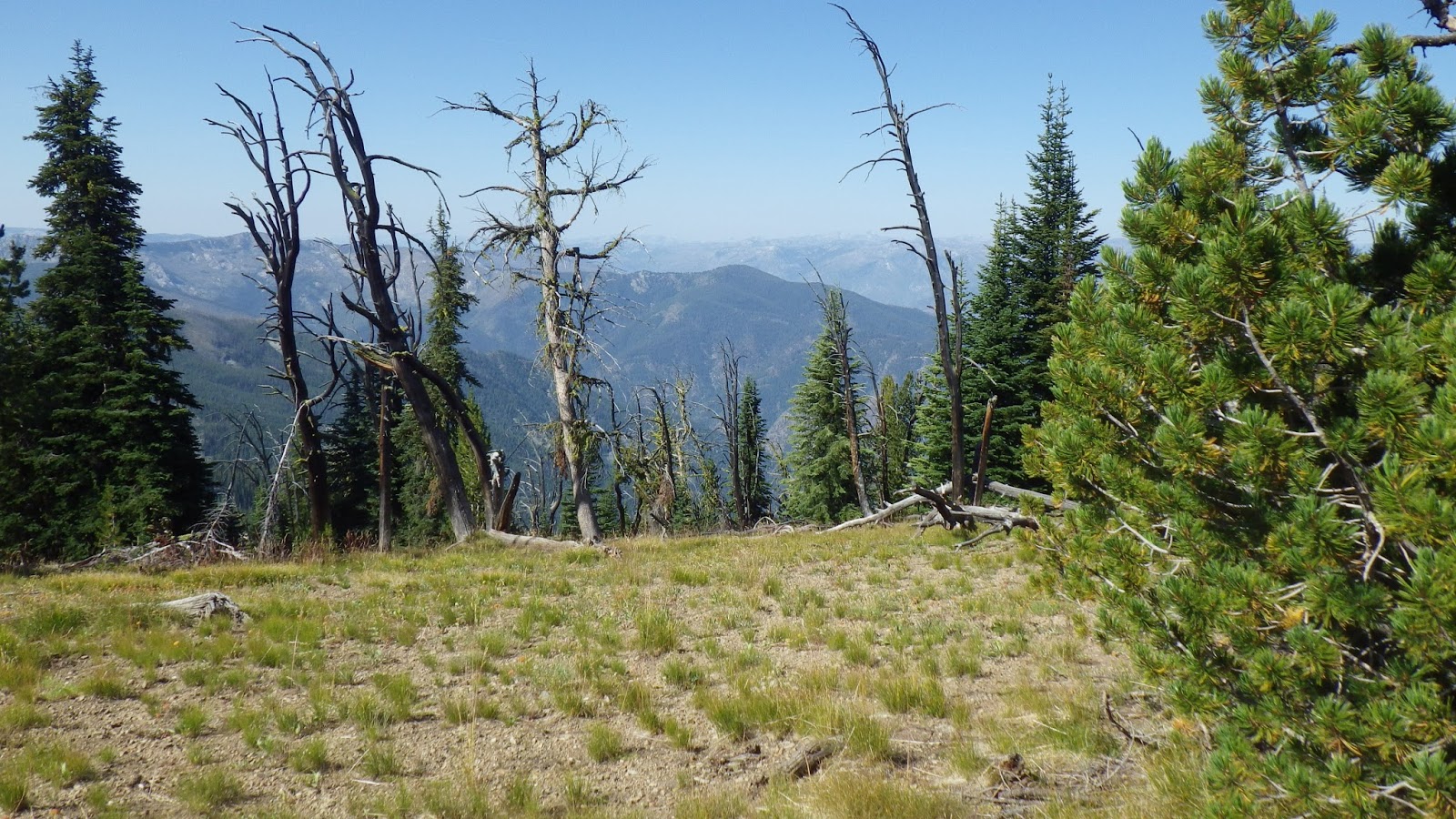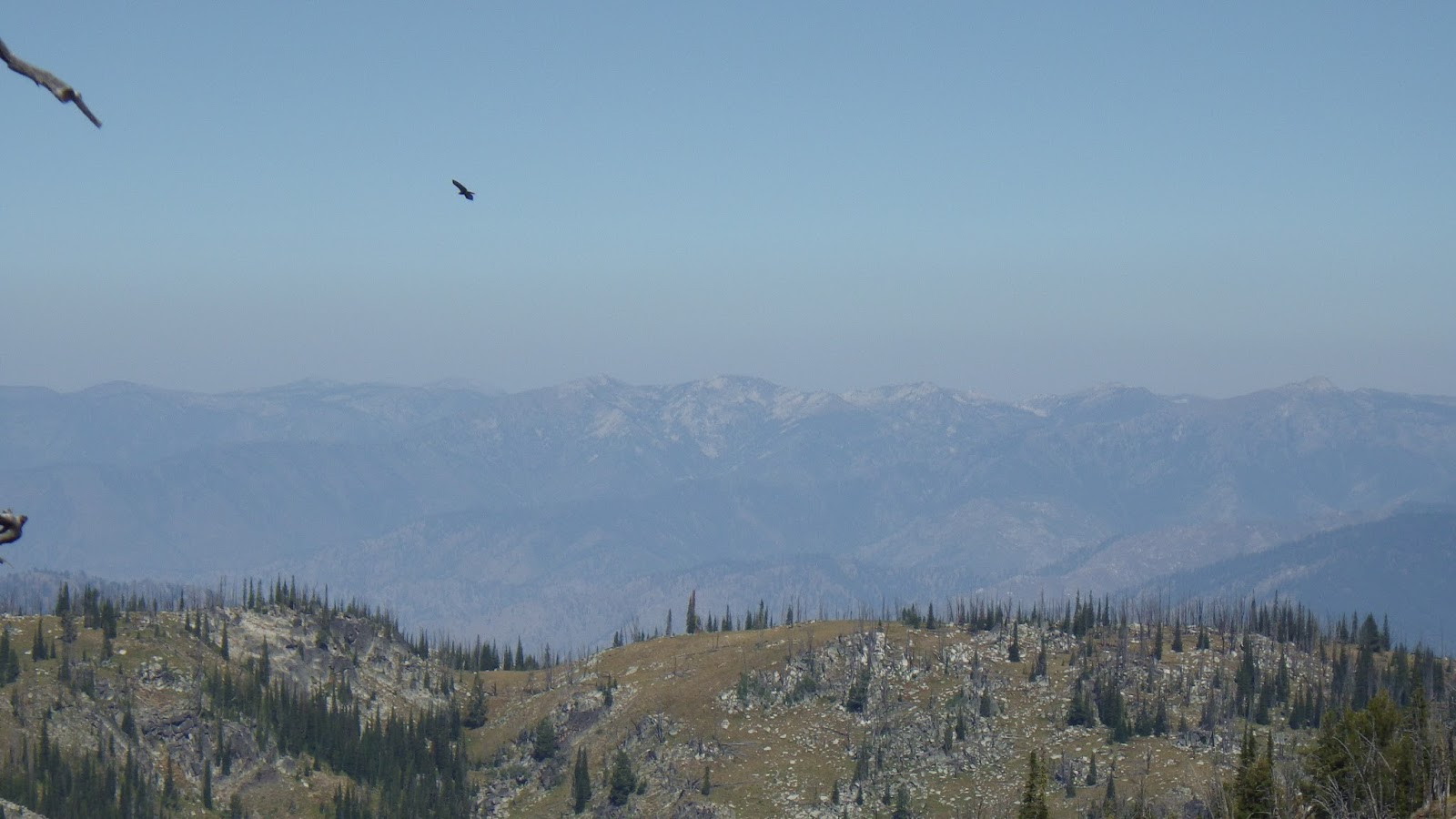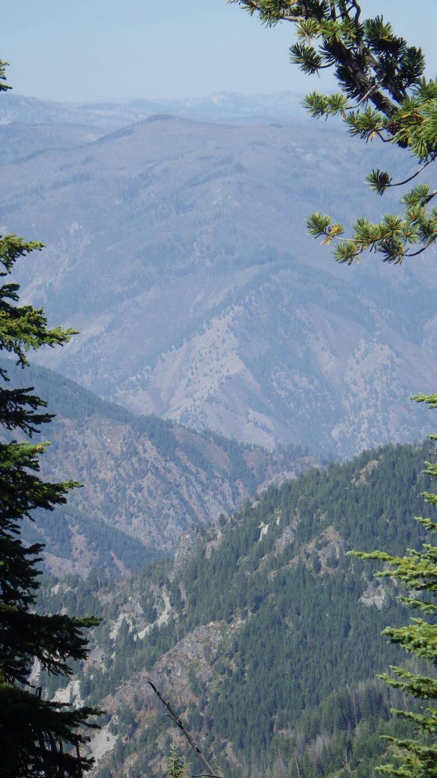 I was ahead of Ambrose at the next saddle, and I had to answer a call of nature. I made sure to leave my pack visibly on the trail and found my place for business with a wonderful view to the north. According to the guidebook, I should be able to see the Sheepeater Mountain Lookout from here, but either it was too hazy or I wasn’t looking in the right place. I didn’t see any sign of the lookout, but it didn’t matter. What I did see was gorgeous enough.