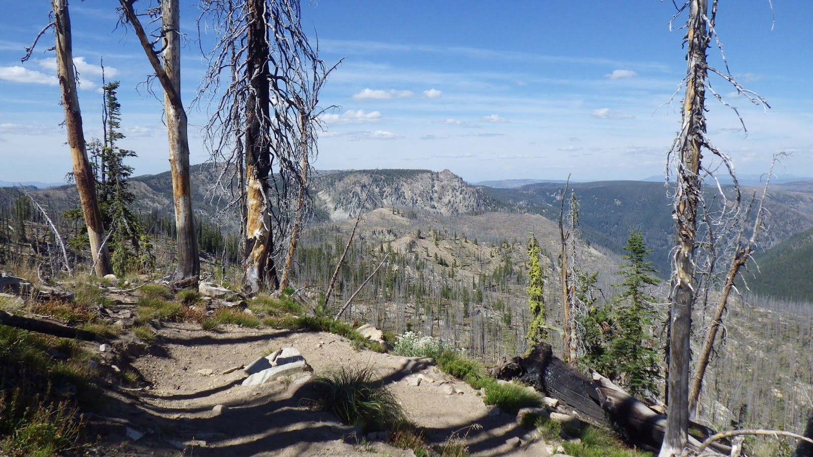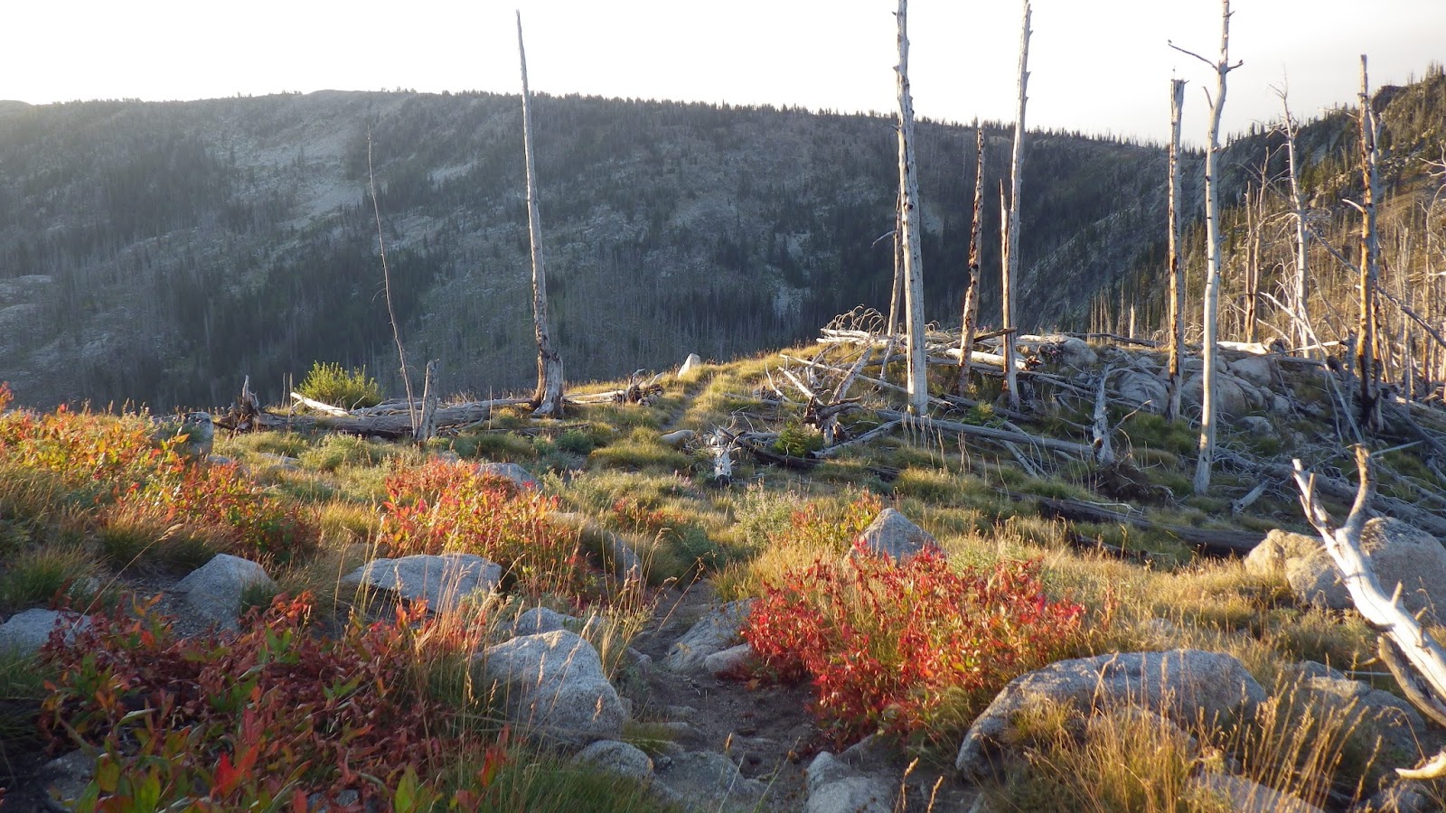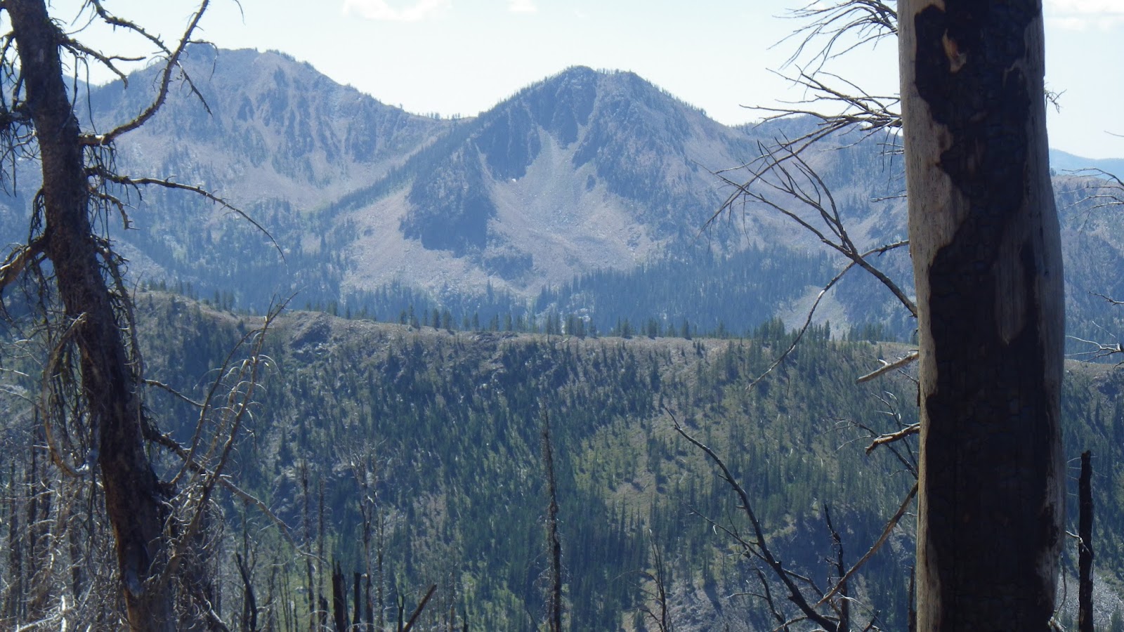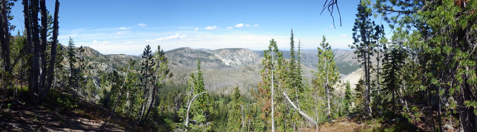 I was ahead of Ambrose at the next saddle, and I had to answer a call of nature. I made sure to leave my pack visibly on the trail and found my place for business with a wonderful view to the north. According to the guidebook, I should be able to see the Sheepeater Mountain Lookout from here, but either it was too hazy or I wasn’t looking in the right place. I didn’t see any sign of the lookout, but it didn’t matter. What I did see was gorgeous enough.