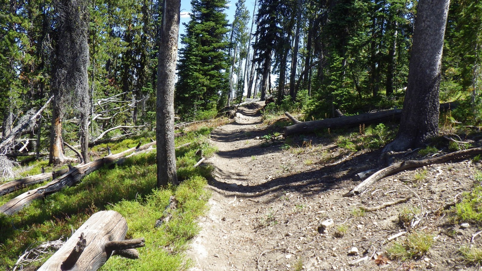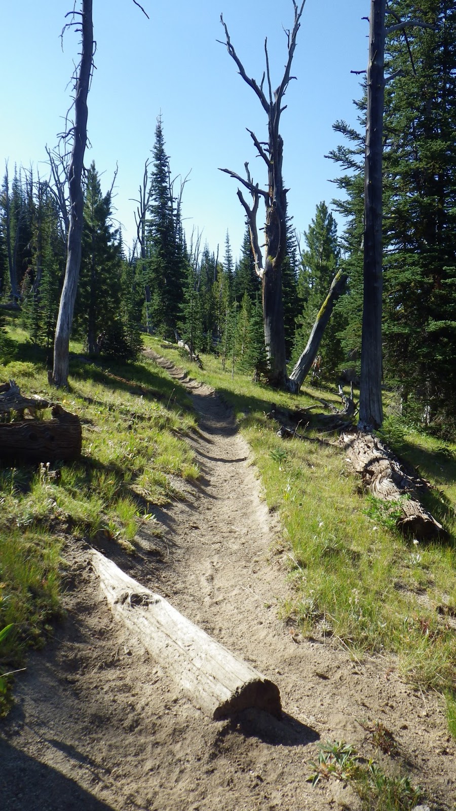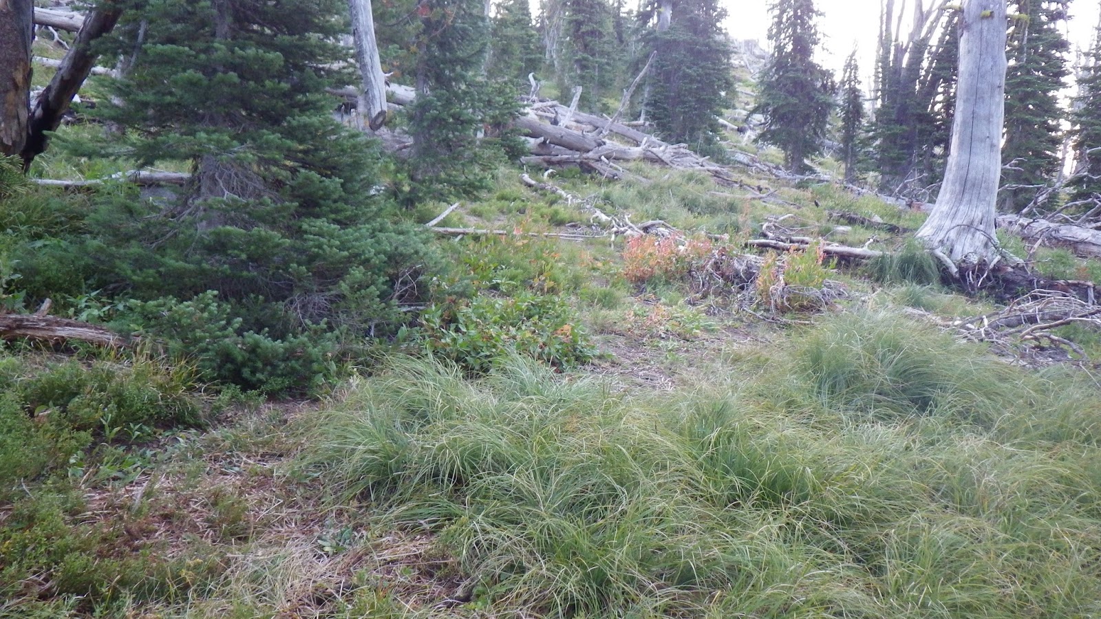 | Heading up through evergreens and old snags. |
