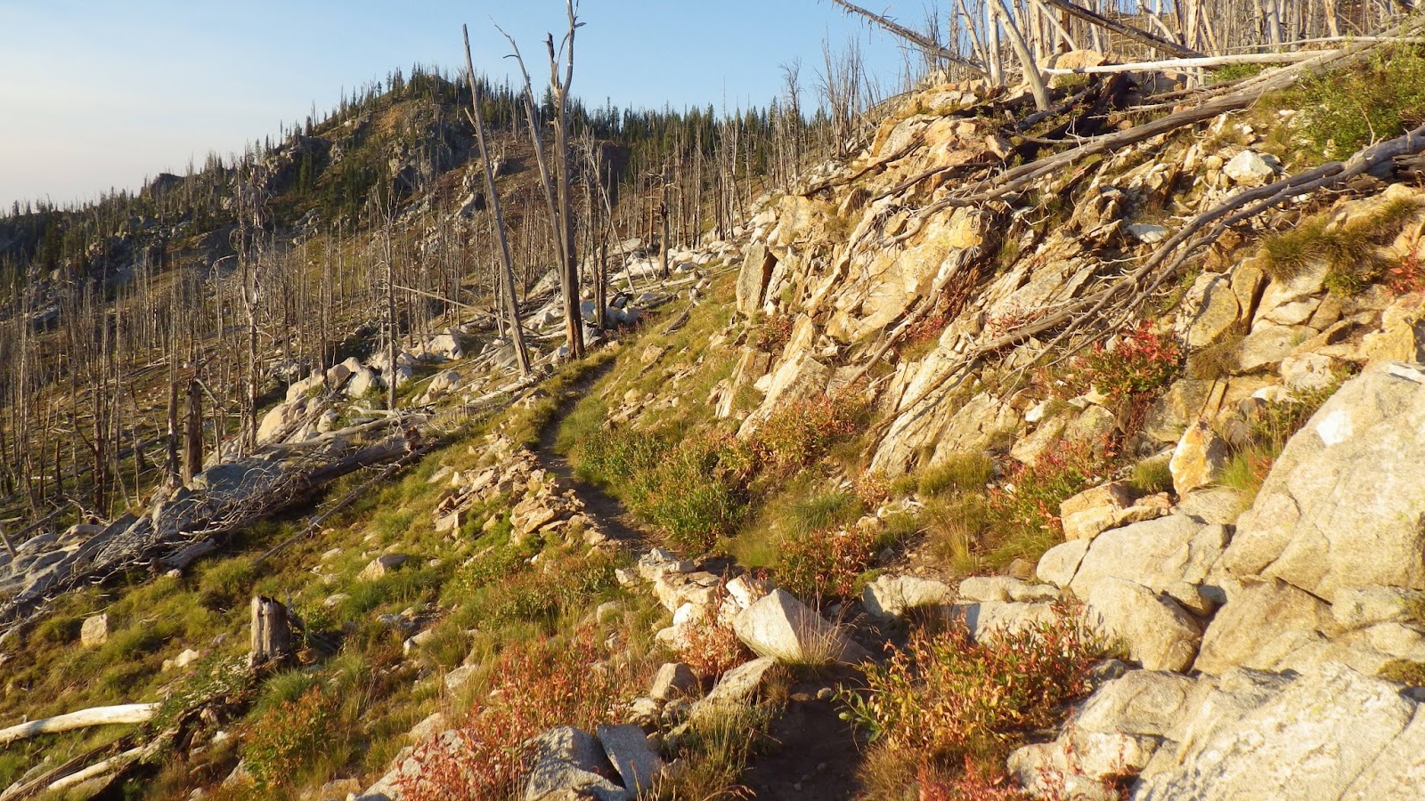 The trail led up and we crossed a saddle to the east side of the ridge. There, we hiked up some switchbacks in the morning light. I was glad as I climbed that we hadn’t tried to press on the night before. Maybe we could have kept going if we’d paused to eat dinner, but it would have been a dark and scary hike.
