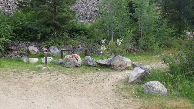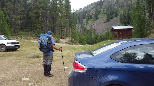 In the morning, we packed up the tent rather quickly. The tent, surprisingly, was not very wet from morning dew or condensation or the light rain that came before dawn. The plan was to stuff it in the trunk so it would be out of sight while our car was parked in the Big Creek trailhead lot. We ate breakfast, took care of morning business, and drove on over to the trailhead, driving past the lodge and the air strip in short order.