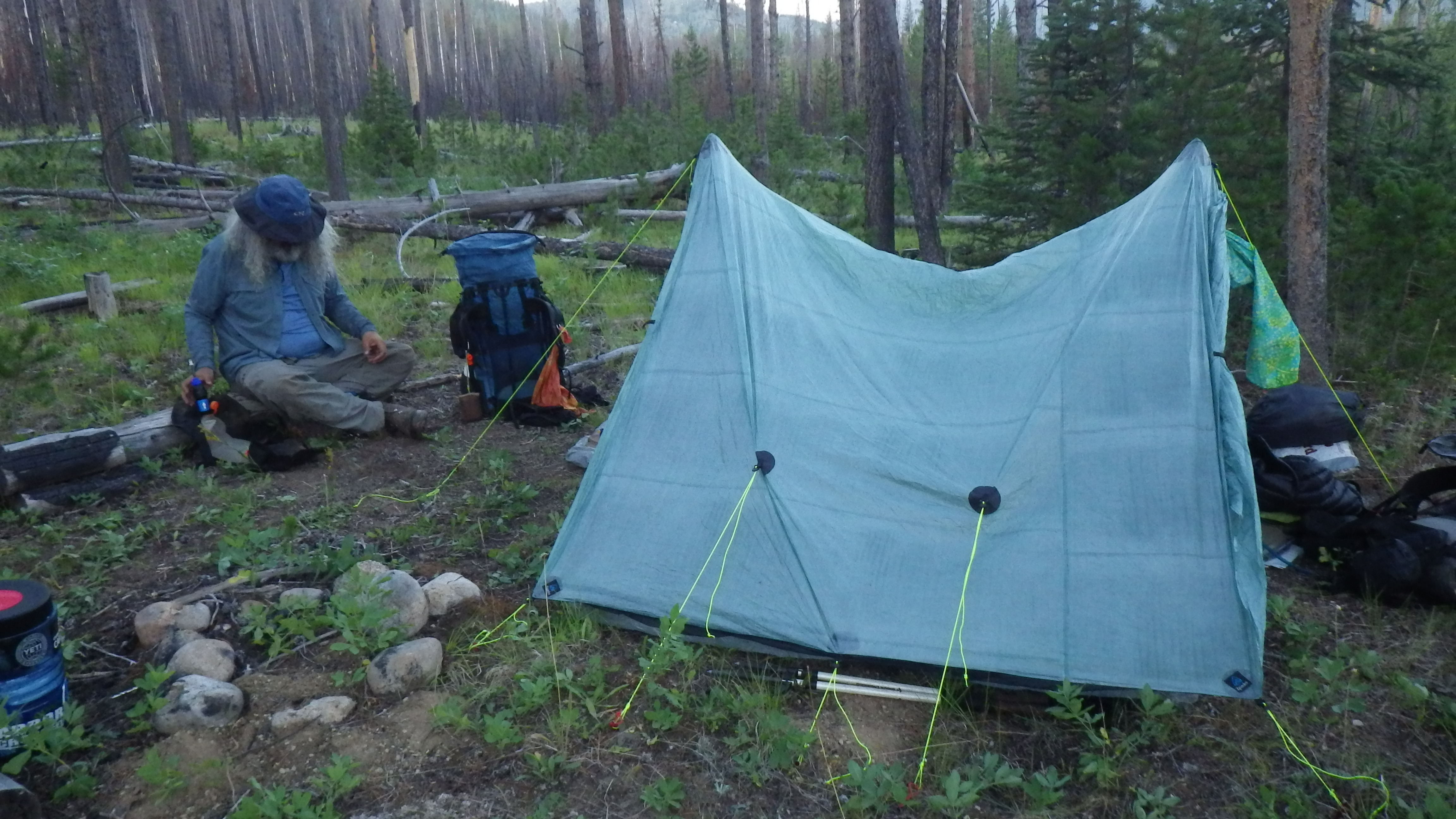 Ambrose got his tarp out and we moved from shady spot to shady spot through the day. The coffee finally eliminated my headache, but I did do a more completely cleansing, including another hair wash, during the day. Ambrose did a “shower” with his water bag hanging from a nail on a tree and got rinsed off well.