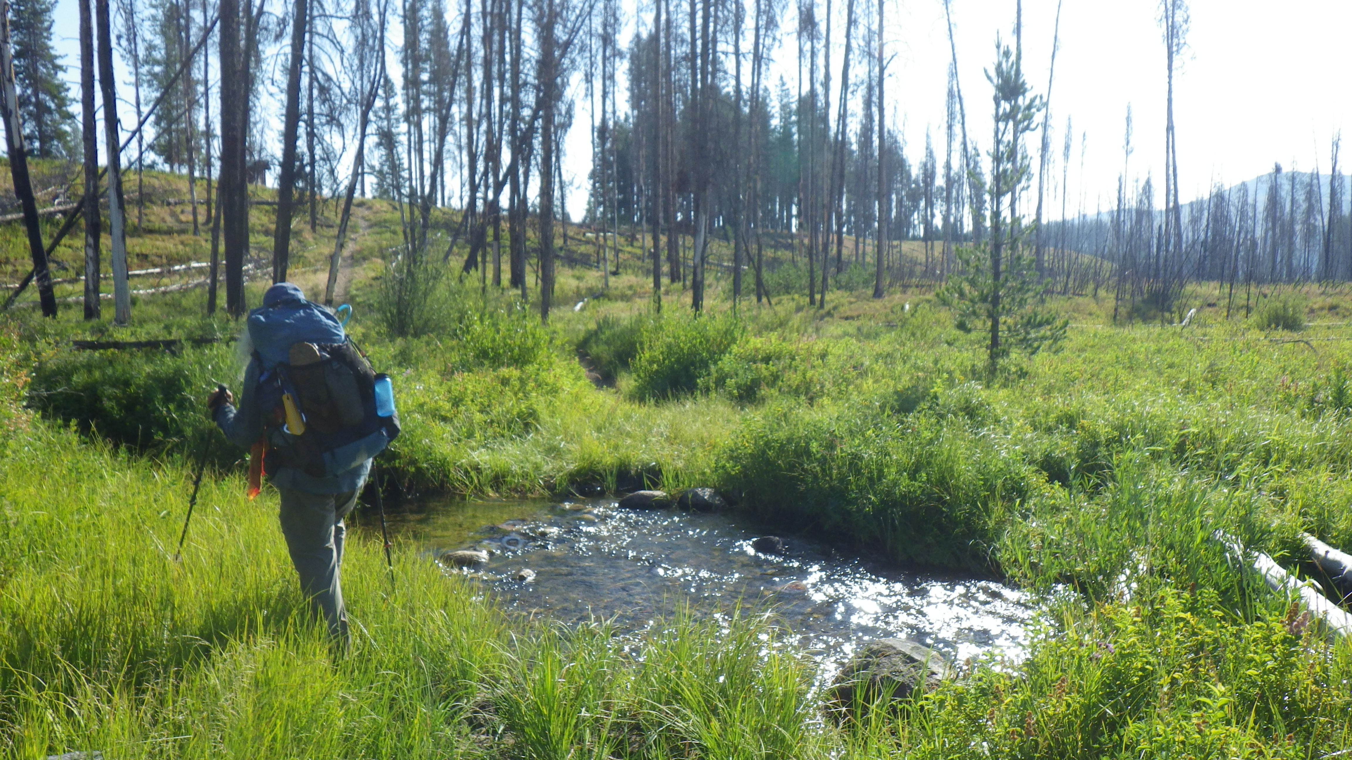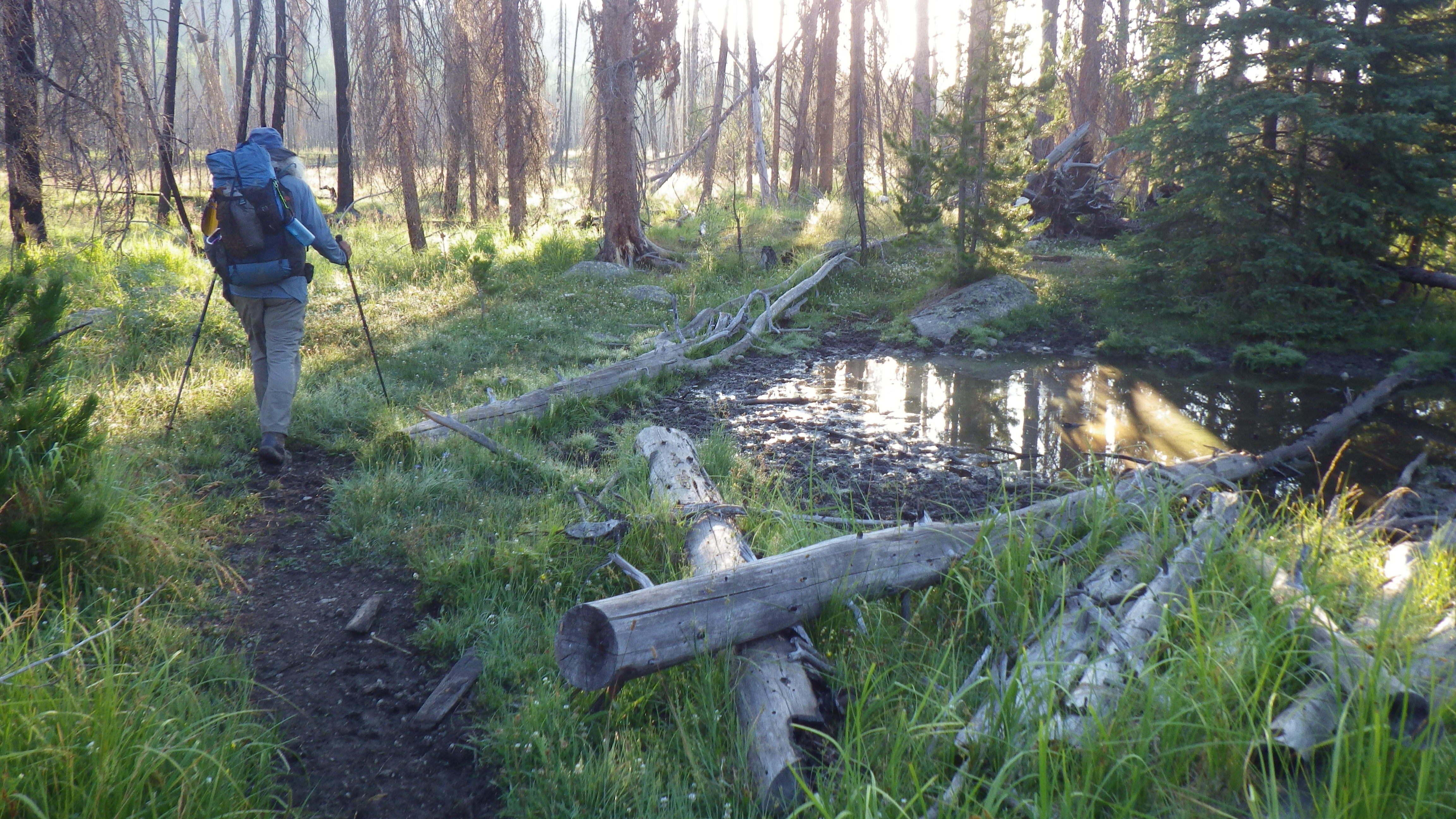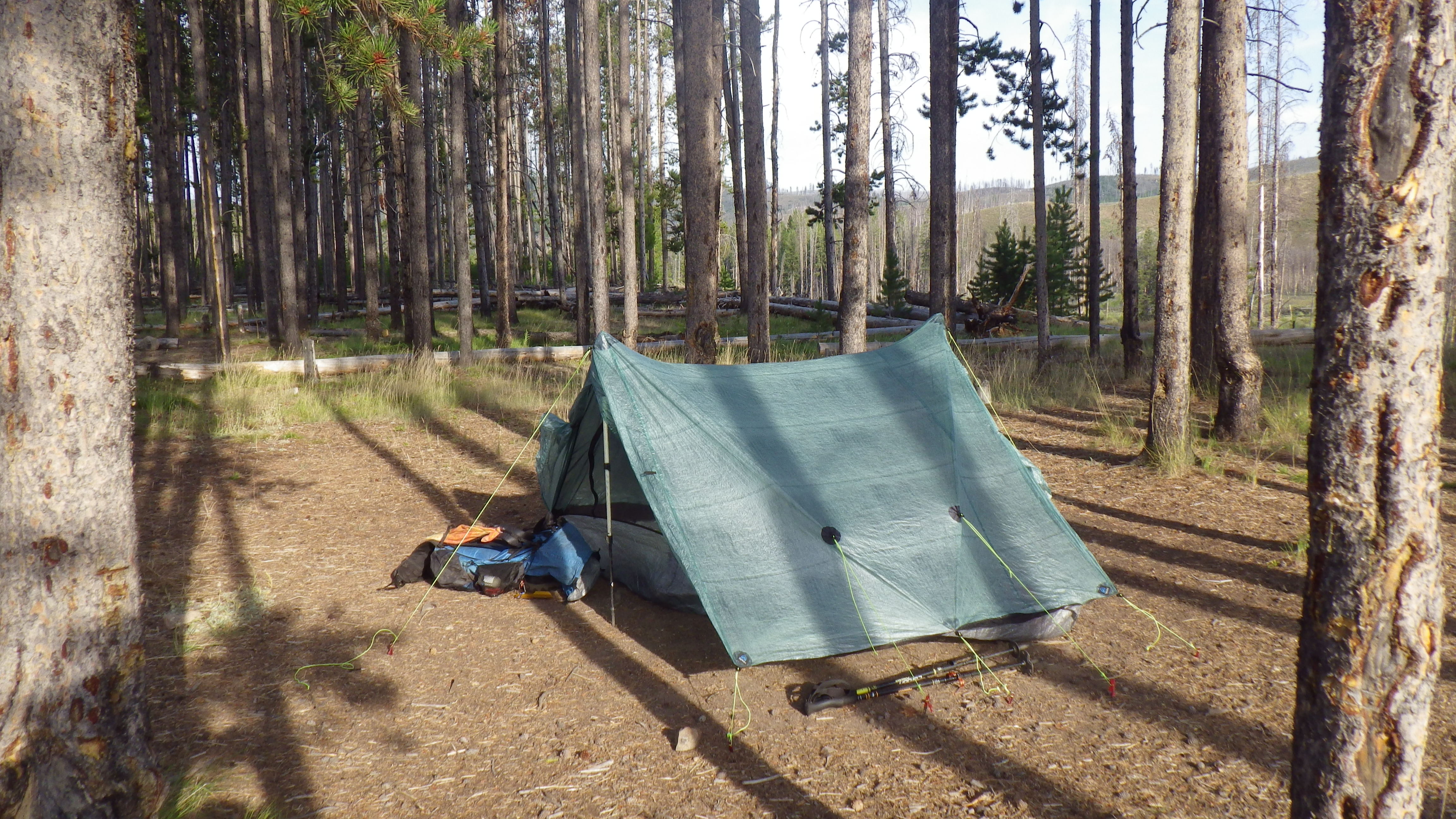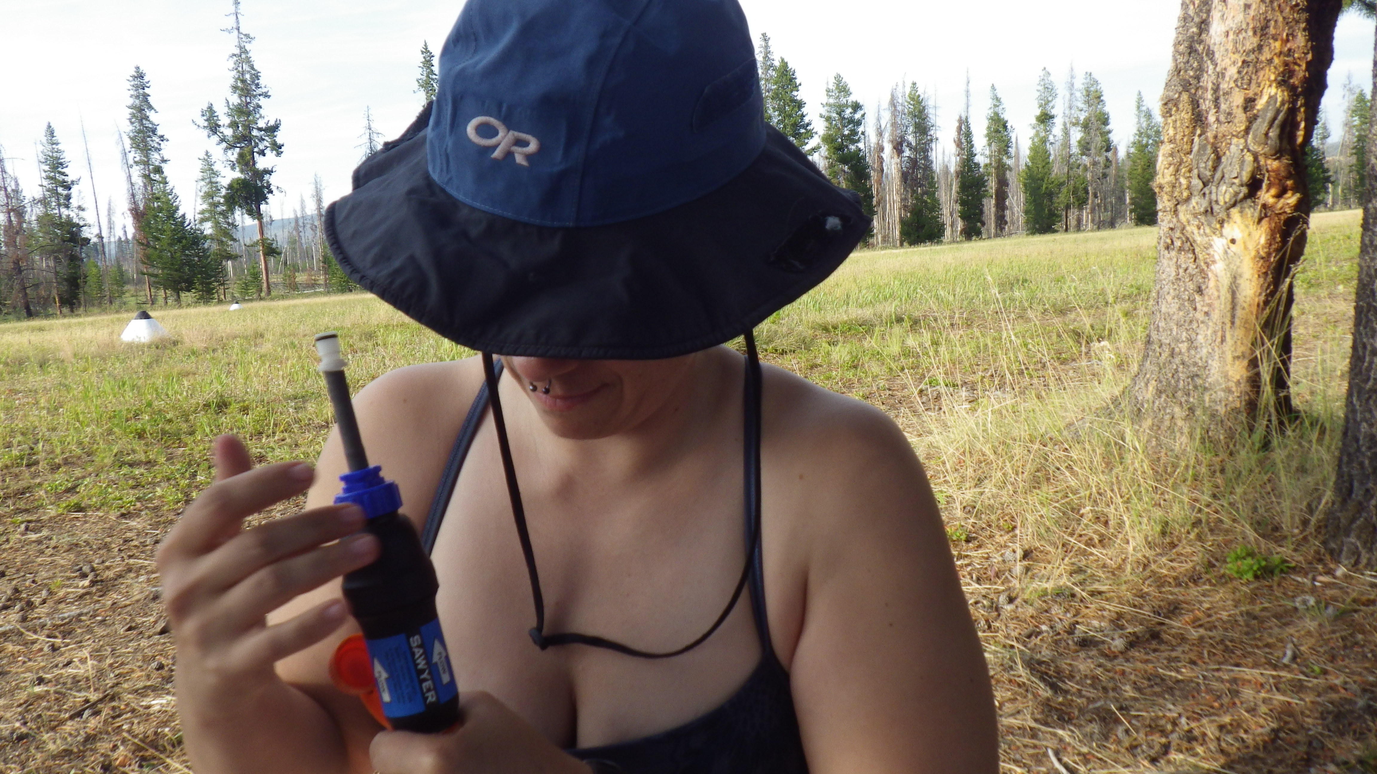 Around dinner time, Ambrose got to work setting up the tent and I got to go get water. We only had a little dirty water left in one of the bags, and I dumped it on myself before braving the harsh sun on the trail down to the water. I also wet myself pretty well in the stream where I got water. I was wearing my sleep bra instead of my hiking bra, and I counted on it to stay damp and keep me cool for a long time. That’s the whole reason that it’s a sleep bra and not a hiking bra – it refuses to dry quickly.