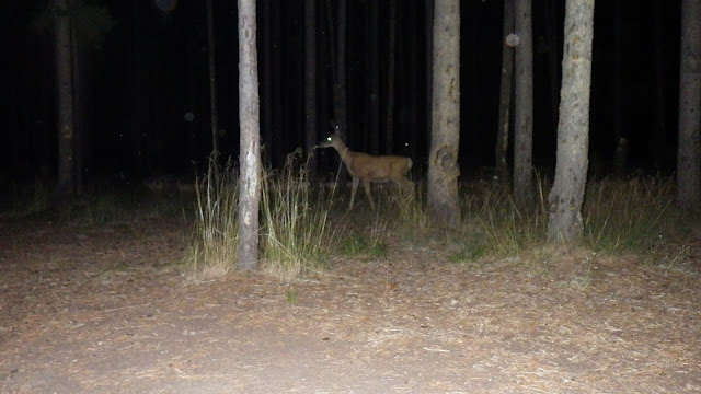 There were deer on the airstrip in the dark. I turned my headlamp up to max setting to get a decent picture of one. And one of the deer had line wrapped around his antlers, something shiny, maybe purple. I wished I could get the line off of him, but I had no way to stop the deer from running away or, as Ambrose suggested, goring me with his antlers. So I let it go.