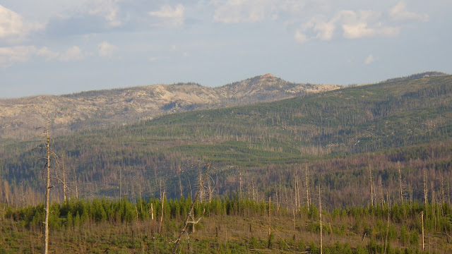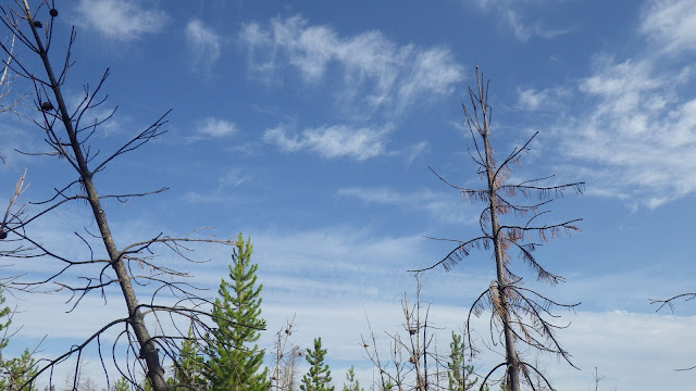 We came across more stands of young, dead trees, and then some stands of living ones, which I was glad to see. We climbed, sometimes up steep inclines and sometimes along rambling switchbacks. I tried to find where the Three Blaze trail intersected this trail, and I think I might have, but I’m not sure.