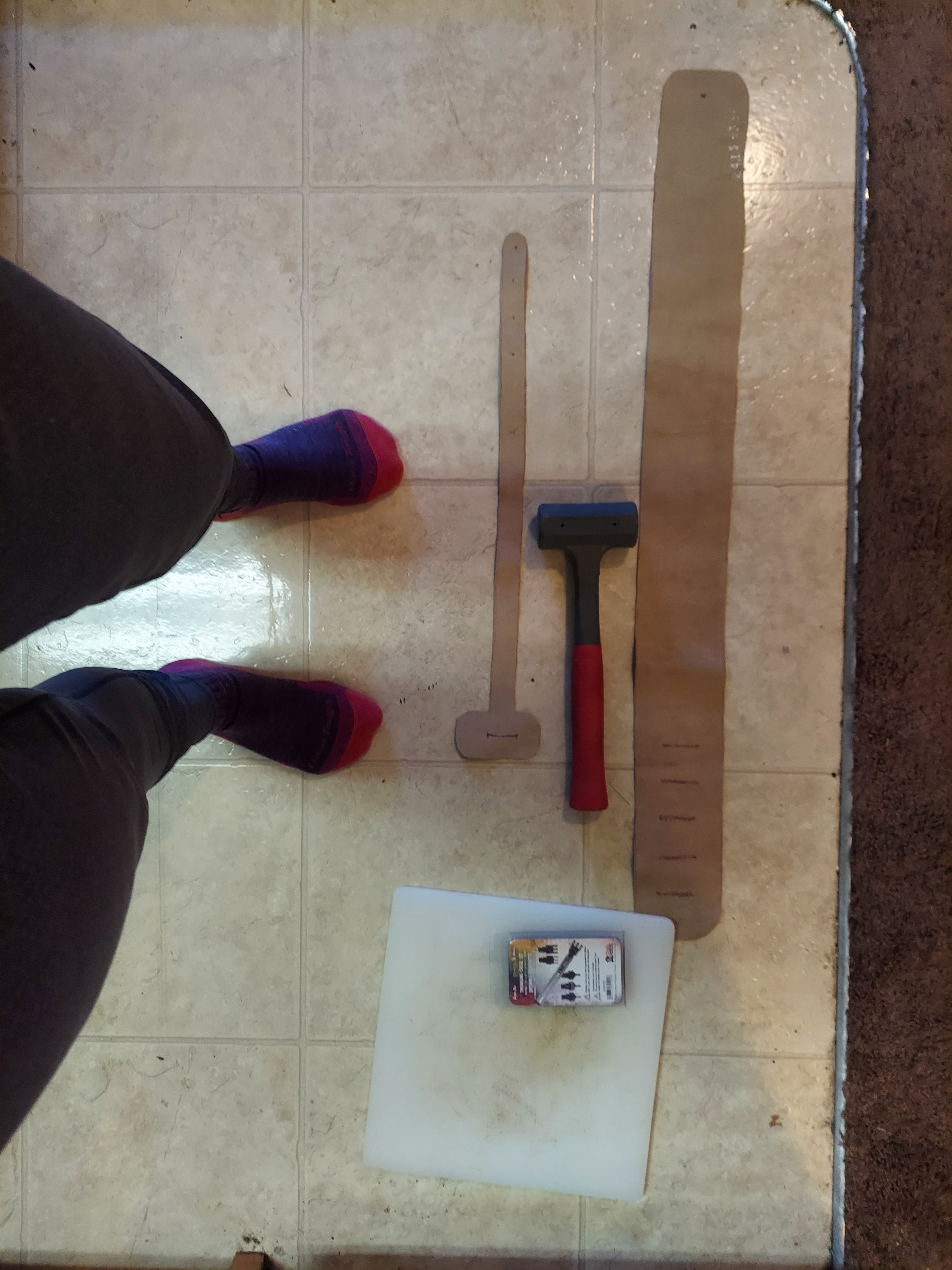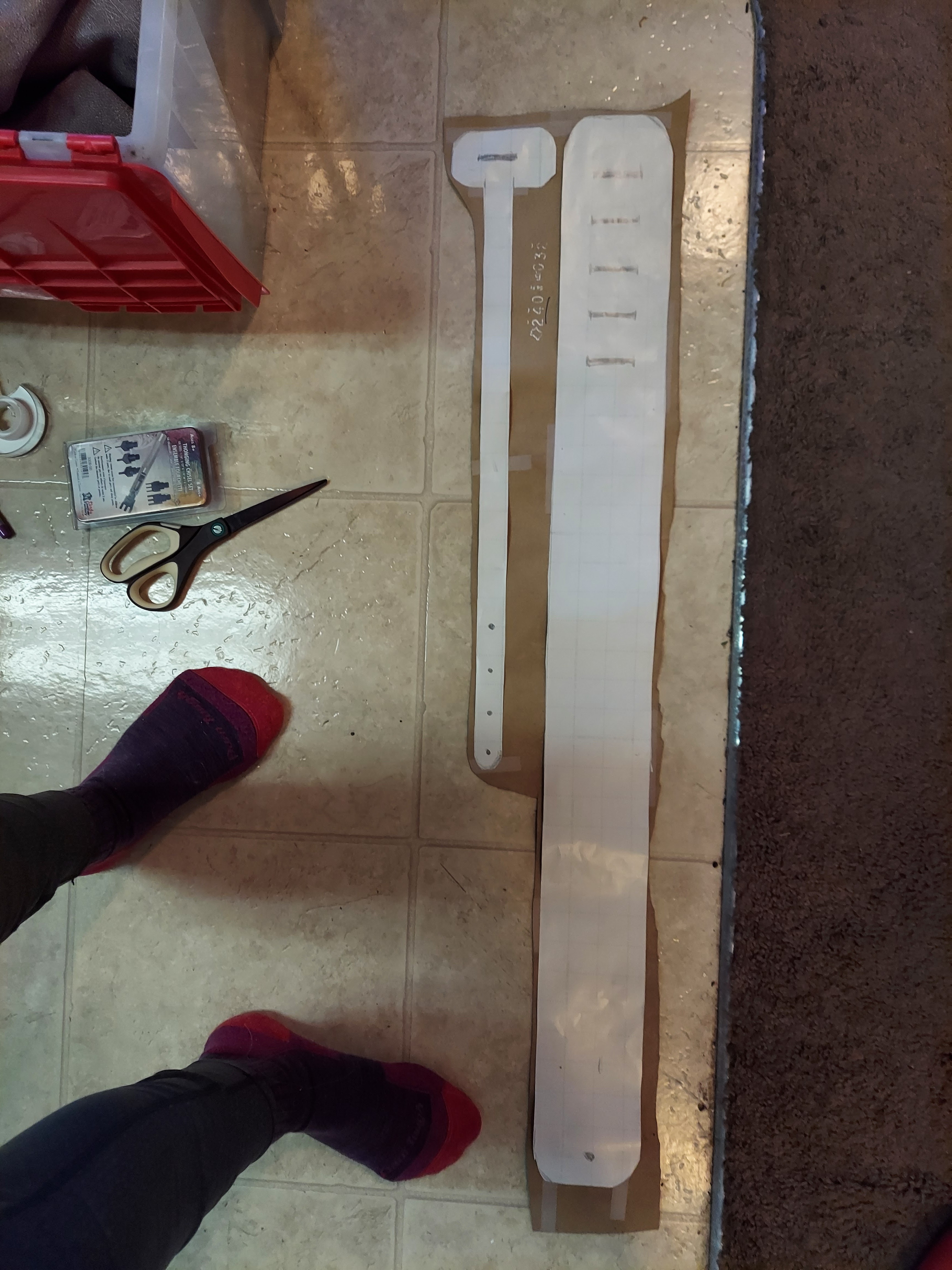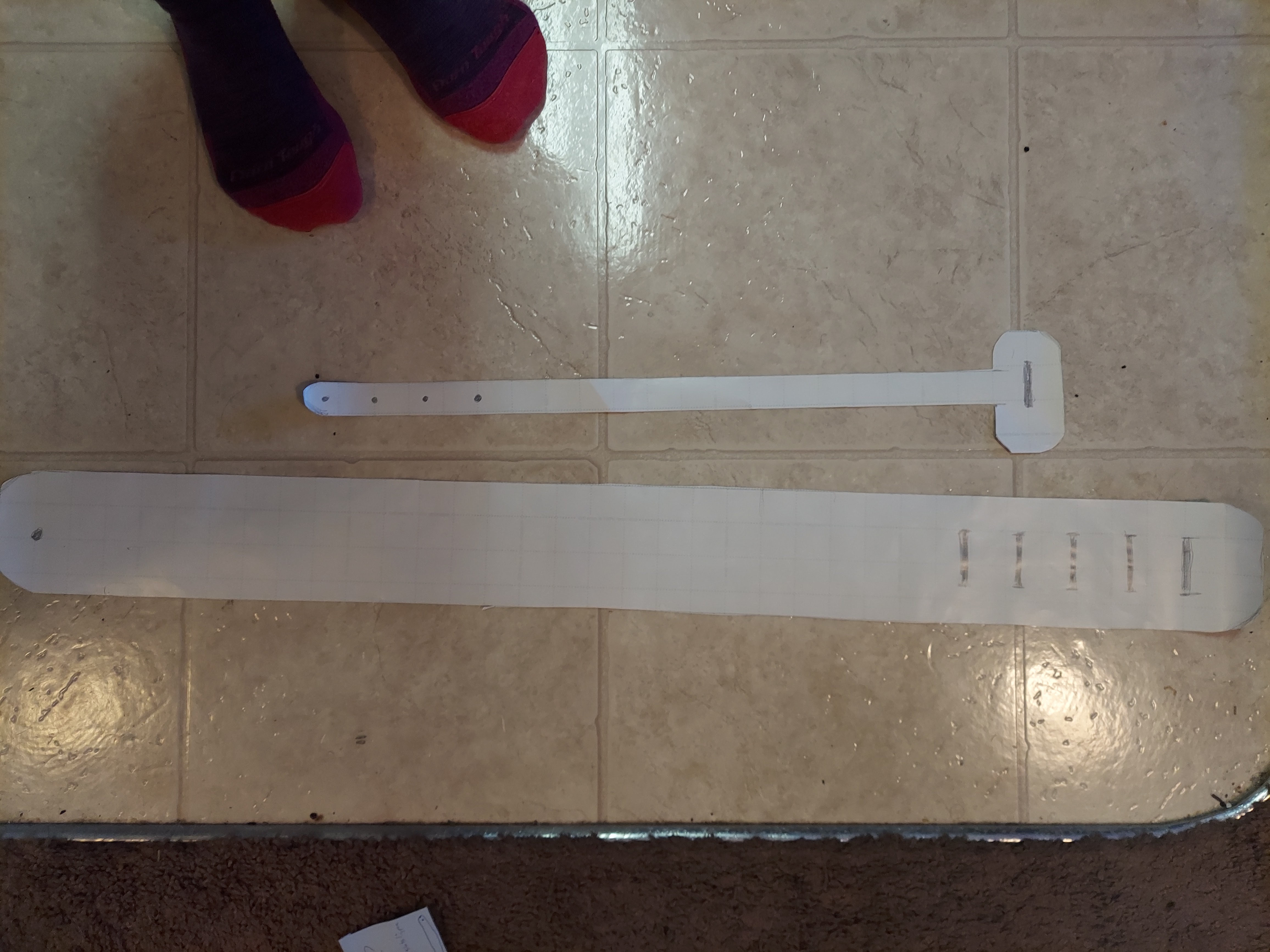 I don’t have all the tools that would be ideally used in constructing the strap, but I have enough tools to get the job done. I copied down the pattern and the general measurements onto a post-it note, and then I realized I needed some really long paper to make a pattern.
