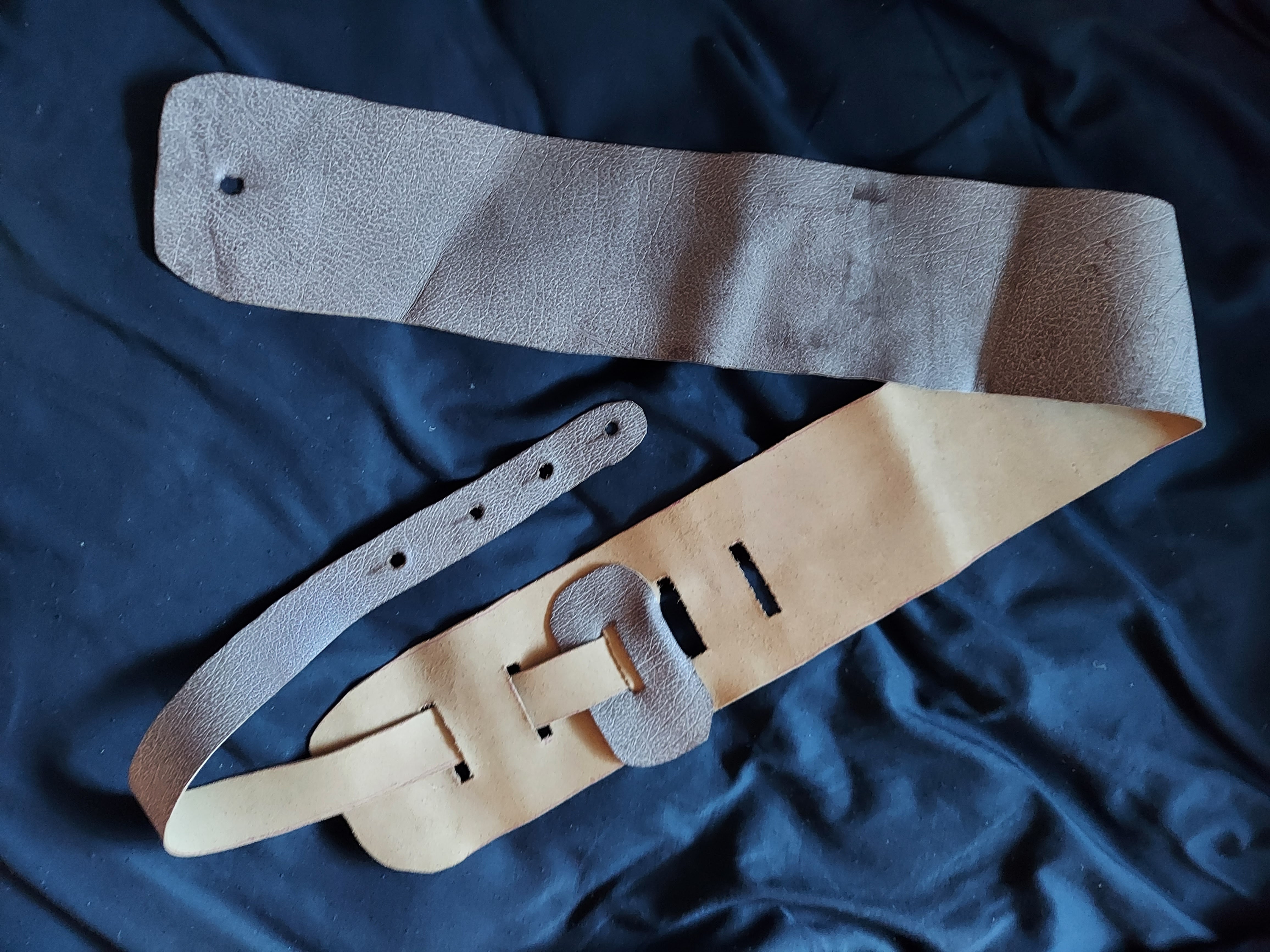 Now I had two long pieces of leather, and all that was left was the cutting of the holes. This part actually took the longest because I don’t have a hole puncher at the moment, so I was using a thonging/chisel set to make little round holes and longer slots. That part was hard and finicky, because every hole required many cuts due to the size and shape of my chisel. I used a bigger chisel for the slots, but it still required multiple stabs and I had to finish it with the small chisel anyway.