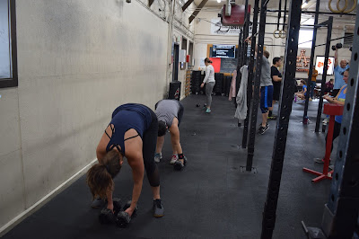 At the strategy class, I got a chance to try out the dumbbells and they were heavy. But I could lift them. Up above my head. So I was going to do my best at Rx and get a really good workout. One thing that they recommended for speed on the thrusters was to take the dumbbells to the shoulders with a kettlebell swing type movement, nice and smooth. Several of us taped the bars to protect our hands and help our grip during the toes to bar.