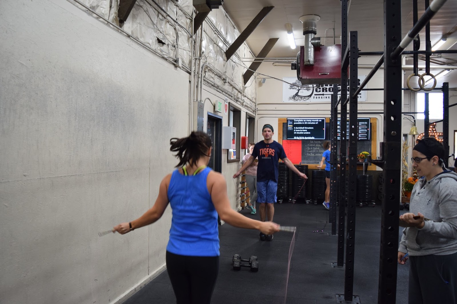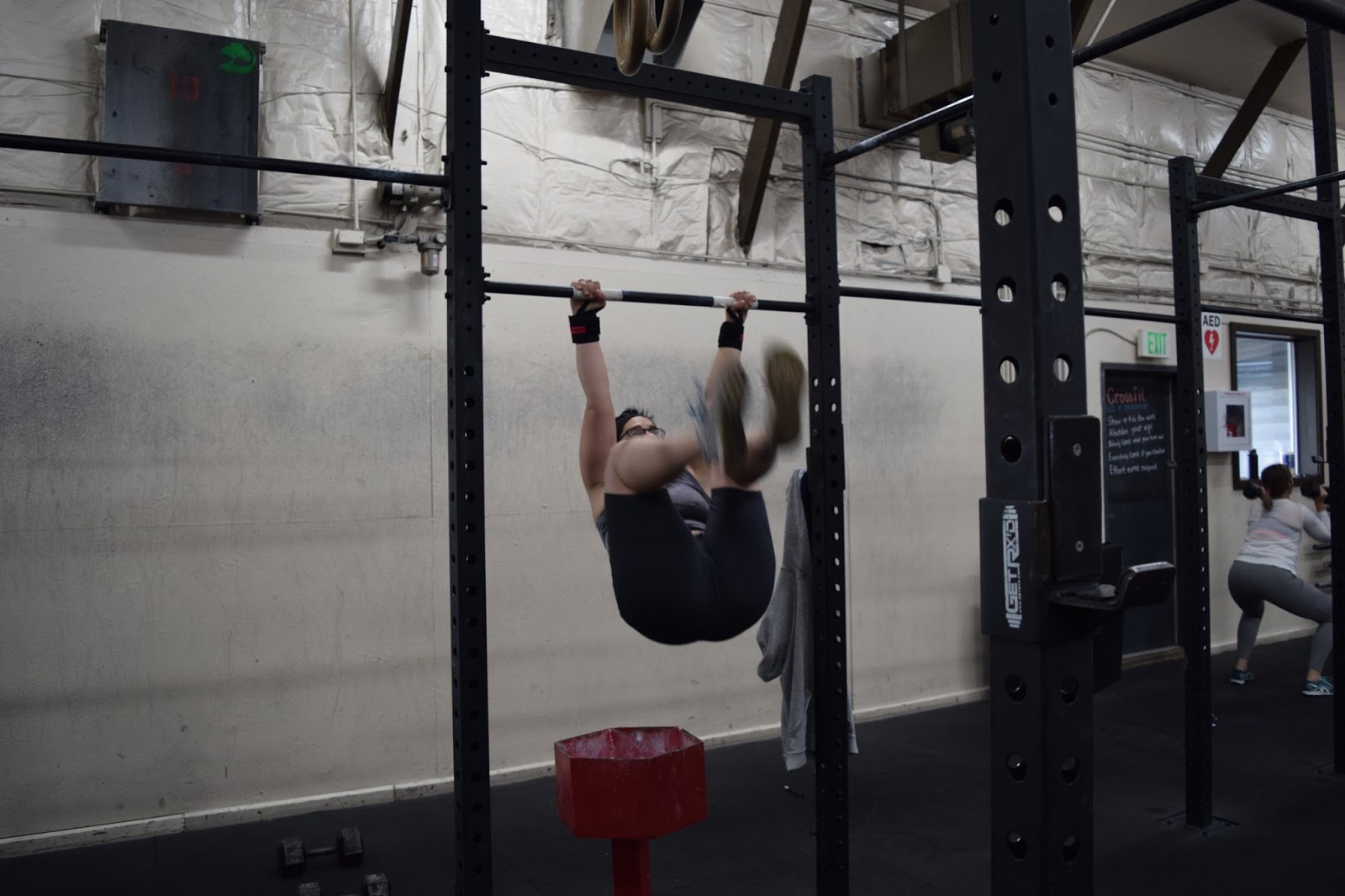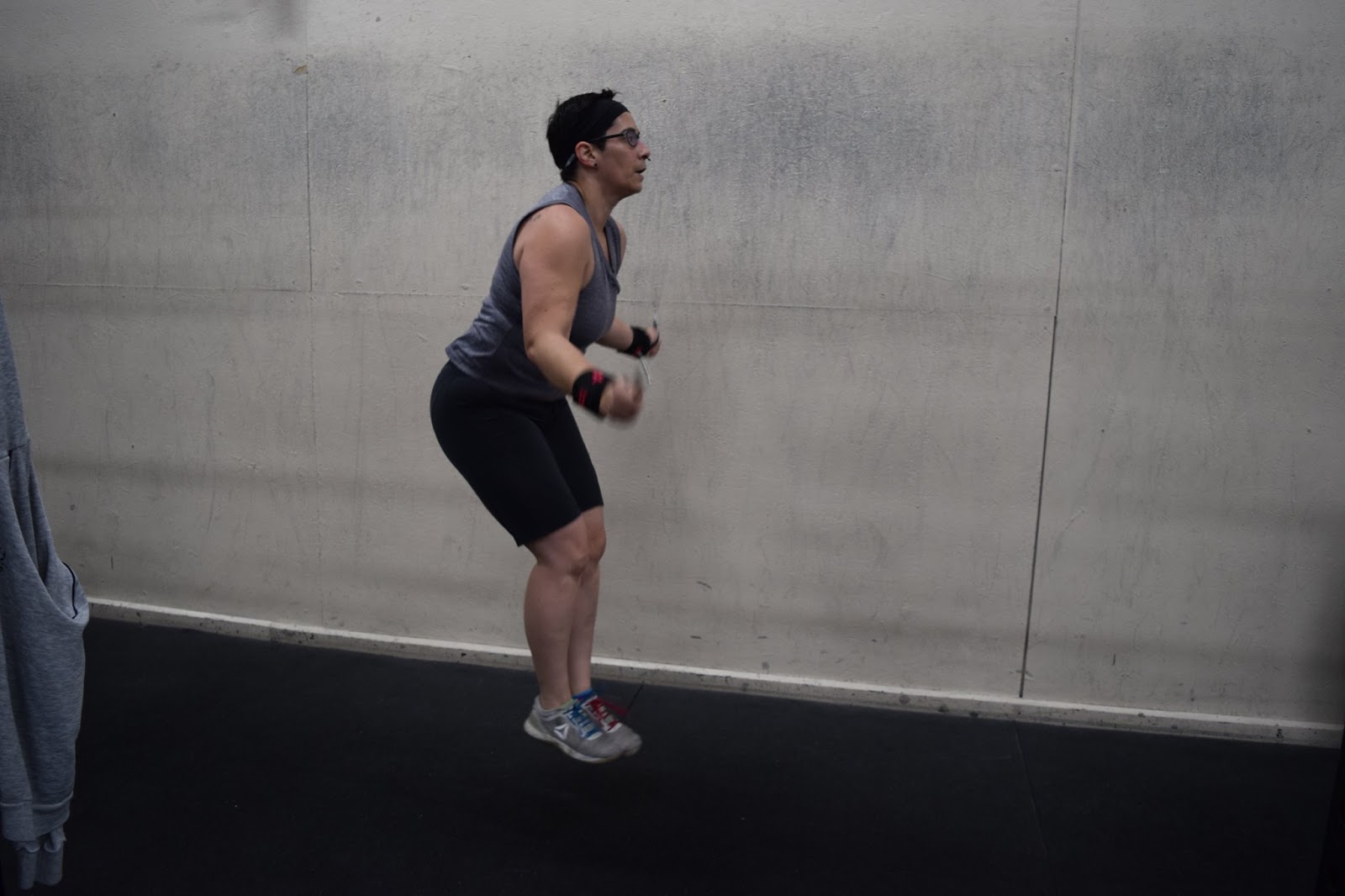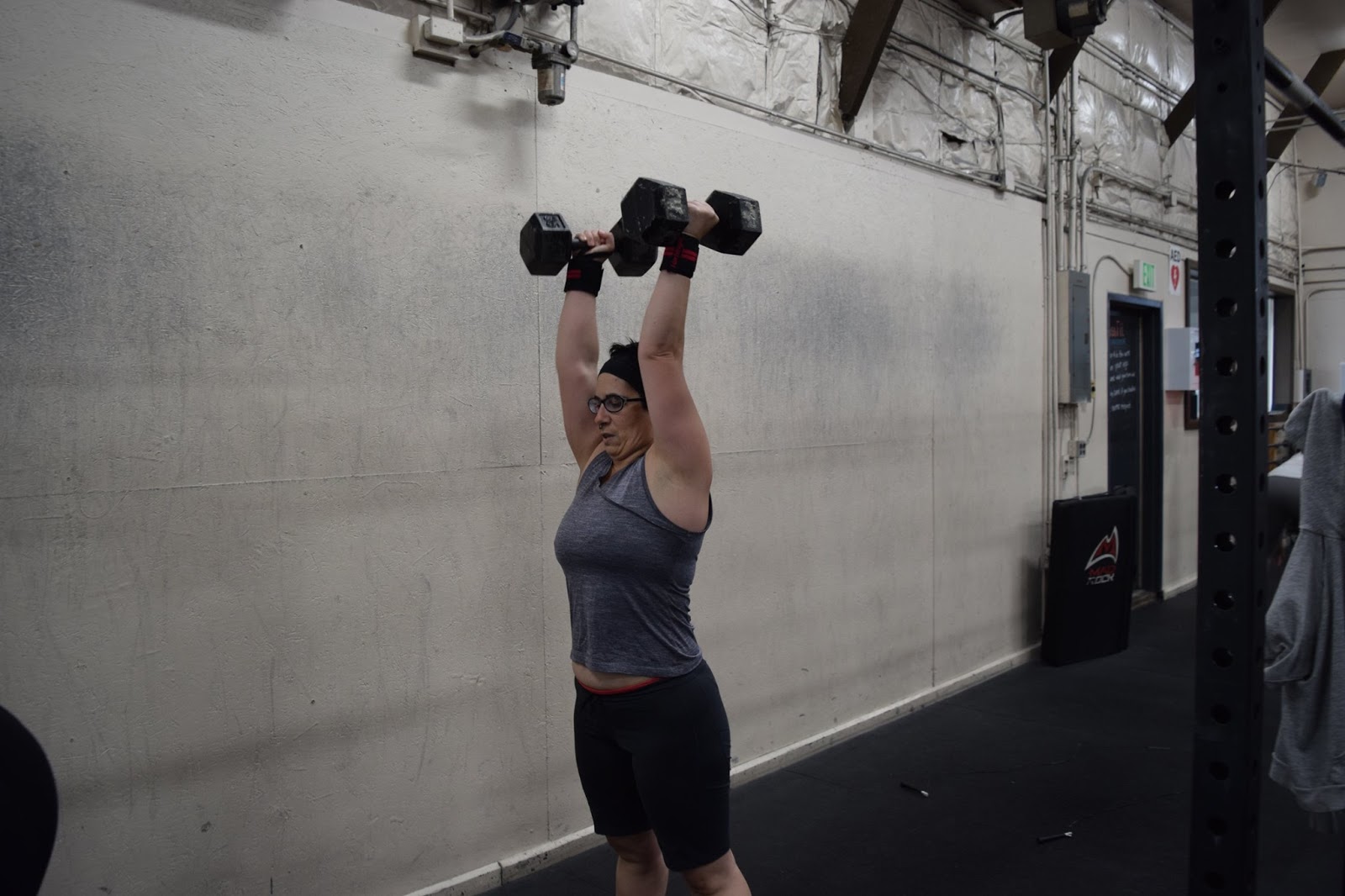 She also did a bang up job judging me, if I do say so myself. The hard part for me, as anticipated, was the thrusters. Those dumbbells got so heavy, and it was hard for me even to lift them onto my shoulders. I didn’t want to pick them up because I knew how hard it would be. At one point, when they were overhead, my left wrist wobbled and collapsed a bit. But my toes to bar were steady singles and I managed to get through 8 sets of 24 unbroken double unders, so that’s cool. My total for that attempt was 8 rounds and 24 reps (4 thrusters, 6 toes to bar, 14 double unders).