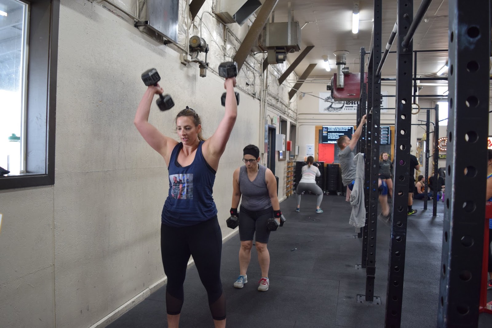 The dumbbell thrusters were the only questionable part. It’s only 4 reps, but women’s Rx weight was two 35 pound dumbbells. I know that I have gotten that much weight overhead before, in a prior open, but a thruster is different from a jerk.
