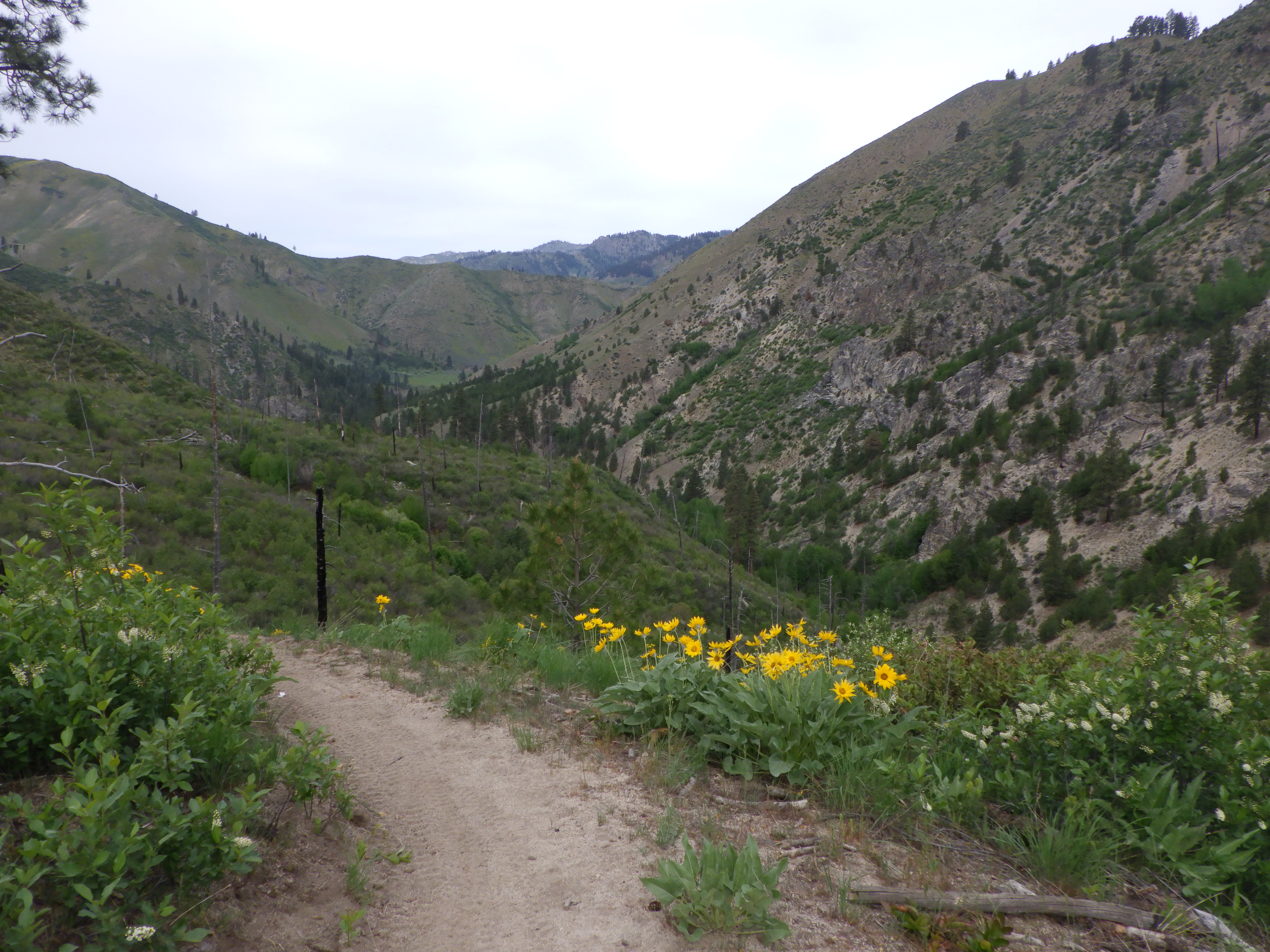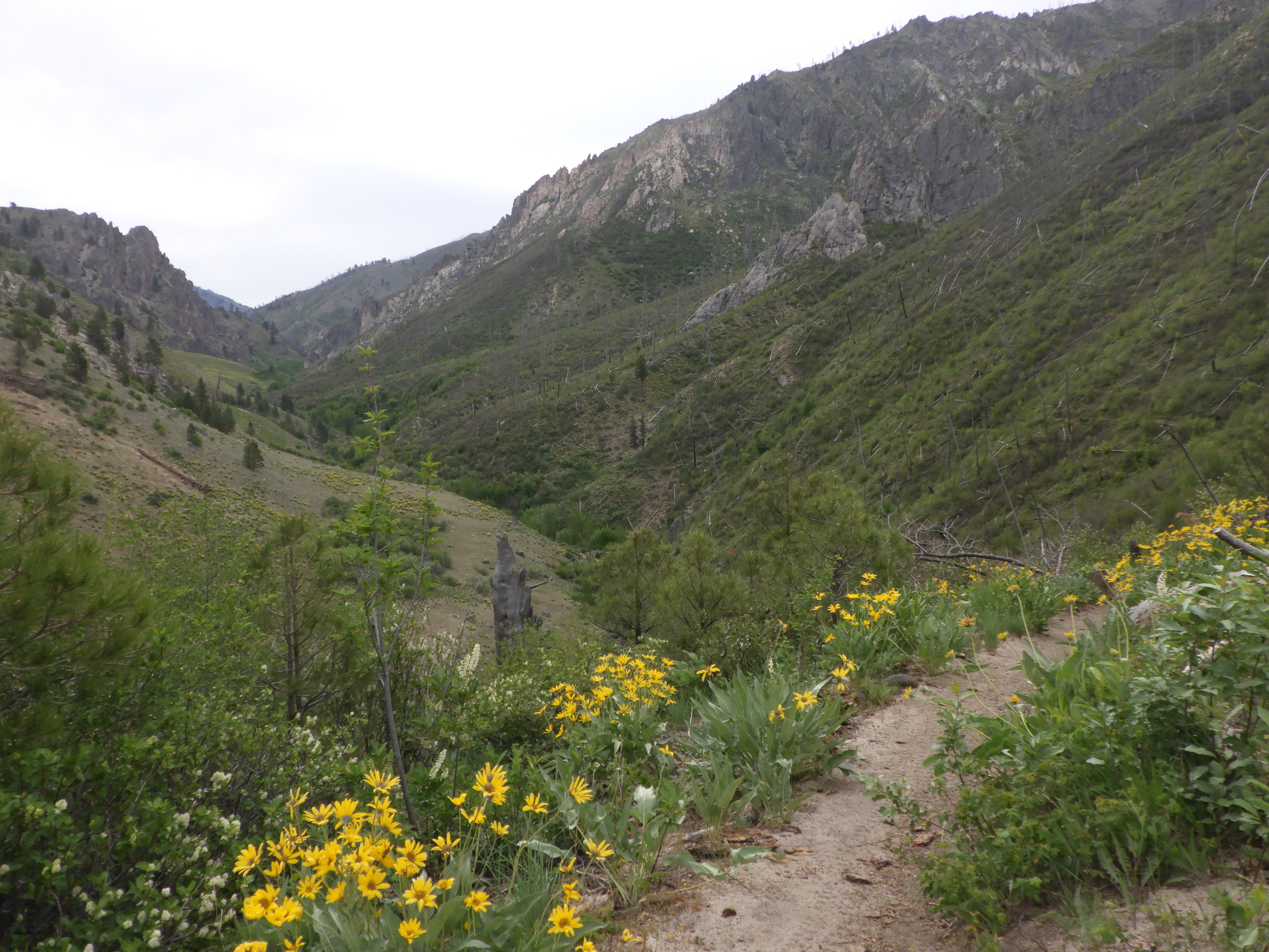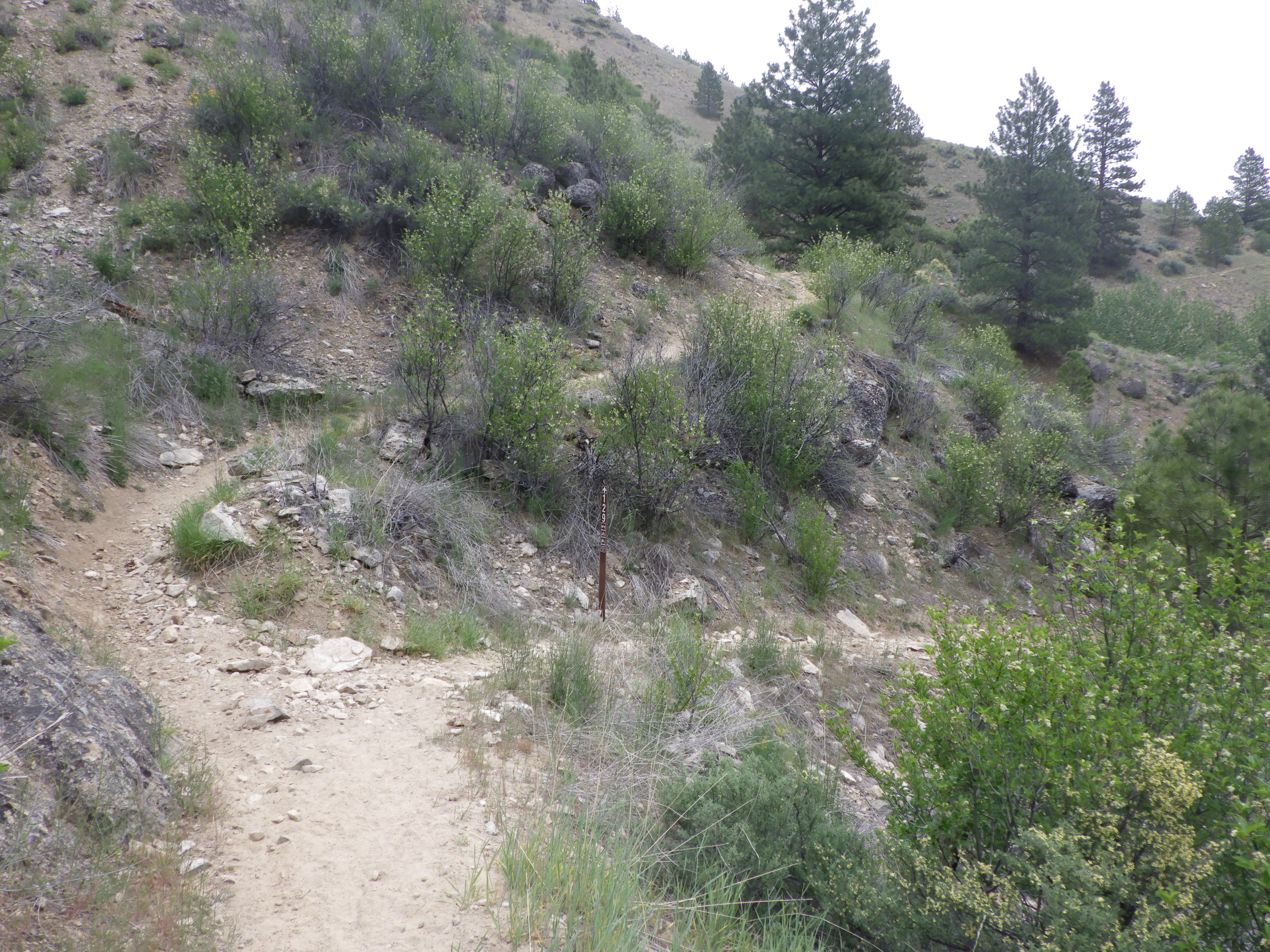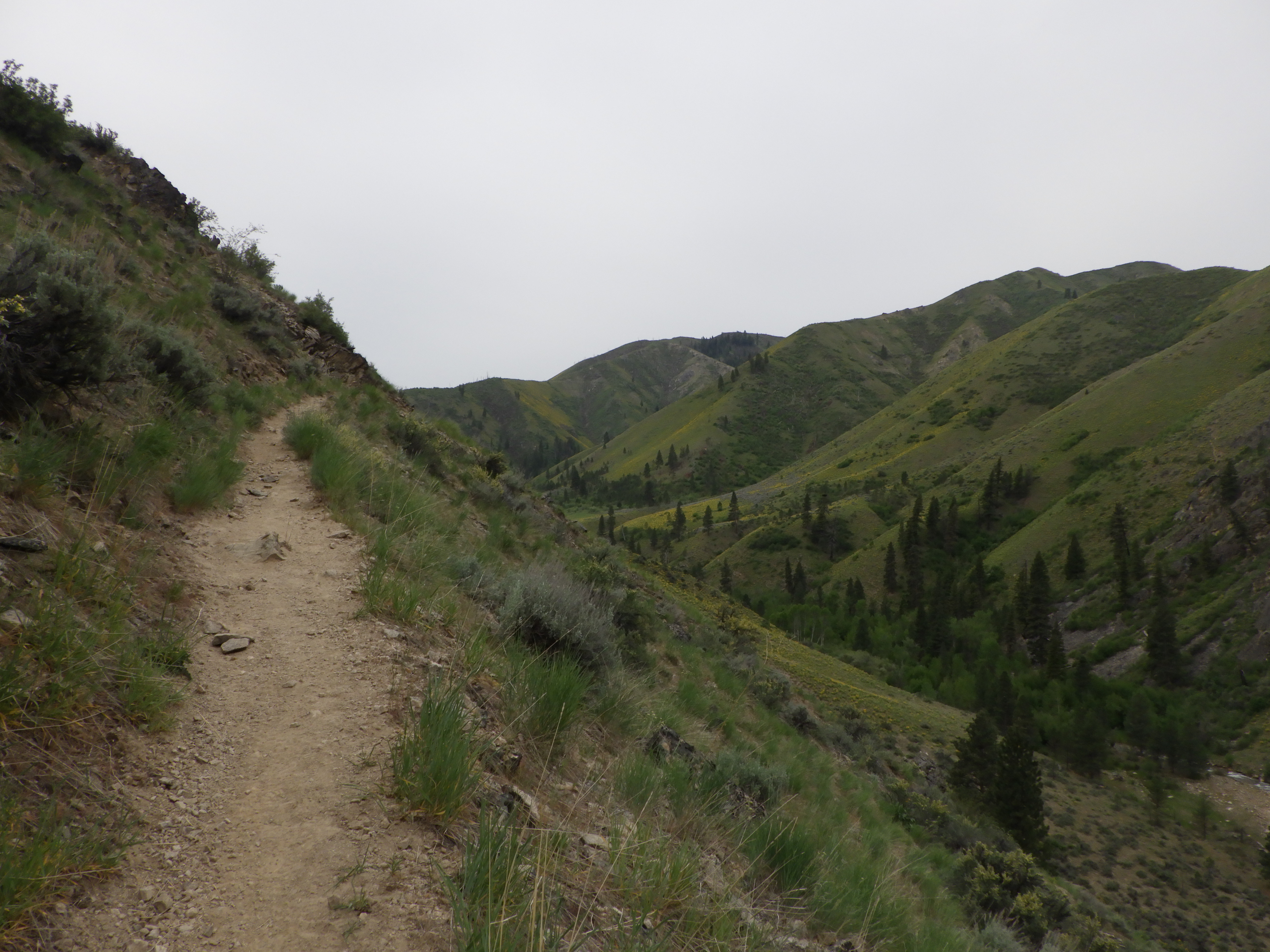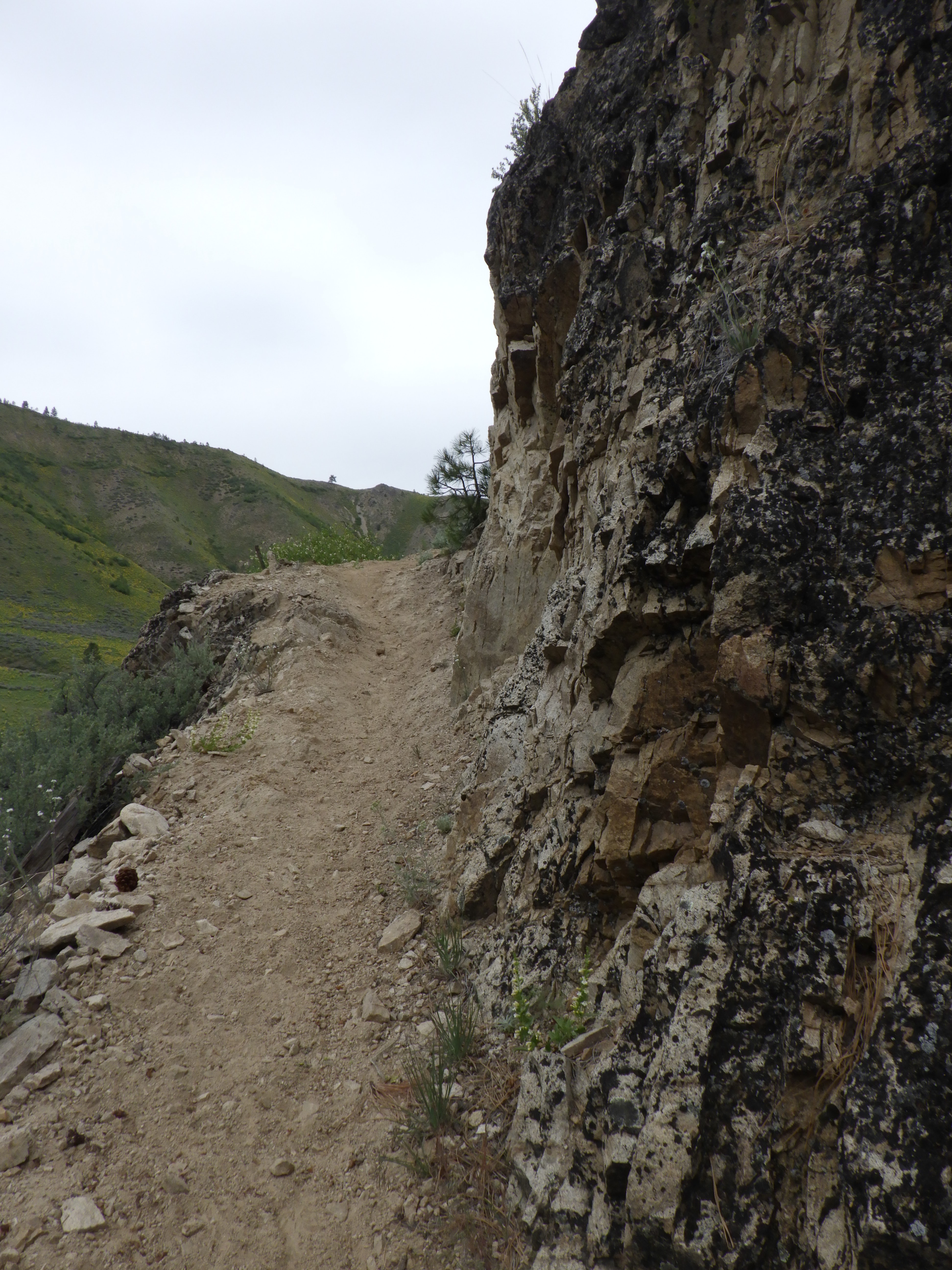 | I was glad of a cloudy day, since the waterless side of the trail can get mighty hot in the sun. The rocks on the trail reflect the heat right into your face. |