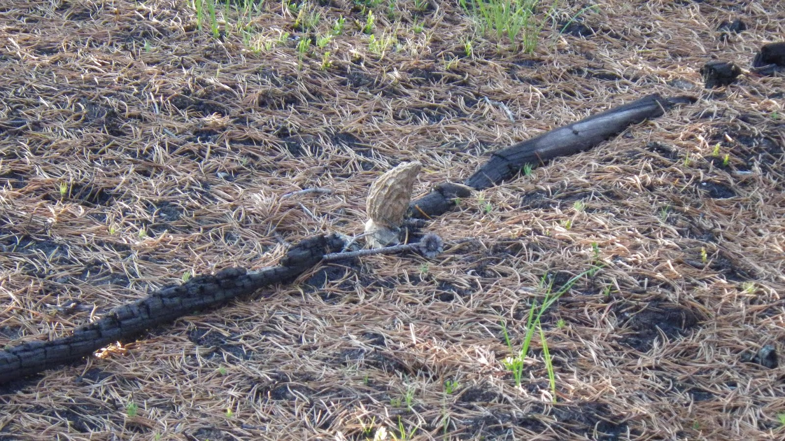 Bill had left a note at the junction sign for us, just in case we didn’t meet up. He made sure to grab it when we reached the junction so as not to a) leave trash and b) confuse future trail users. At the junction, we turned south and started heading up a switchback through a recently burned area. It was burned long enough ago that some green plants had started growing, but recently enough that all of the trees were blackened and standing, and the ground was dark and ashy.