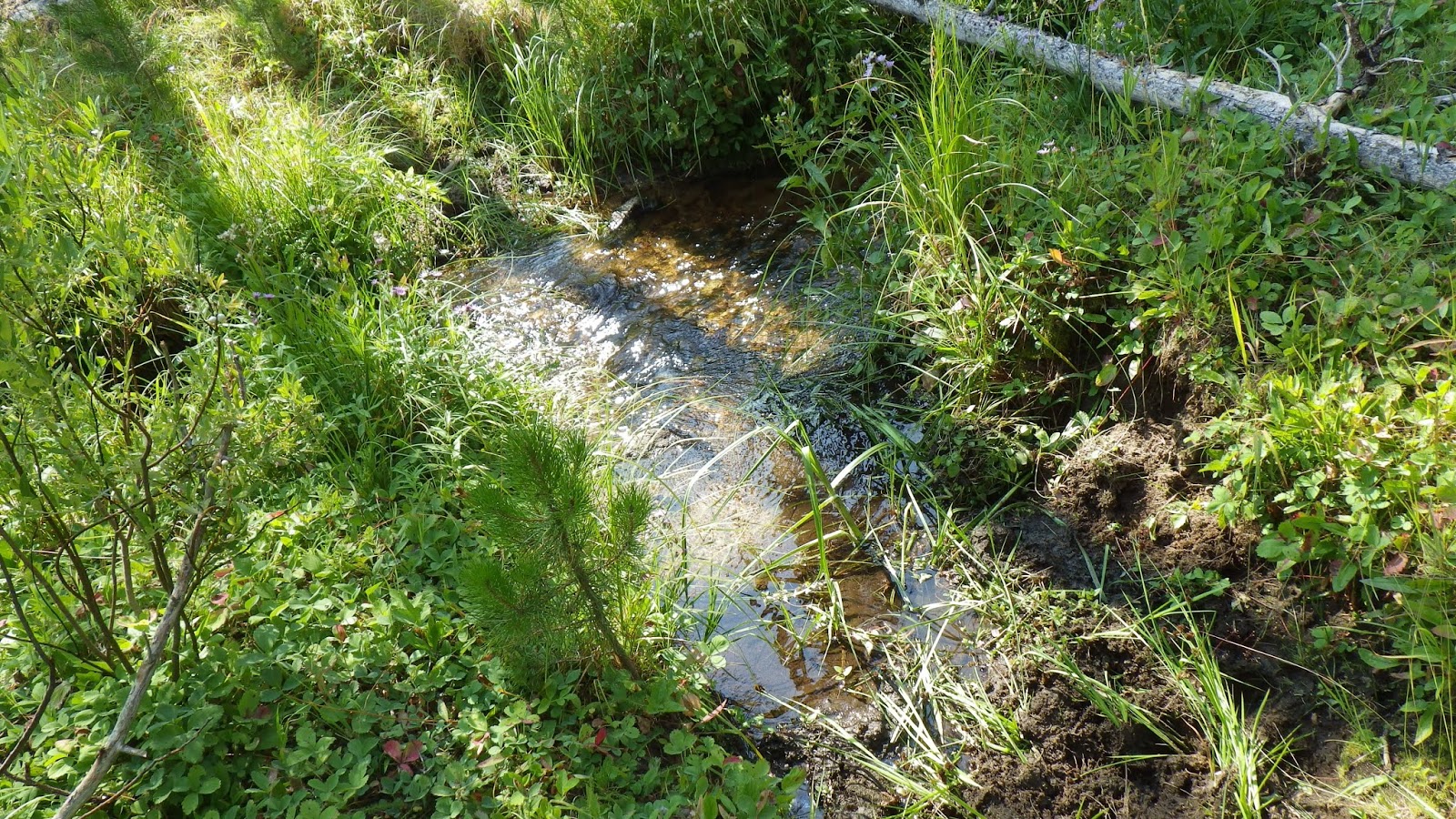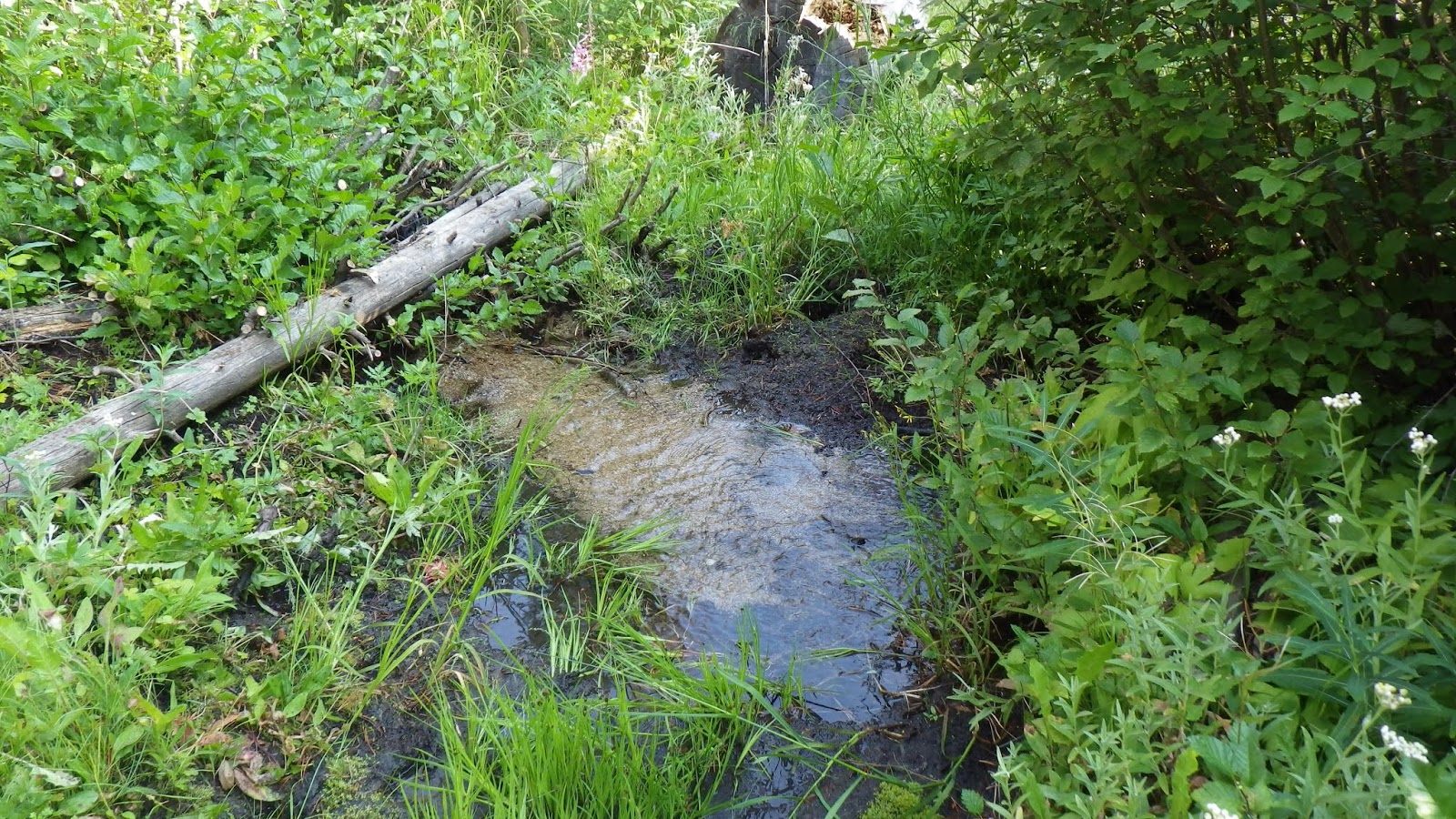I tried to find it. I dug my hand under and felt the fast flow of the water. I tried to follow the path of the stream into the meadow through bushes and grass, where it hid and I tried calling for help. But no one came to my calls. Two strong men within shouting distance and neither wanted to come help me. Fine! I kept looking, and then I took a wrong step and submersed my leg up to my thigh.