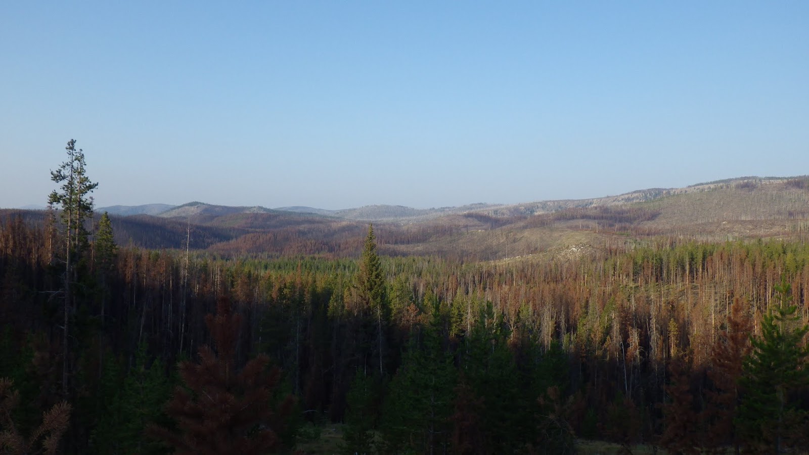 For a while, Mike was in the lead, but when Bill fell back, Mike followed him. I led the way for a bit, and called a break when my alarm told me it was time. Of course, the guys were behind me, so I had to wait for them to catch up before they could take a break. We were at the top of a rise, still in the burned zone, with good views all the way around. I tried to find Rock Rabbit Point, but either it wasn’t visible from there or I just couldn’t see it. I did see One Man Butte.