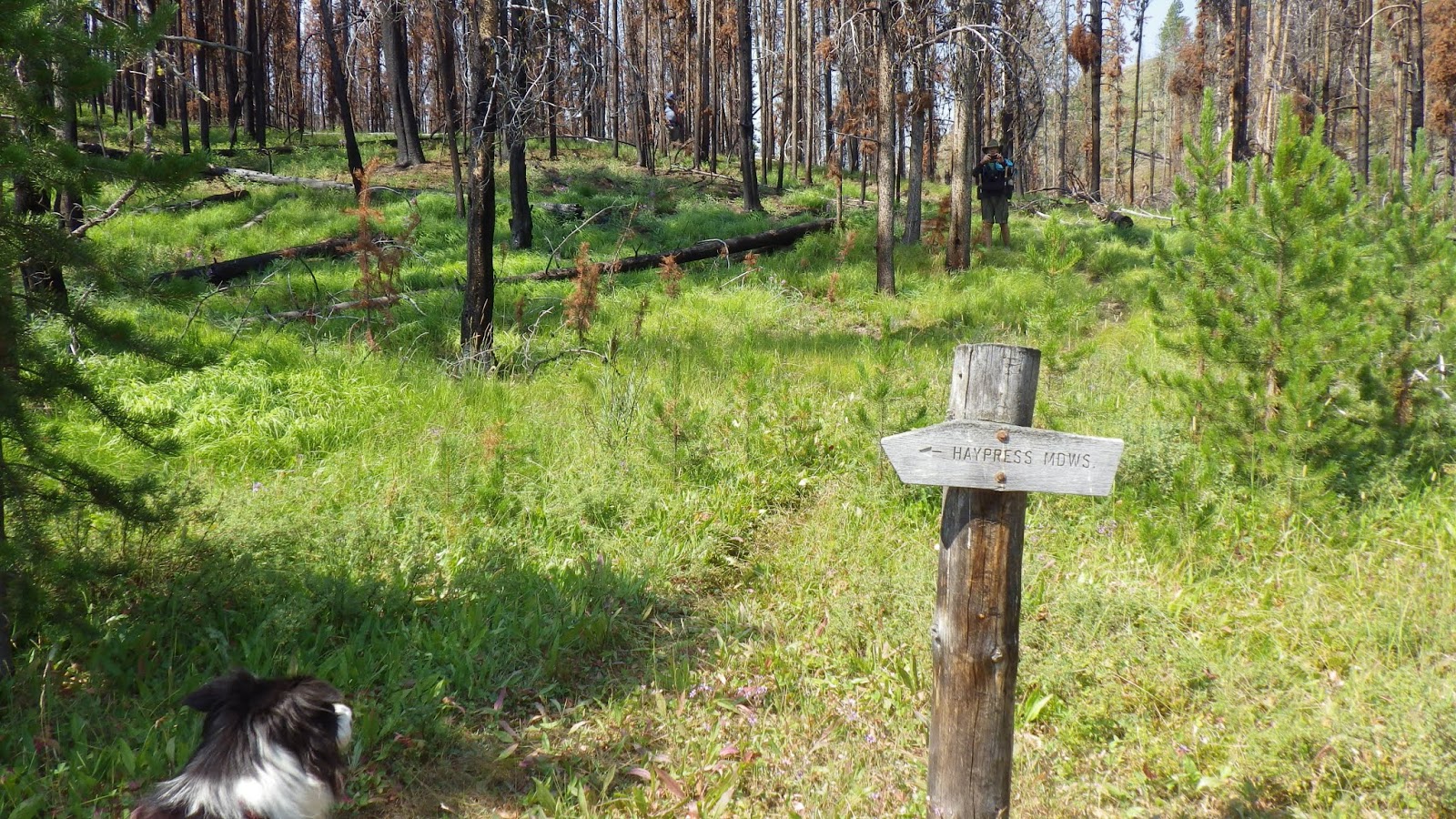 I took a bit longer than I anticipated and it took me a while to catch up. I admired Haypress Meadow as the trail wound around it, and caught Ambrose first. By the time we reached Bill, it was well past break time. He was sitting in the shade of some trees, and Ambrose and I found our own spots of shade.