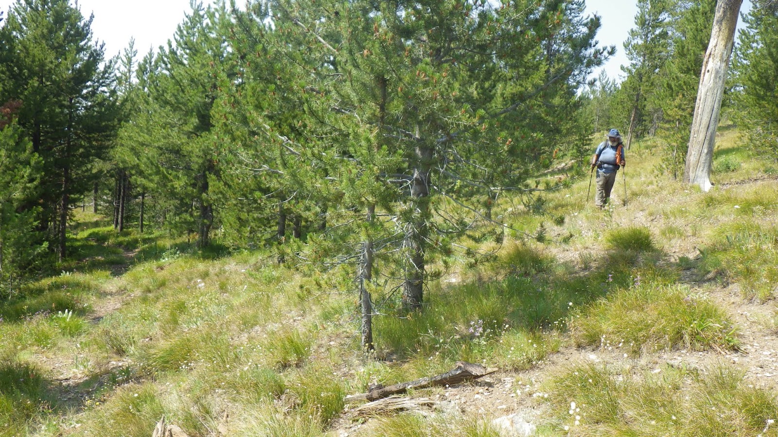 At the next break time, I switched over to my skort in the sunshine since there was little shade on offer near the trail. Plus I was still fairly cool. Bill hiked off trail and uphill to get some genuine shade in a copse of young pine trees for his break. Ambrose stayed by me, not because he didn’t want shade, but because he didn’t want the extra steps and elevation gain.