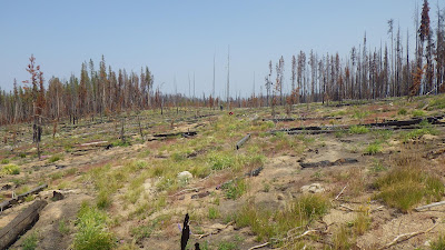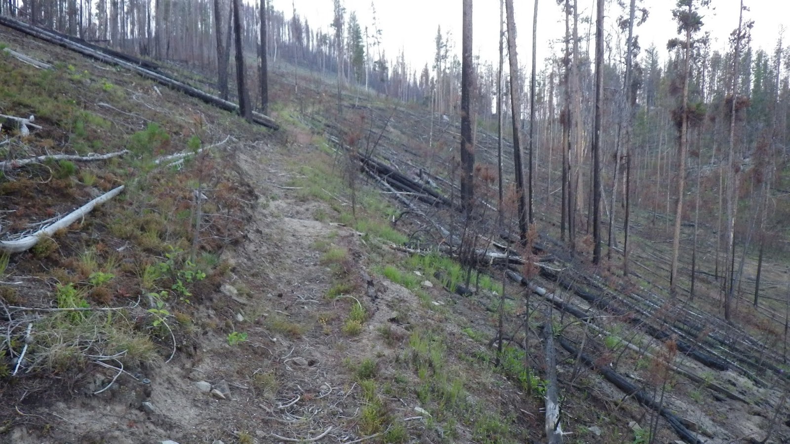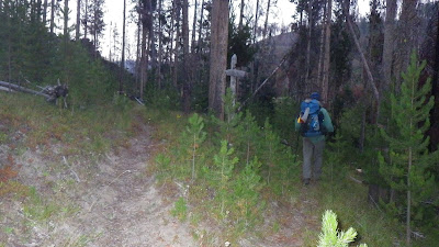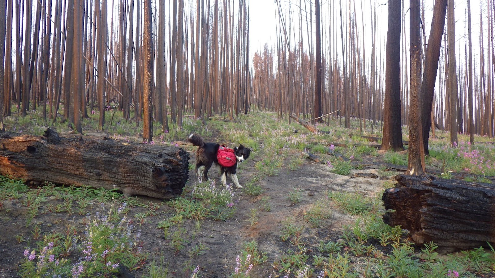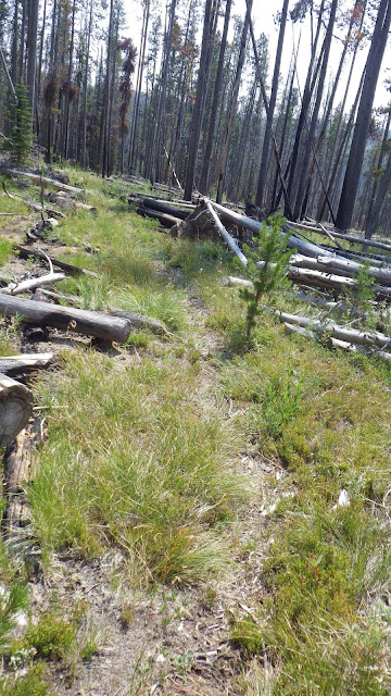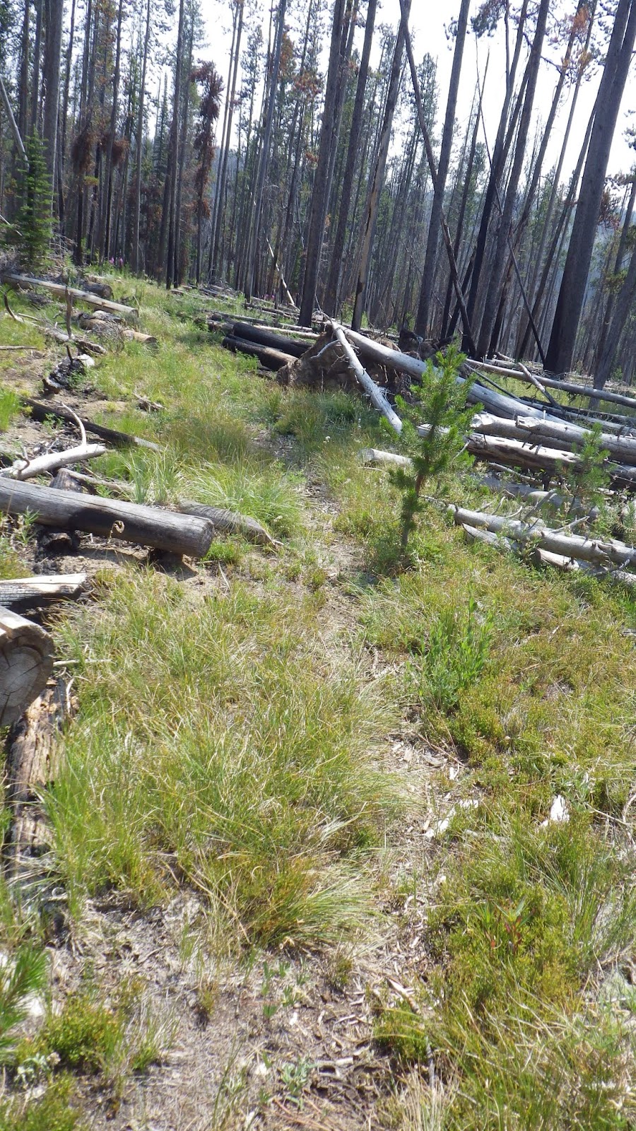 The trail made a wide curve to the left, and I could see it making another turn, along with some more uphill, ahead to the right. The ground here was all burned and ashy. Perfect for digging the hole that my body was telling me to get to work on. So I walked to the turn and dropped my pack by a tree so Ambrose would know I had stopped. Then I walked off trail and go to work.