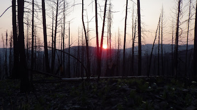 I enjoyed pushing myself to a fast pace going up. I heard when Bill and Mike caught up to Ambrose and they caught up to me as well. We stopped near the top of the summit to wait for Ambrose to catch up. The sun arrived before he did, peaking over the facing ridge with a reddish glow from smoke in the atmosphere.