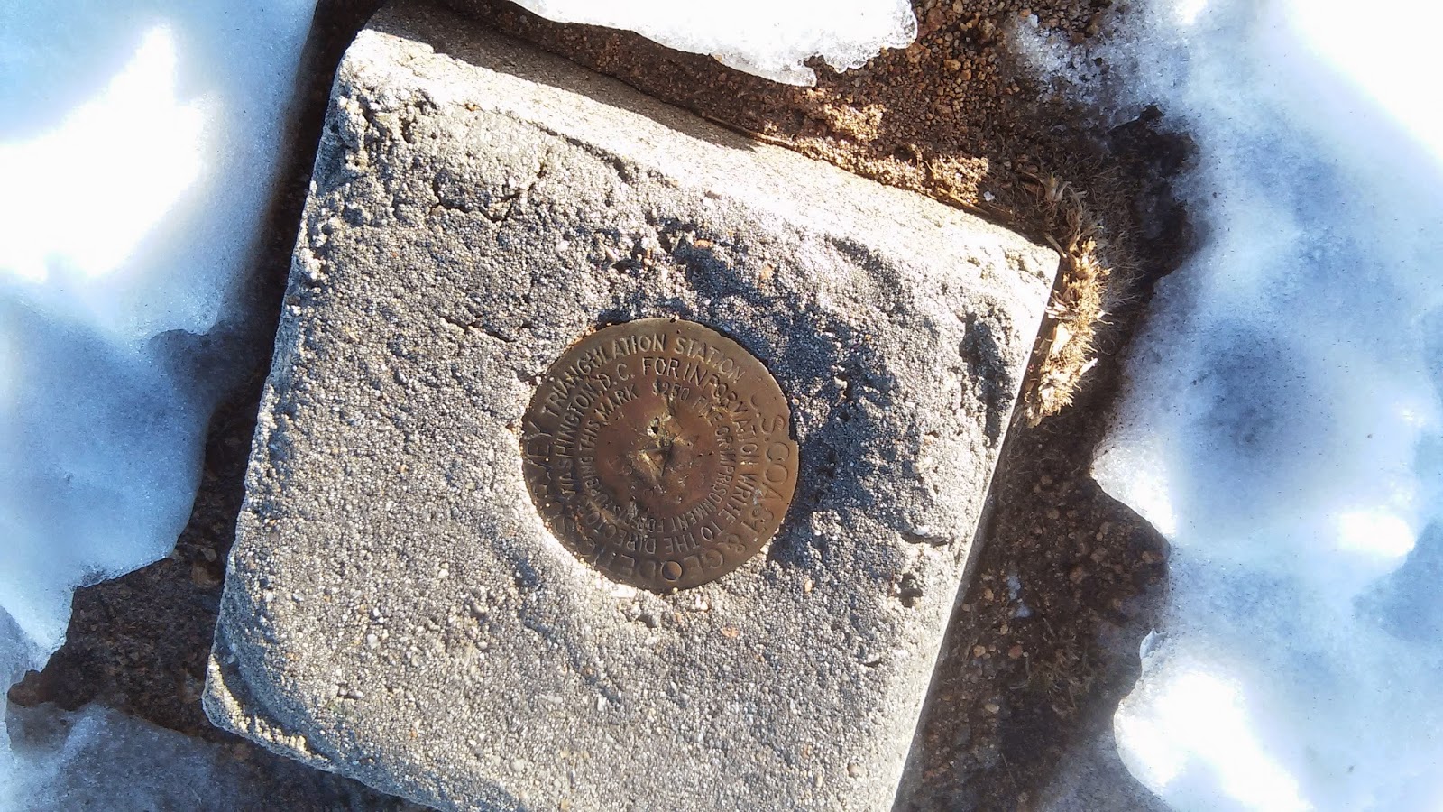 After confirming its toilet nature, and the fact that the door was unlocked, I kept on to the peak. I took a couple pictures of the benchmark and ate a peanut bar. Then I headed back down, because I wanted to get down before the trail thawed too much. I’d made it before 10am, which was my bare minimum goal.
