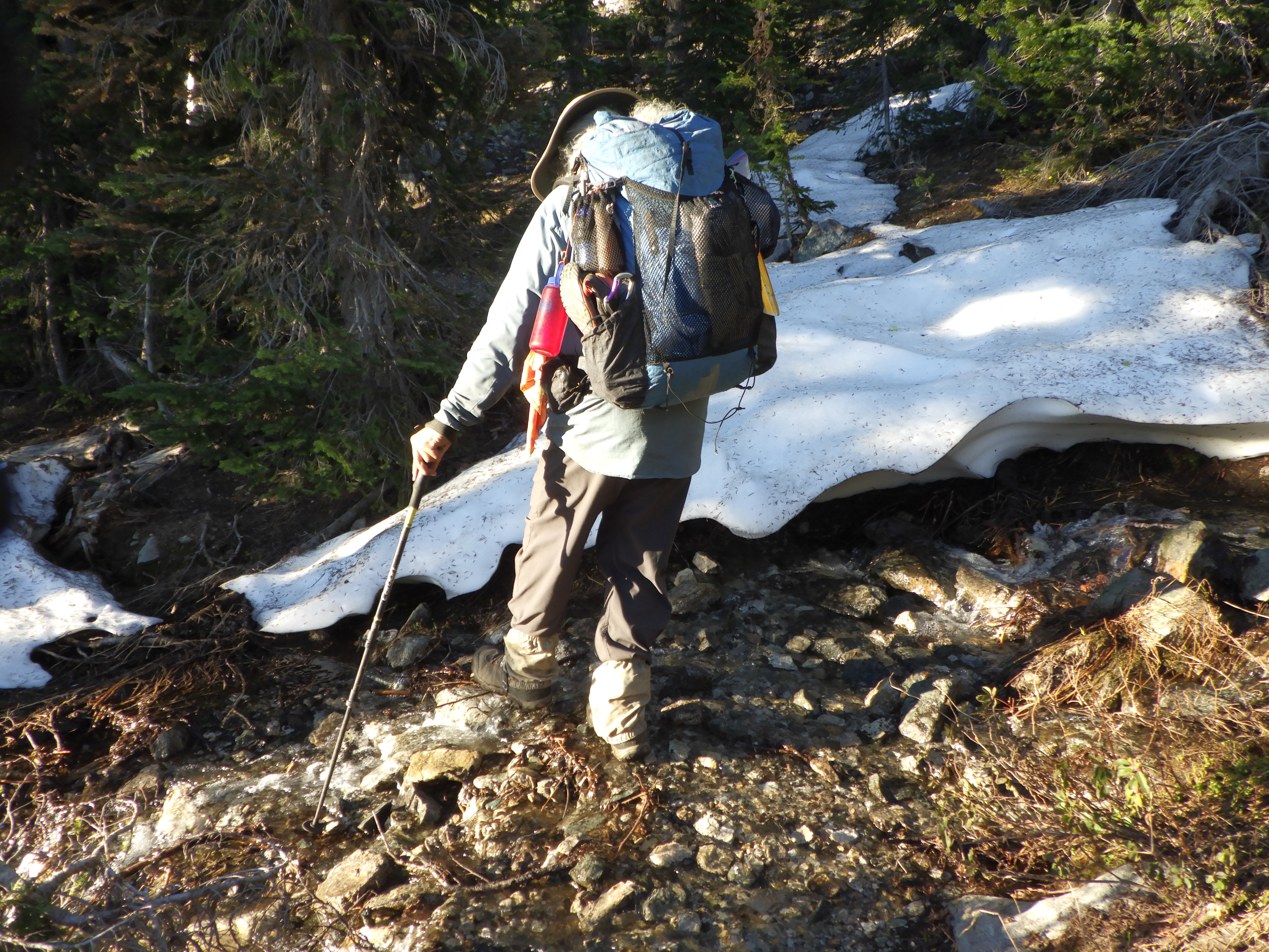 Ambrose also led through the snow. In fact, he led most of the day’s hiking. In part, because I wanted to know where he was, and because he was hiking fast enough that I didn’t mind hiking behind him. But the snow was the part where I needed him in front, because the trail he had blazed through the snow two days prior was totally melted.