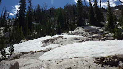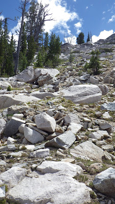 Once we crossed the outlet of Plummer lake, Ambrose took the lead, since he was the one who had read about the route to the peak. We hadn’t gone far before we ran into a horde of mosquitoes and had to stop for emergency bug juice application. I still got bit. I think I had more mosquito bites, more injuries on this trip than any other so far. I had one bite on my right ankle, one on my left calf, another on my right hip and another on the top of my head. Those first three got rubbed with every step when I wore a pack.