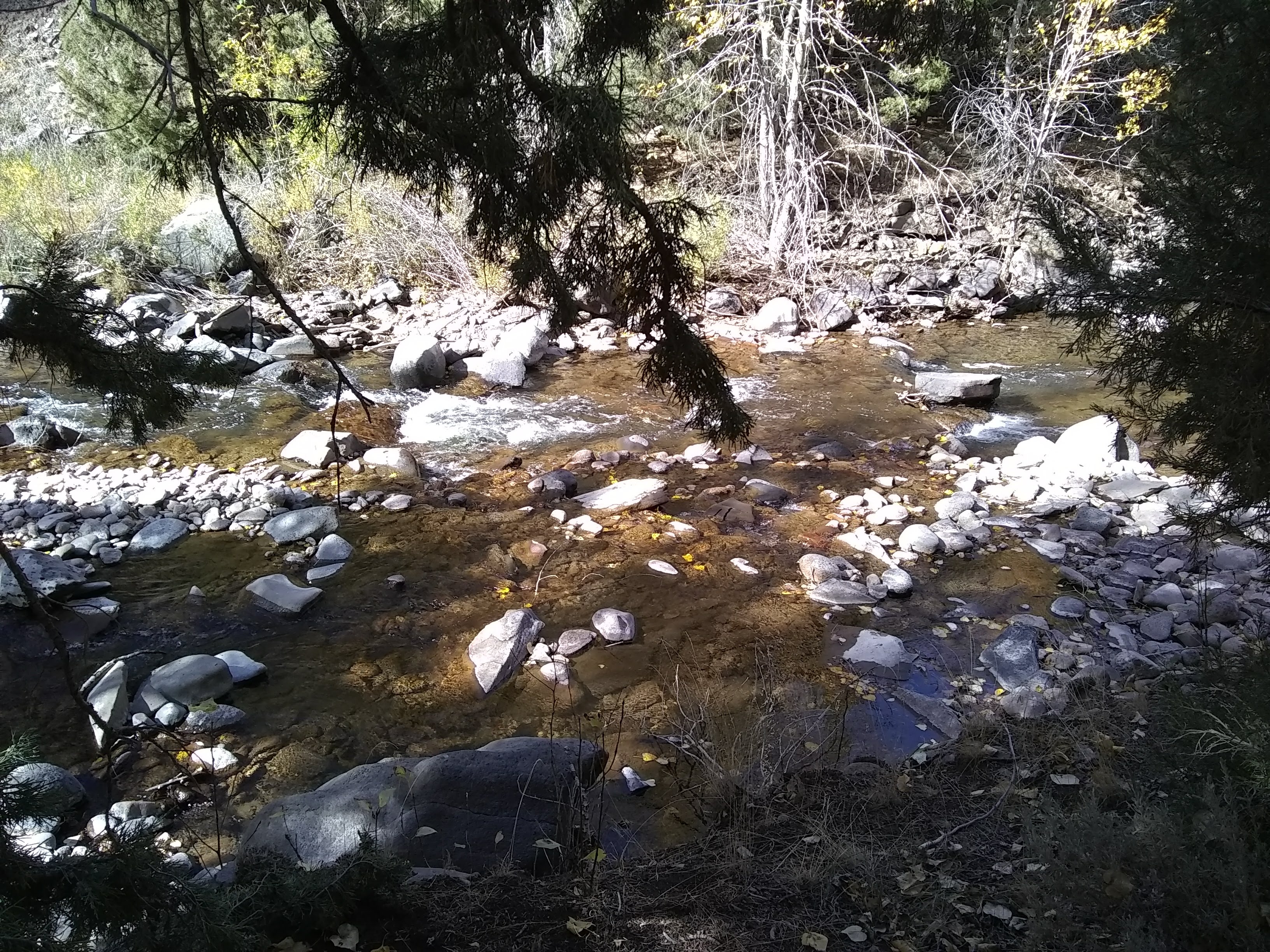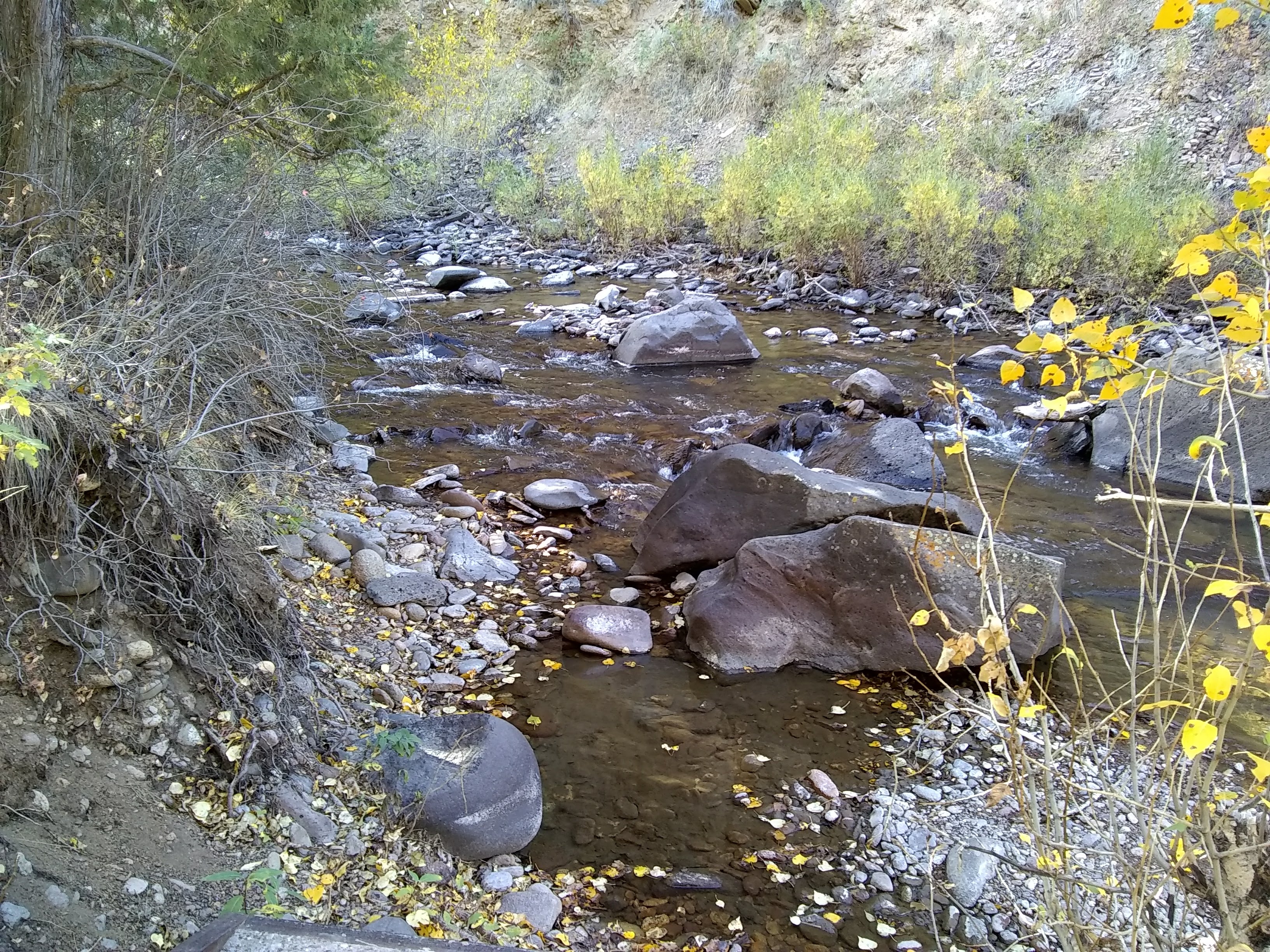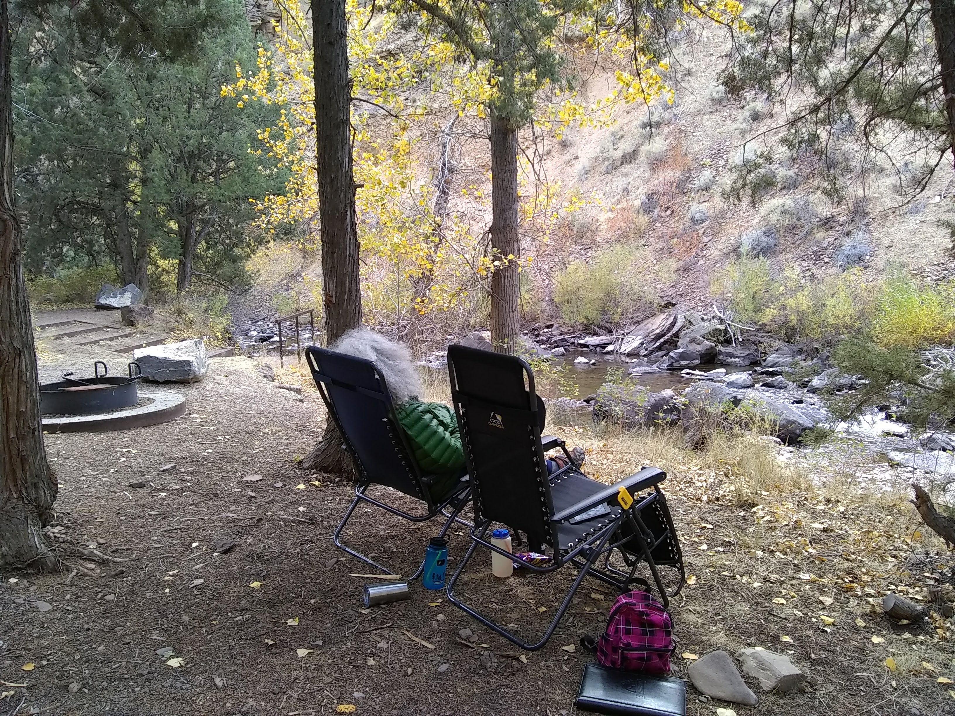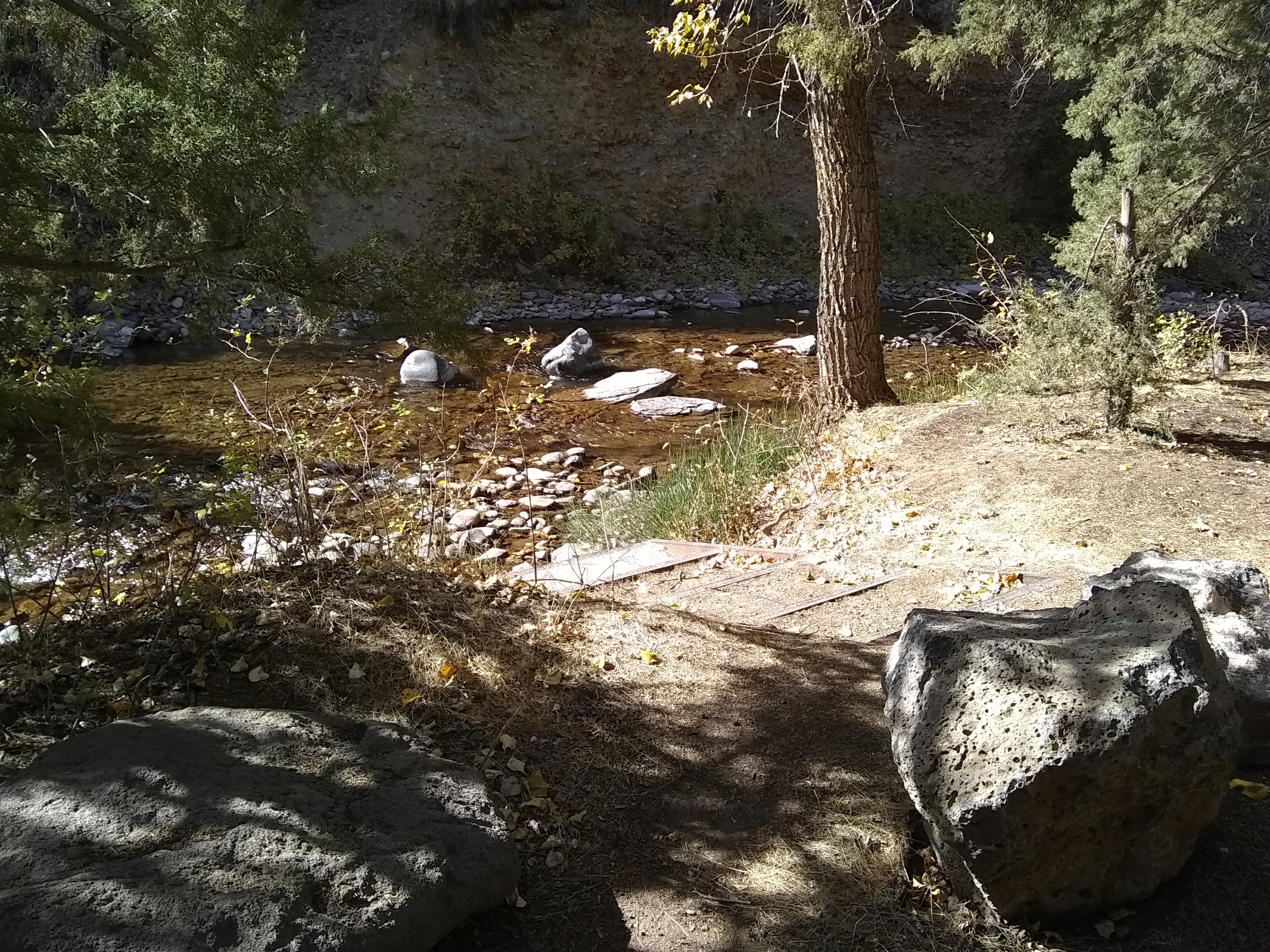 Well, the hot springs are closed for Covid-19 – not an unexpected outcome. But there were a few BLM campsites available, and we chose Juniper Grove. The campsite was quite windy when we arrived near lunch, but also lovely. The East Fork Jarbridge River flowed by right next to the site, close enough to hear the water burbling over rocks. And we had the site mostly to ourselves at this time of year.