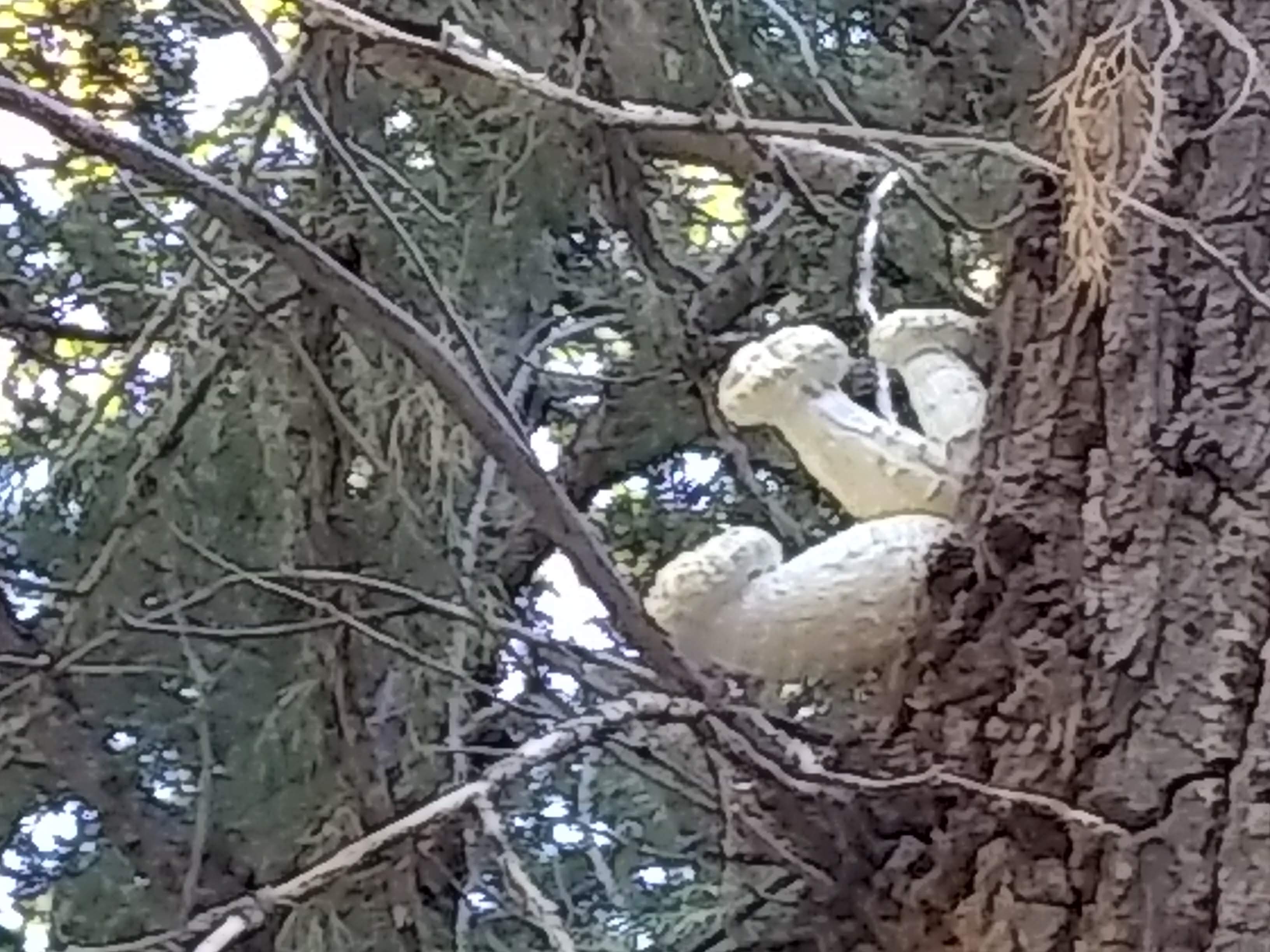 | What curious mushrooms, bursting from the trunk of the juniper. |