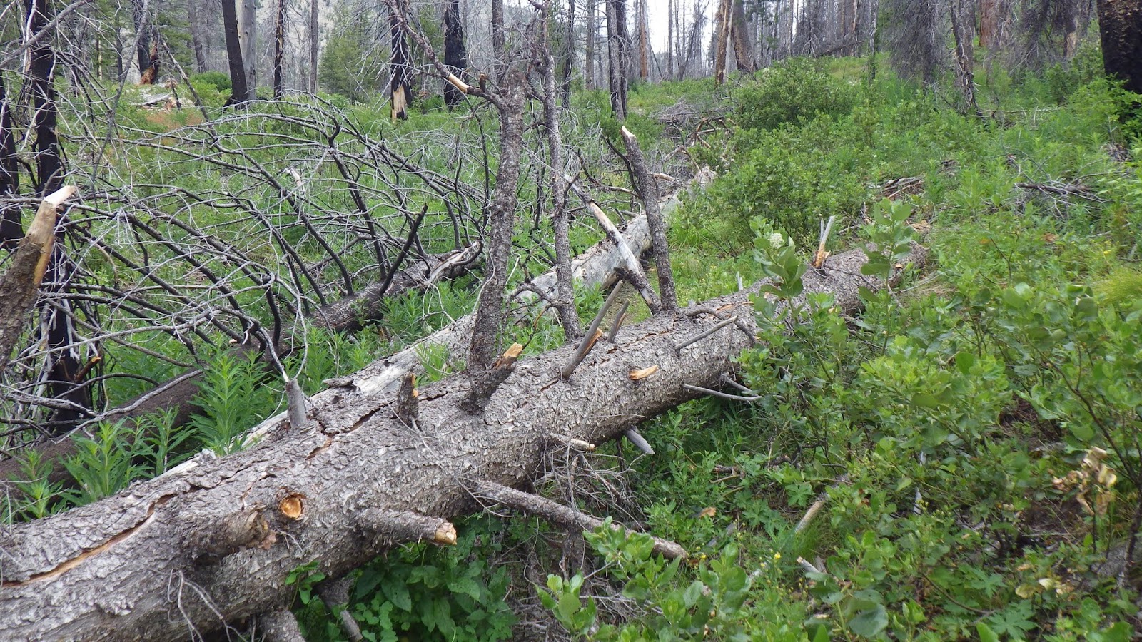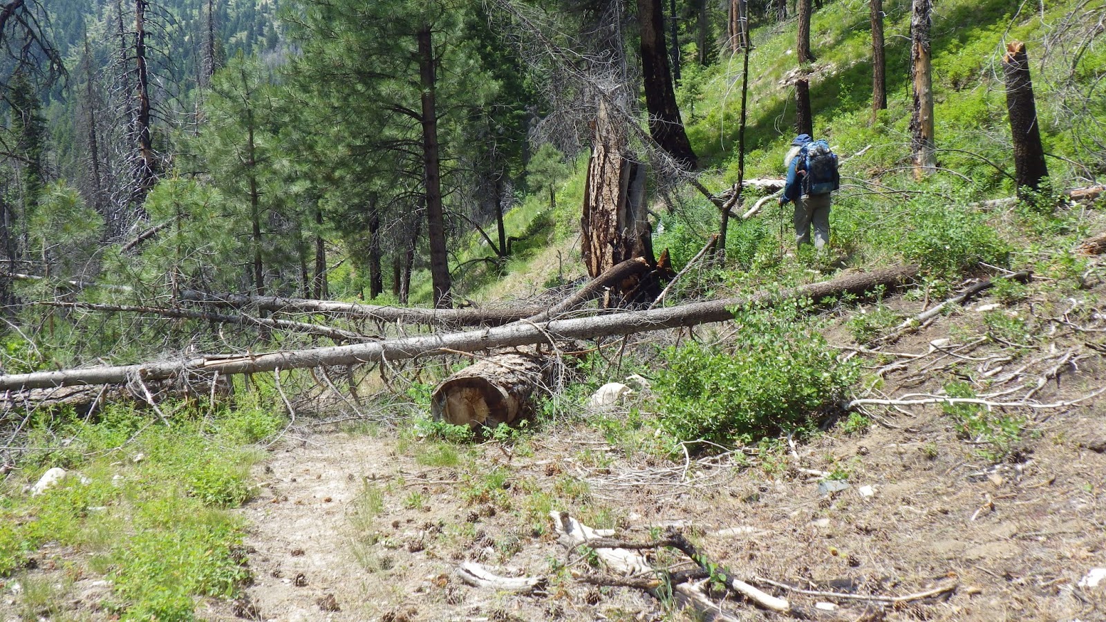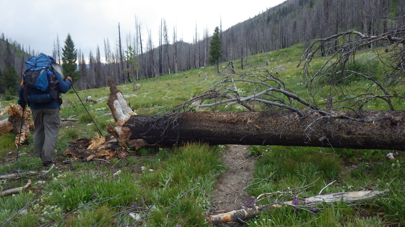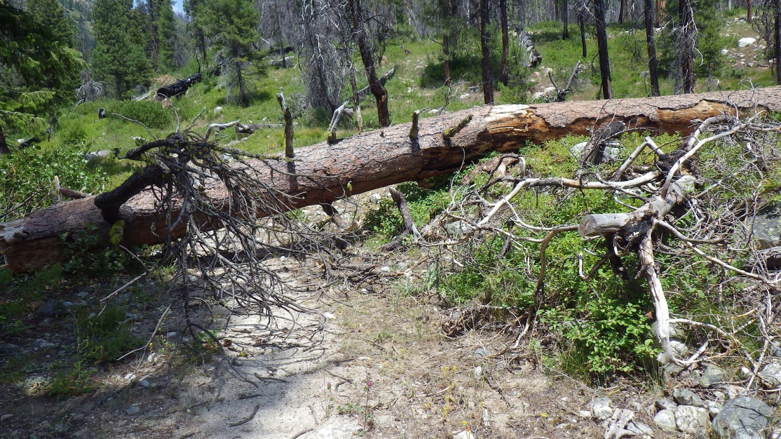 | This is probably the worst section of the trail that we traversed for downed trees across the trail. |