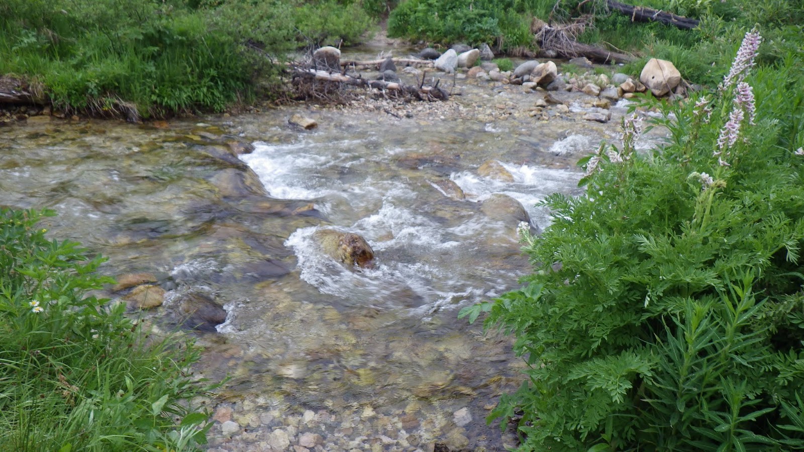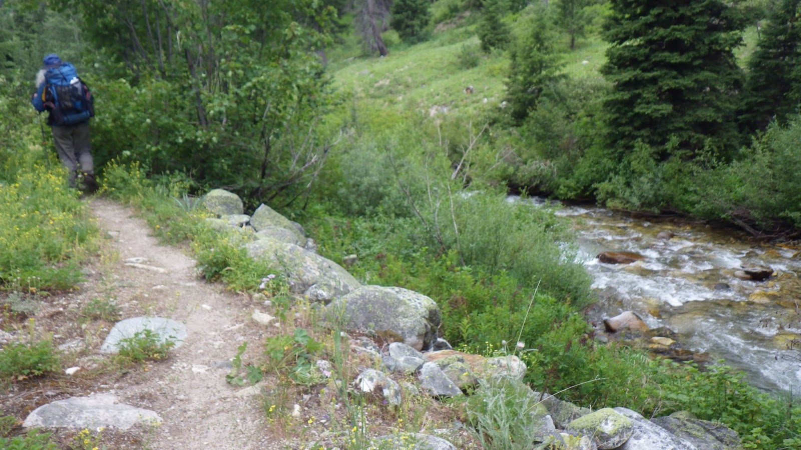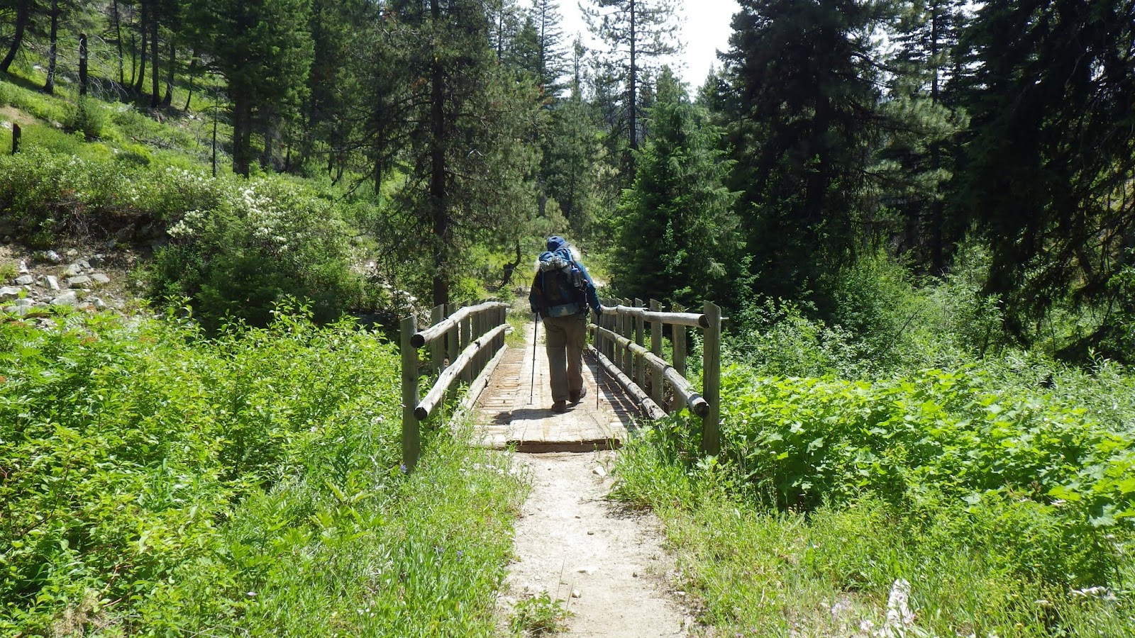As we sat and ate, a large group of hikers came up behind us and got ready to cross. Ambrose chatted with one of the men, who said they had come down from Johnson Lake that day after a trip in which they hiked up to Scenic Lake, then went across country to Browns Lake, then traversed around from Browns Lake to High Pass, then down to Johnson Lake. They were going to go to Pats Lake, but decided against it and visited The Hole (a lake above Johnson) instead.