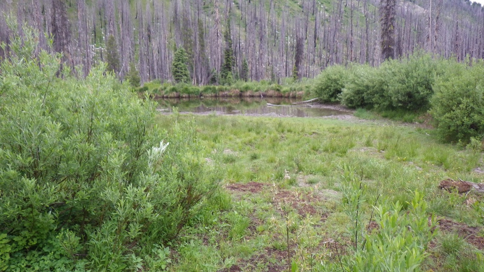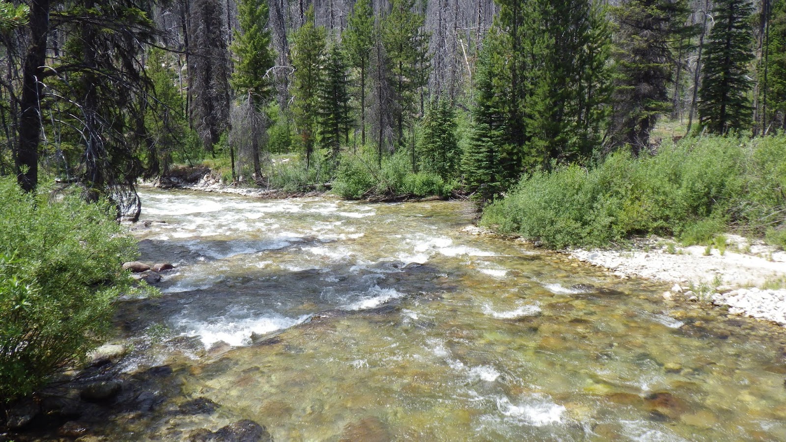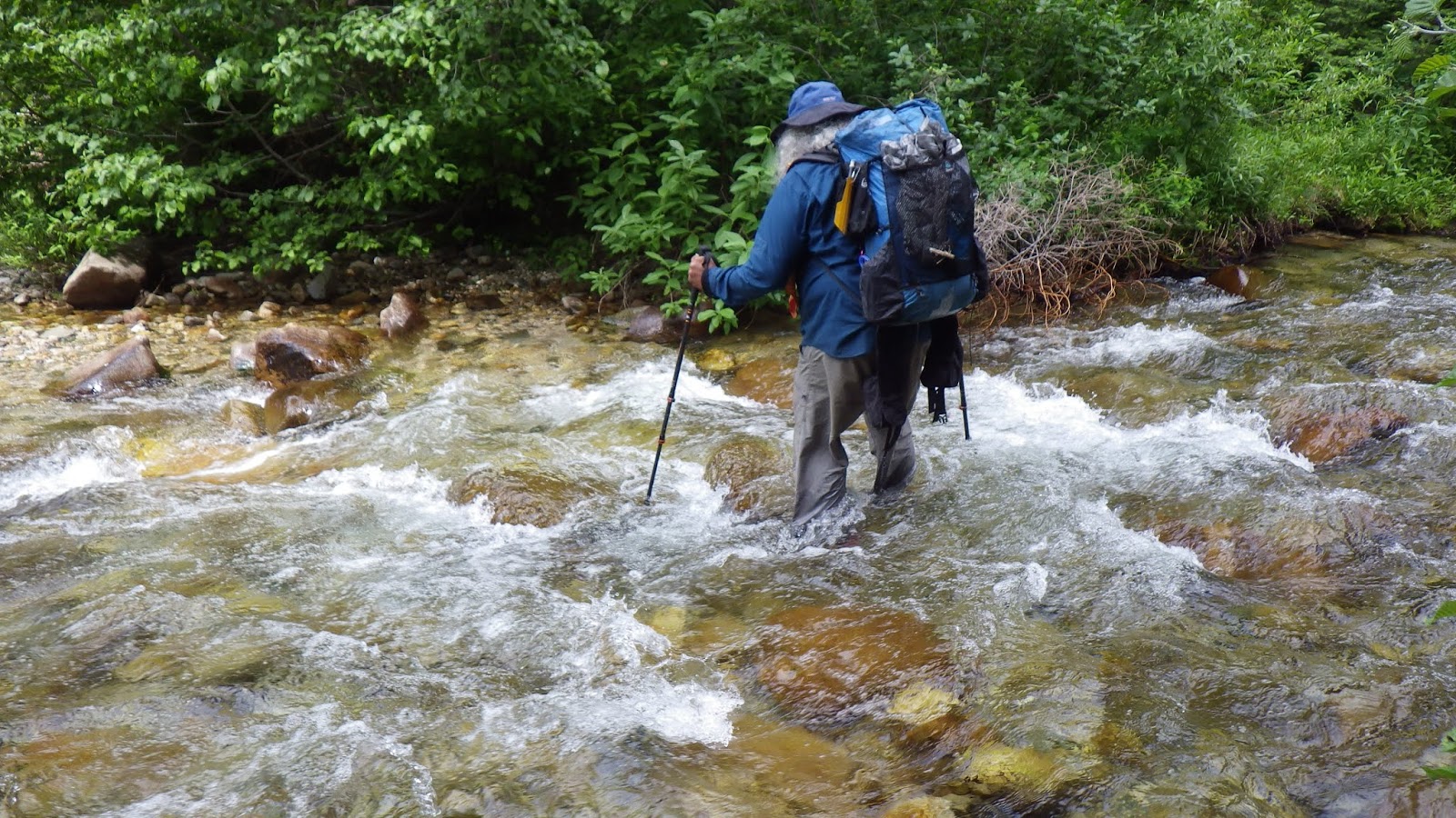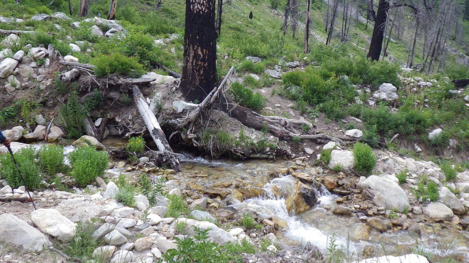As we sat and ate, a large group of hikers came up behind us and got ready to cross. Ambrose chatted with one of the men, who said they had come down from Johnson Lake that day after a trip in which they hiked up to Scenic Lake, then went across country to Browns Lake, then traversed around from Browns Lake to High Pass, then down to Johnson Lake. They were going to go to Pats Lake, but decided against it and visited The Hole (a lake above Johnson) instead.