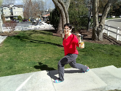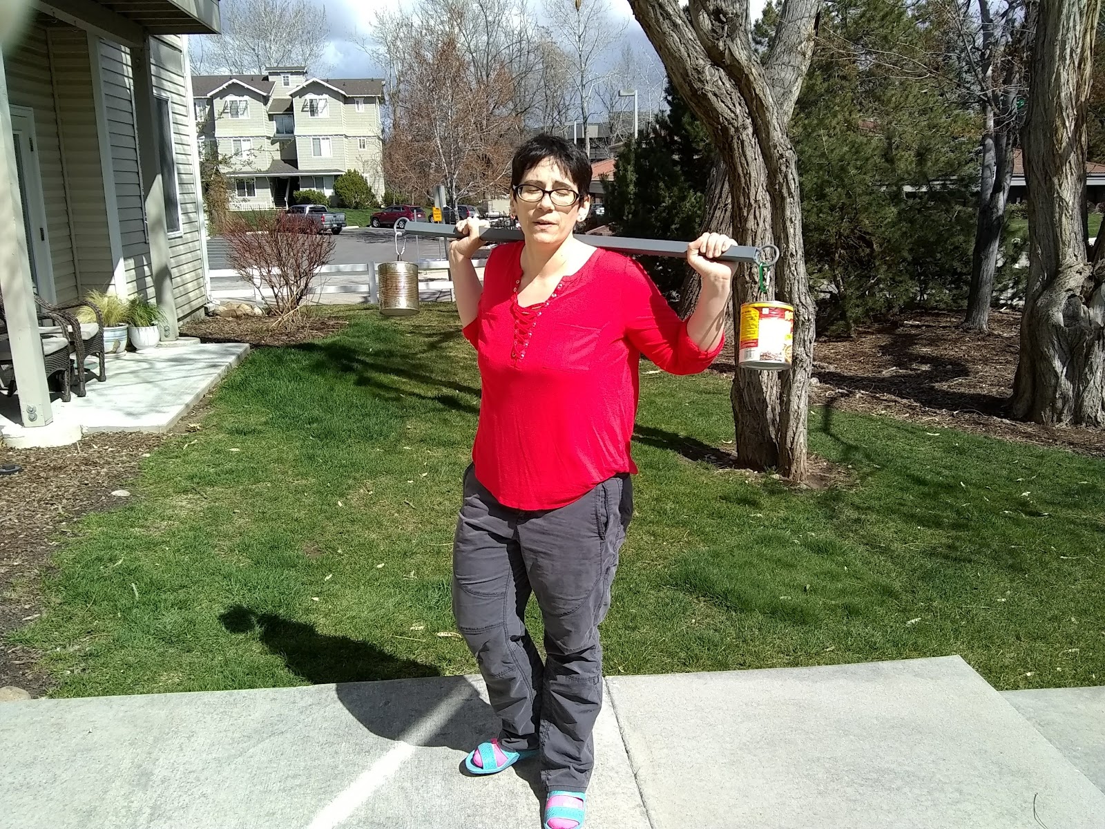 Now, I don’t have a barbell. But I do have this thingy. It’s a bar, kind of heavy, and it has some rings on the ends that allow me to attach my homemade weights (or any weights that I can get a caribiner on).