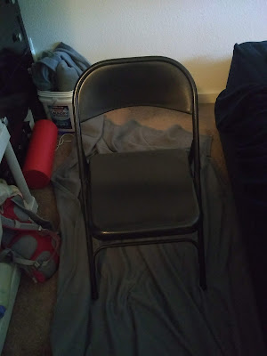 Of course, no magic can happen with that rolling chair in the way. It gets moved to a different location and the blanket is put on the carpet to prevent rug burn – yes, I have gotten rug burn from working out on carpet before, no fun!