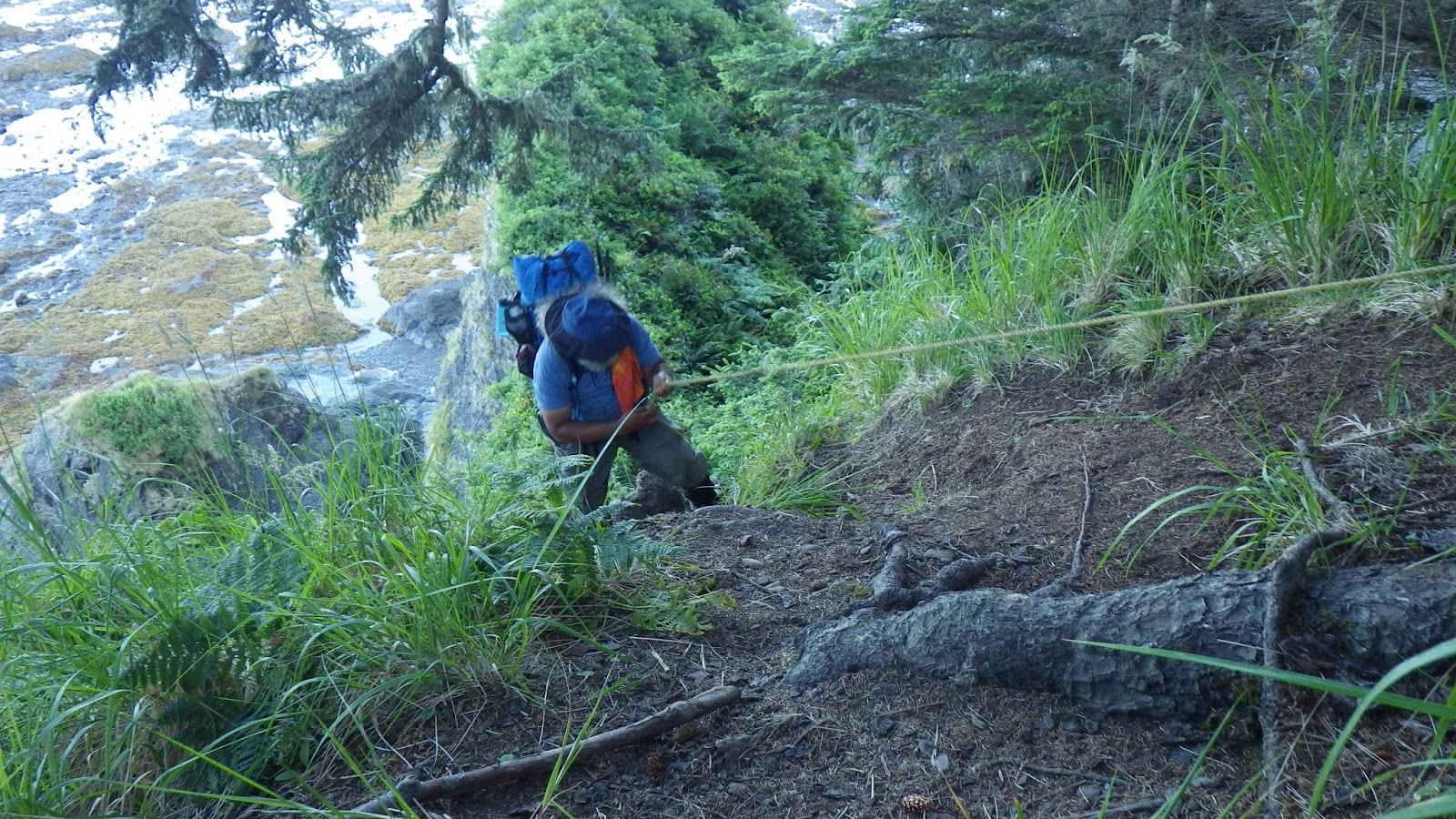 | Ambrose coming up an overland trail near Wedding Rocks. |