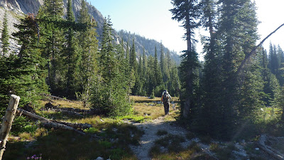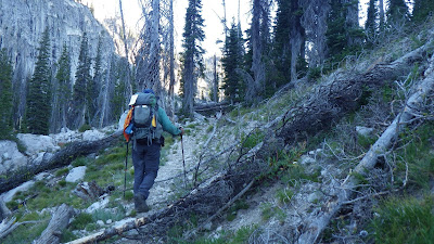 We took the trekking poles off the tent and weighted it down with rocks so both Ambrose and I could have poles for the short hike. Also, we left my pack behind. Ambrose carried all our day hike gear. |