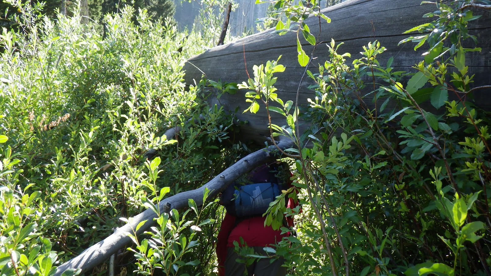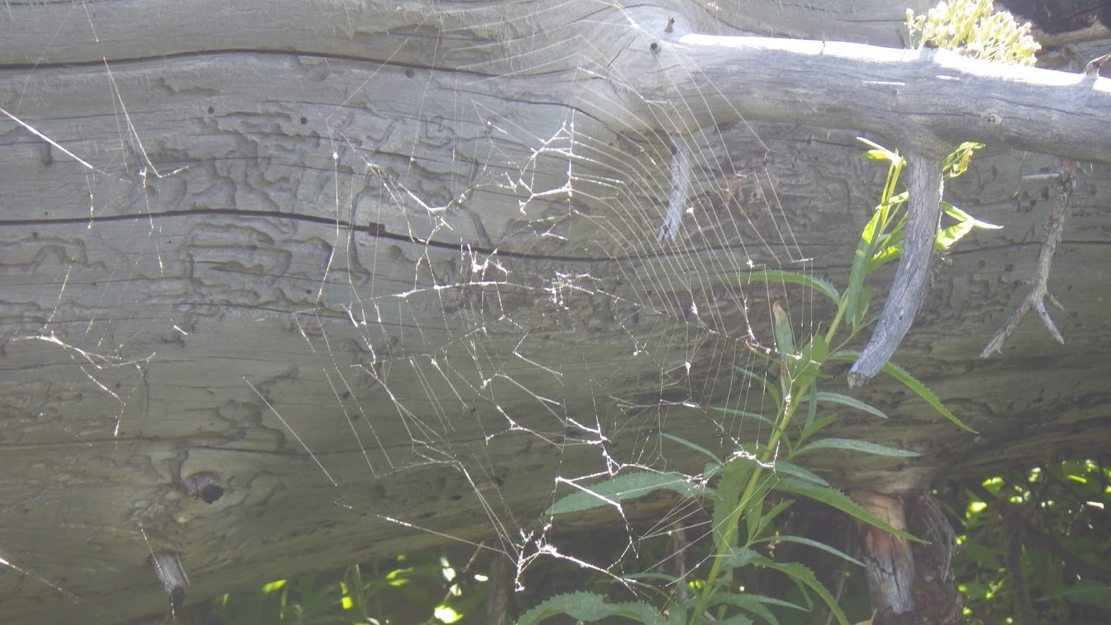| The fallen tree trend continued up the switchbacks. At several places, we followed go-arounds, but this tree, featuring a magnificent spider web, stumped me. I tried going around it and ran into thick brush, so I sat on a rock and waited for Ambrose to catch up so we could find the trail together. And, as he walked up I glanced to my right and realized the go-around was in the opposite direction that I’d been looking for it. |