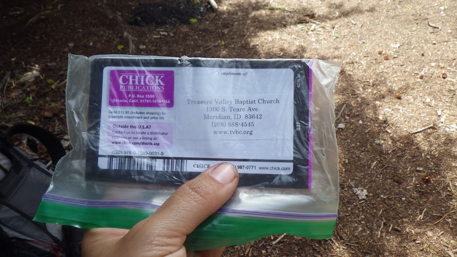 | Instead, it was a Chick Tract in a baggie. I really wish whoever was leaving these up at Pats Lake would stop. It’s not LNT to leave anything up there. |