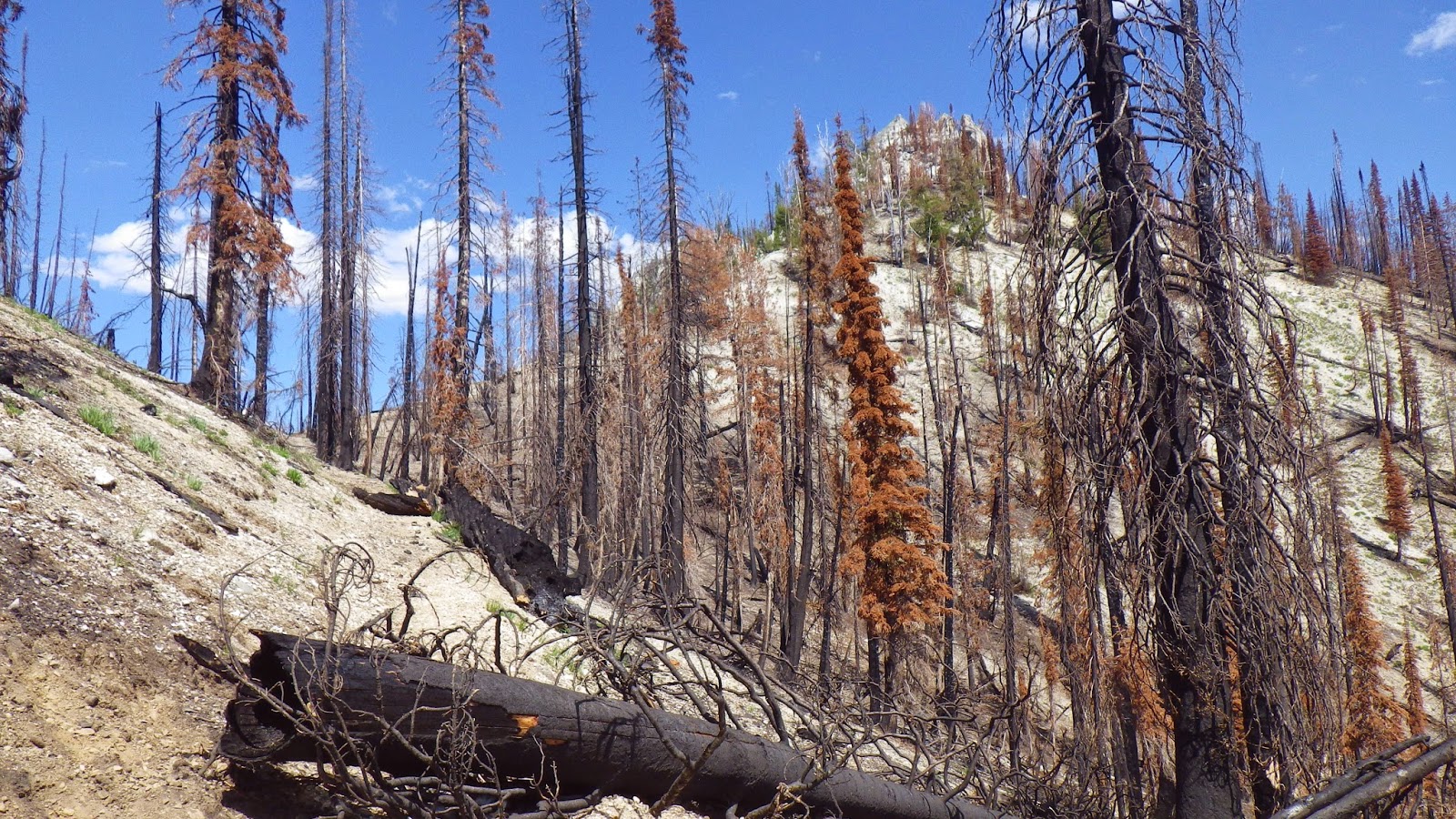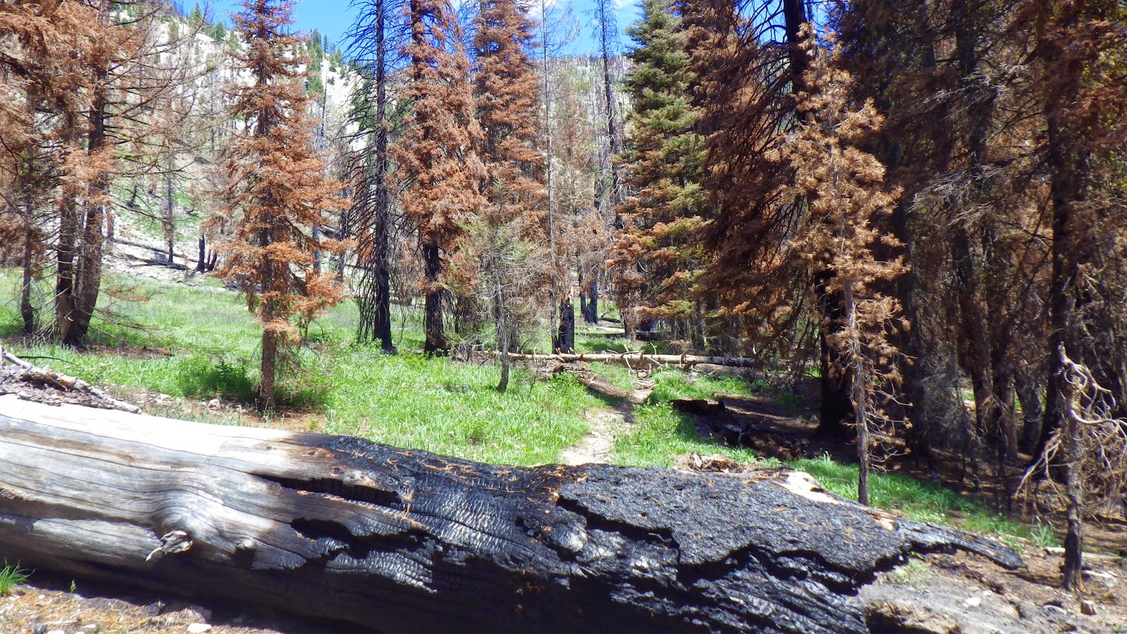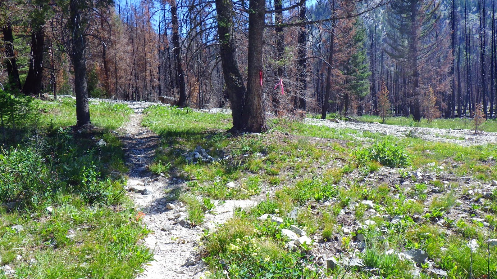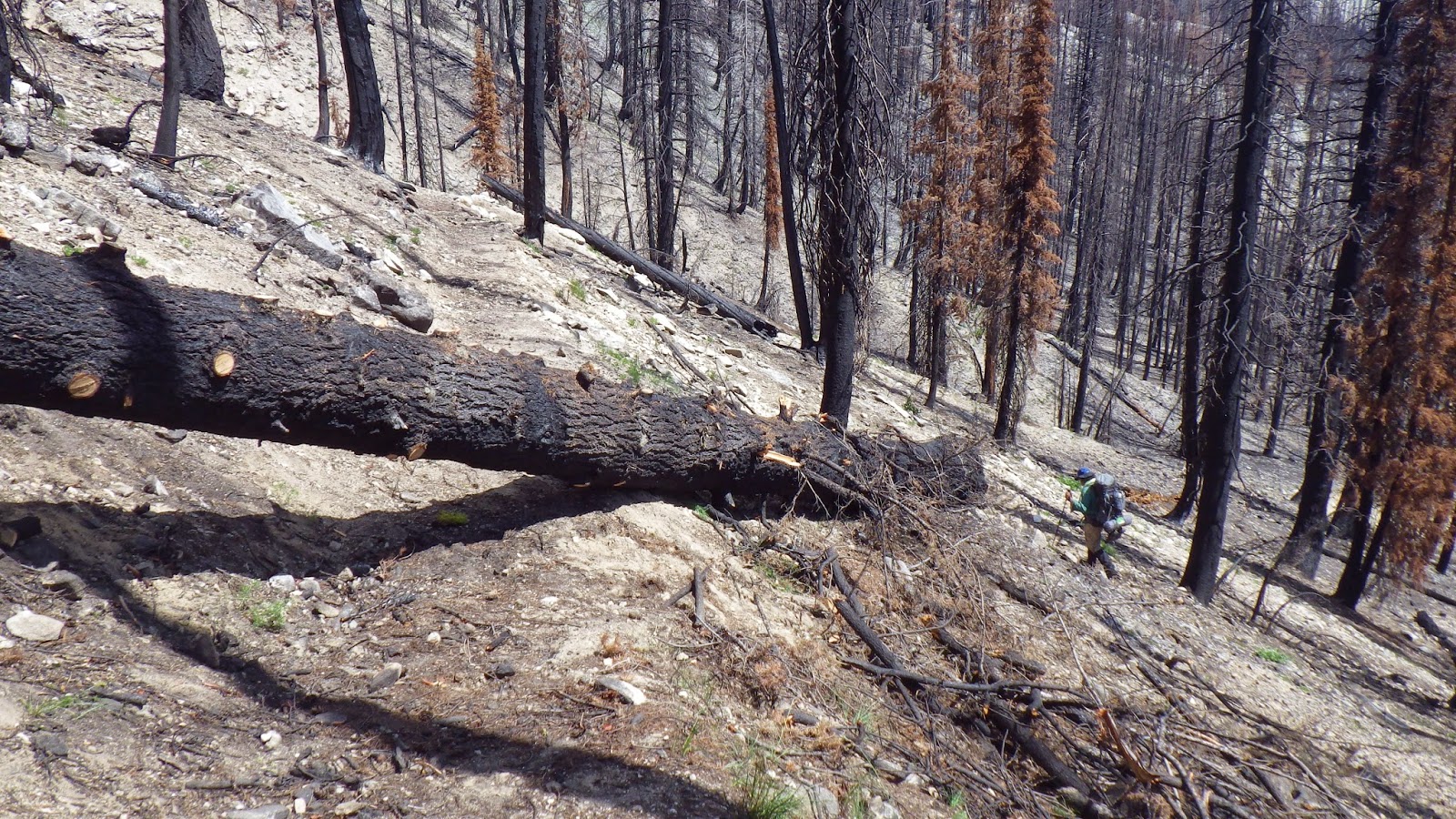 For the first time, we began to see trail markers. I had been beginning to think that the wilderness area didn’t have such things, but we saw blazes, cut logs and buried logs that helped us get through the burn where the trail didn’t always look like trail. Or when everything looks like trail…