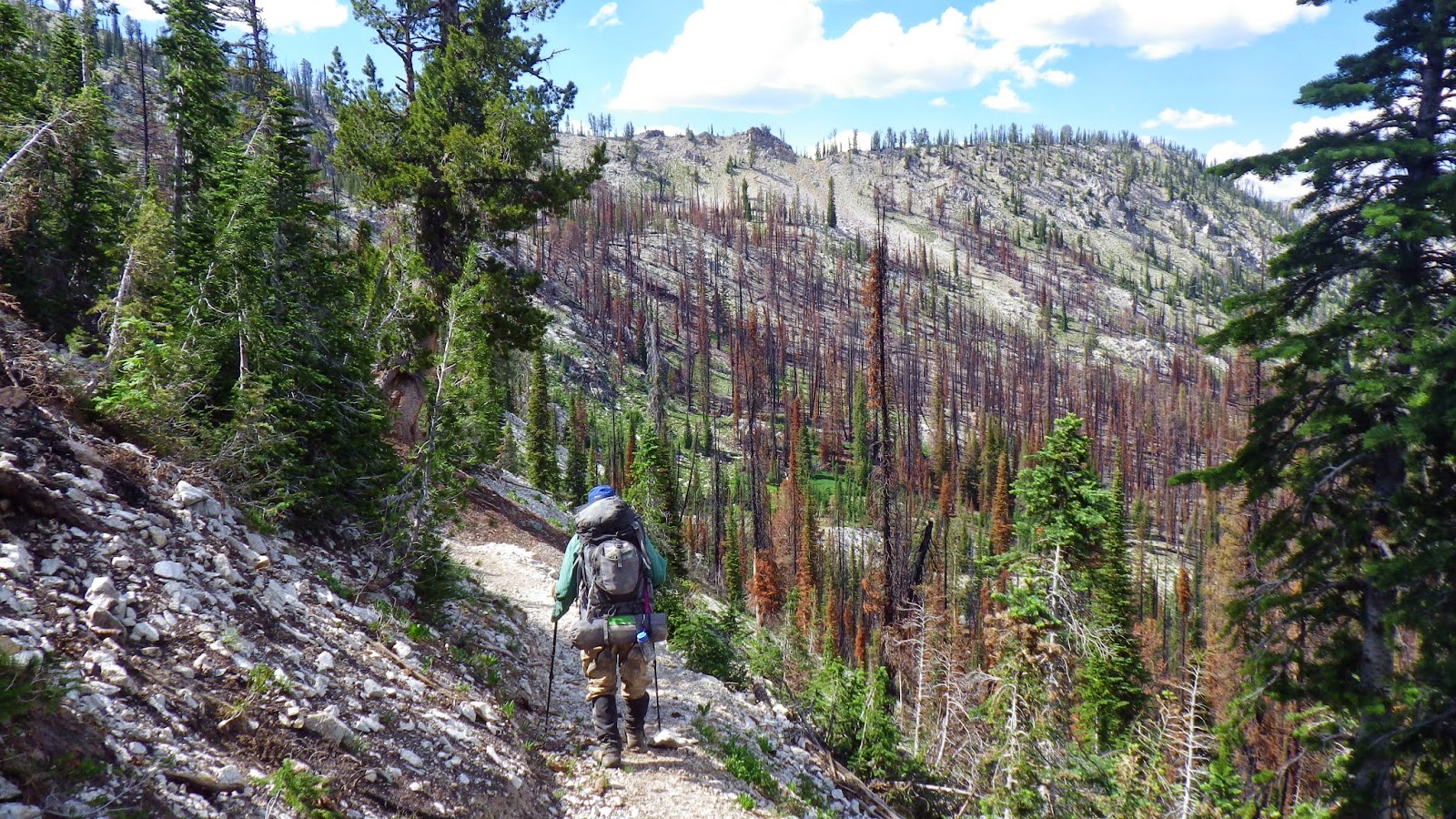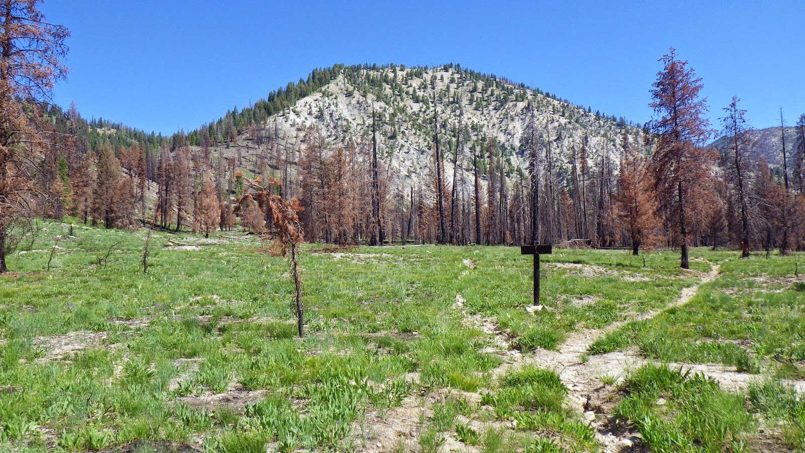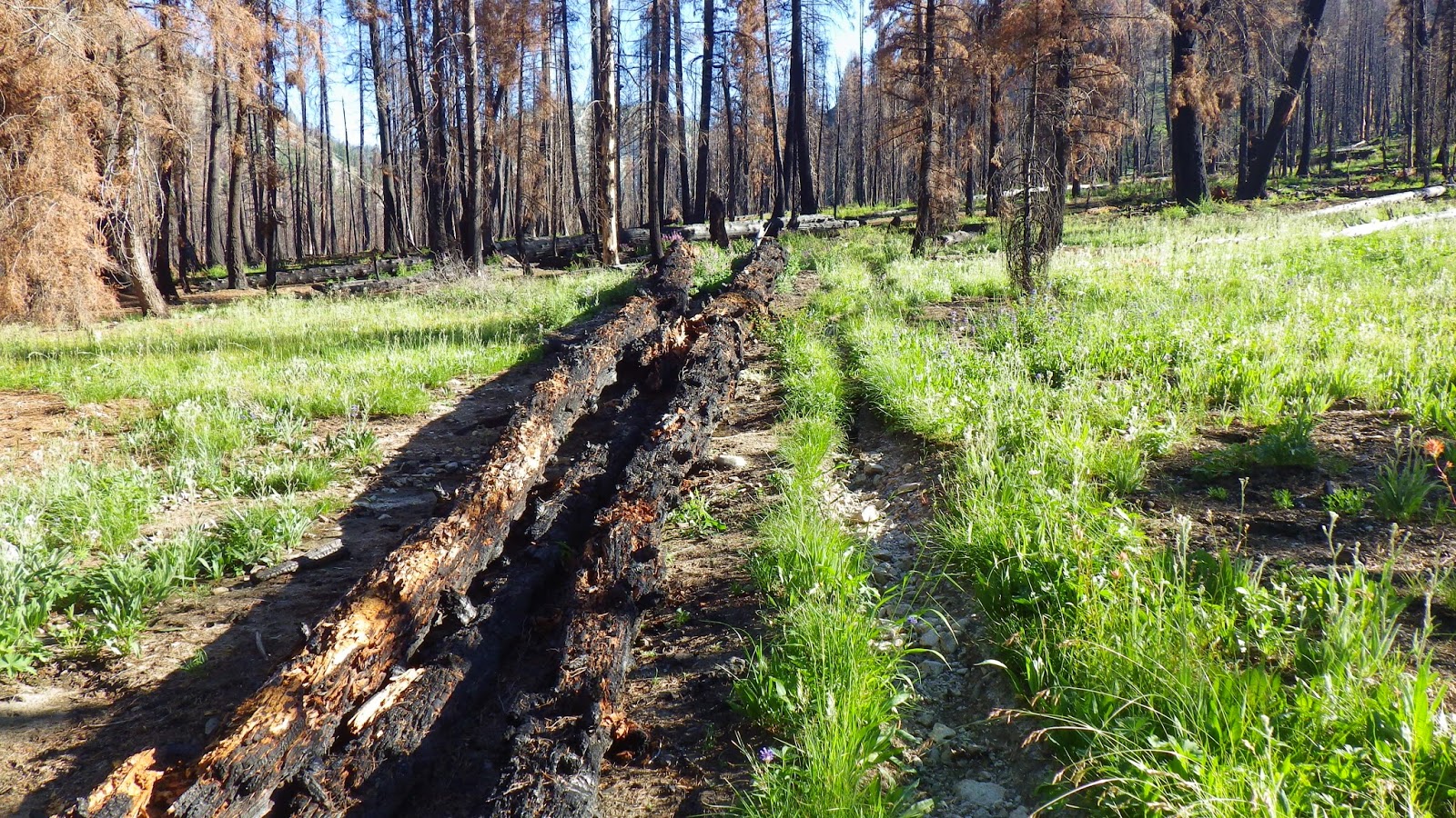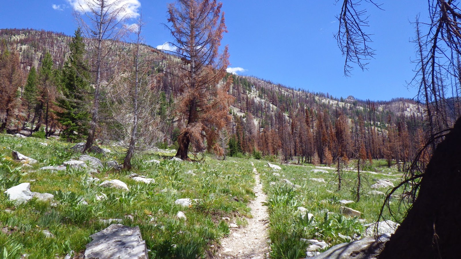 For the first time, we began to see trail markers. I had been beginning to think that the wilderness area didn’t have such things, but we saw blazes, cut logs and buried logs that helped us get through the burn where the trail didn’t always look like trail. Or when everything looks like trail…