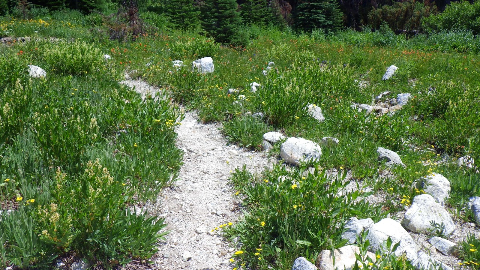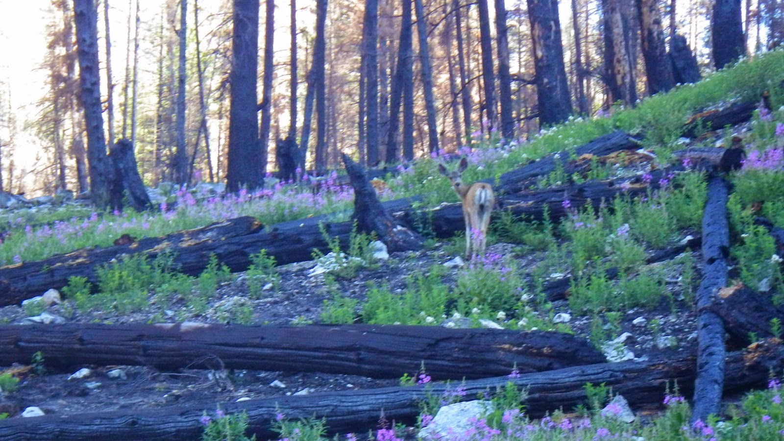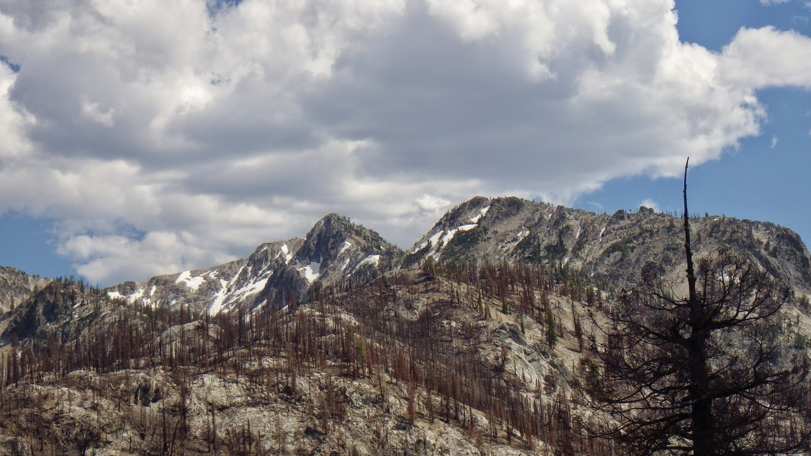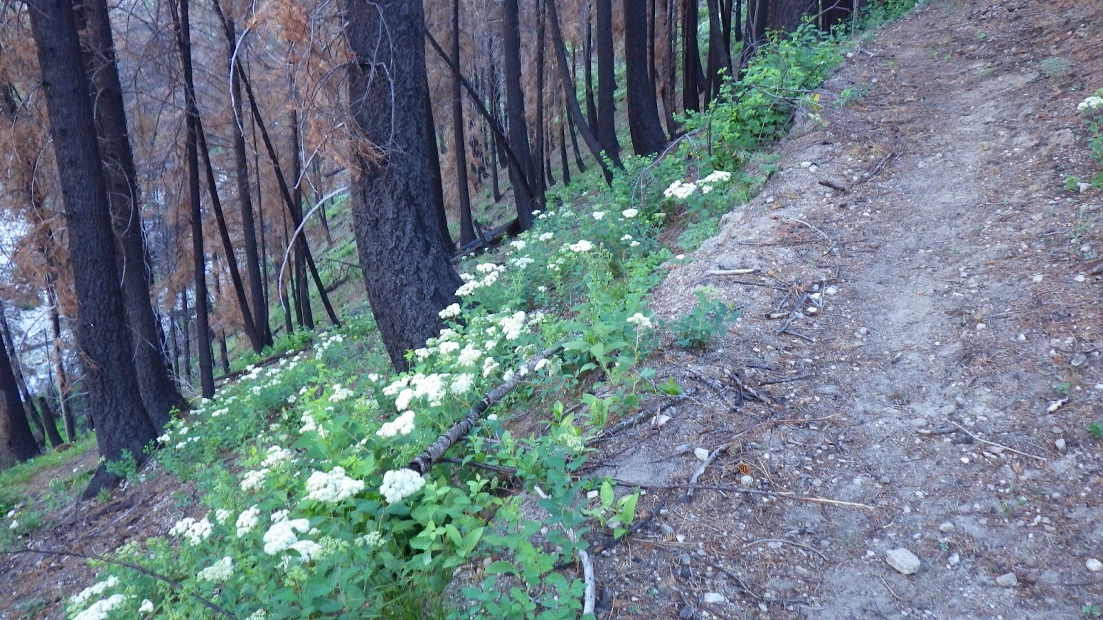 For the first time, we began to see trail markers. I had been beginning to think that the wilderness area didn’t have such things, but we saw blazes, cut logs and buried logs that helped us get through the burn where the trail didn’t always look like trail. Or when everything looks like trail…